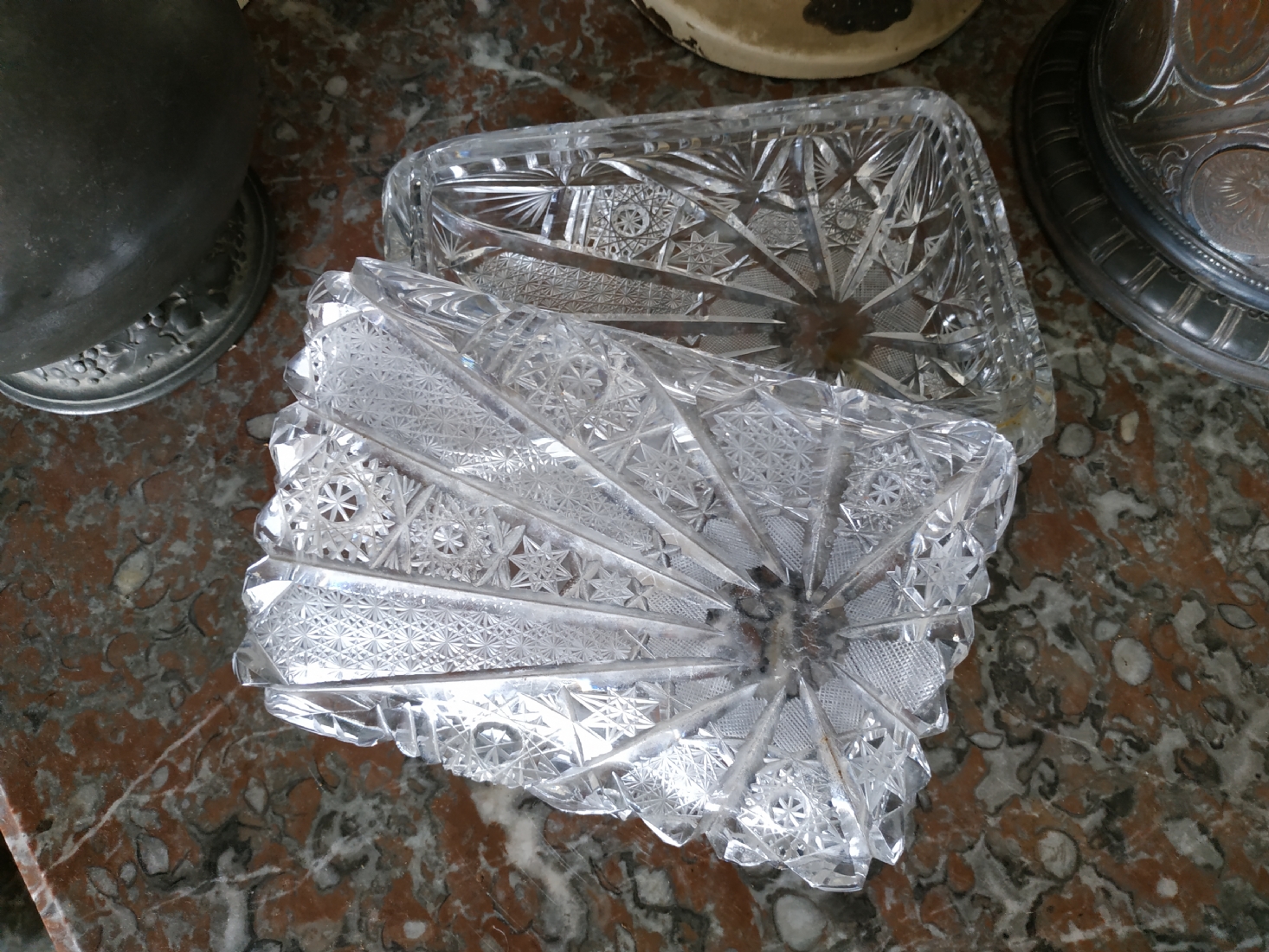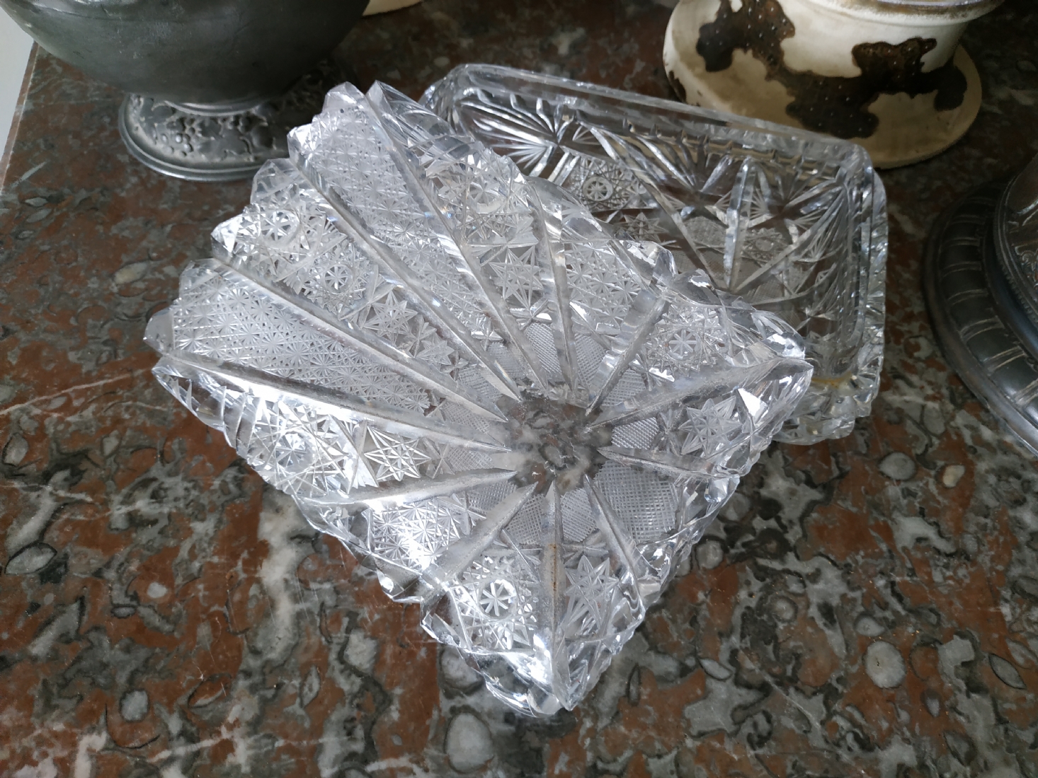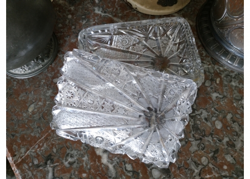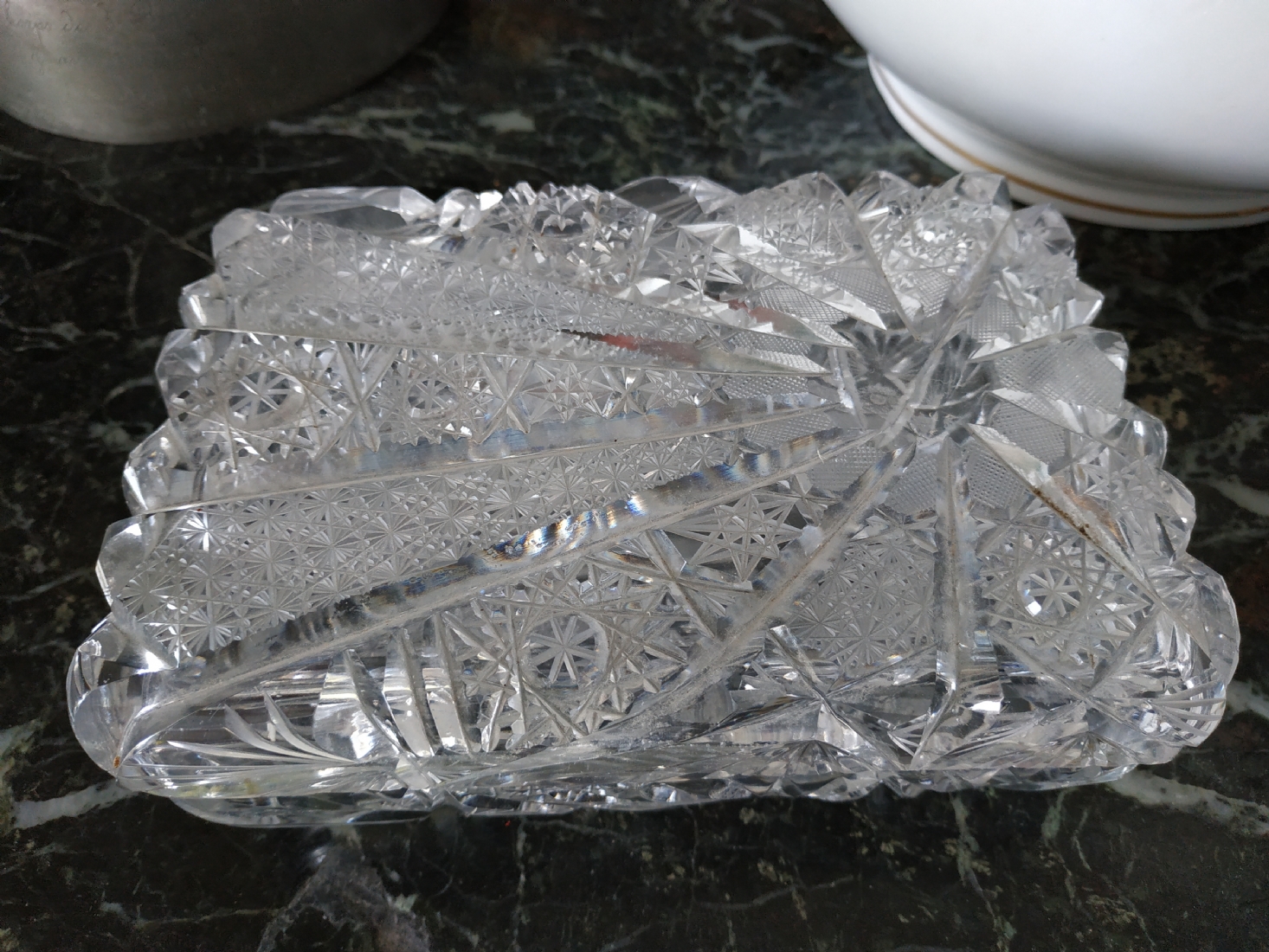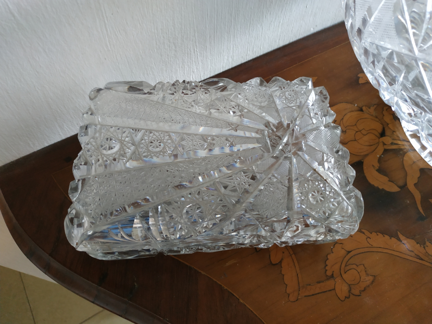 קופסאת קריסטל ישנה ואיכותית ומכסה תואם, ליטוש ידני, גובה: 7 ס"מ, מידות הבסיס: 11X17 ס"מ.