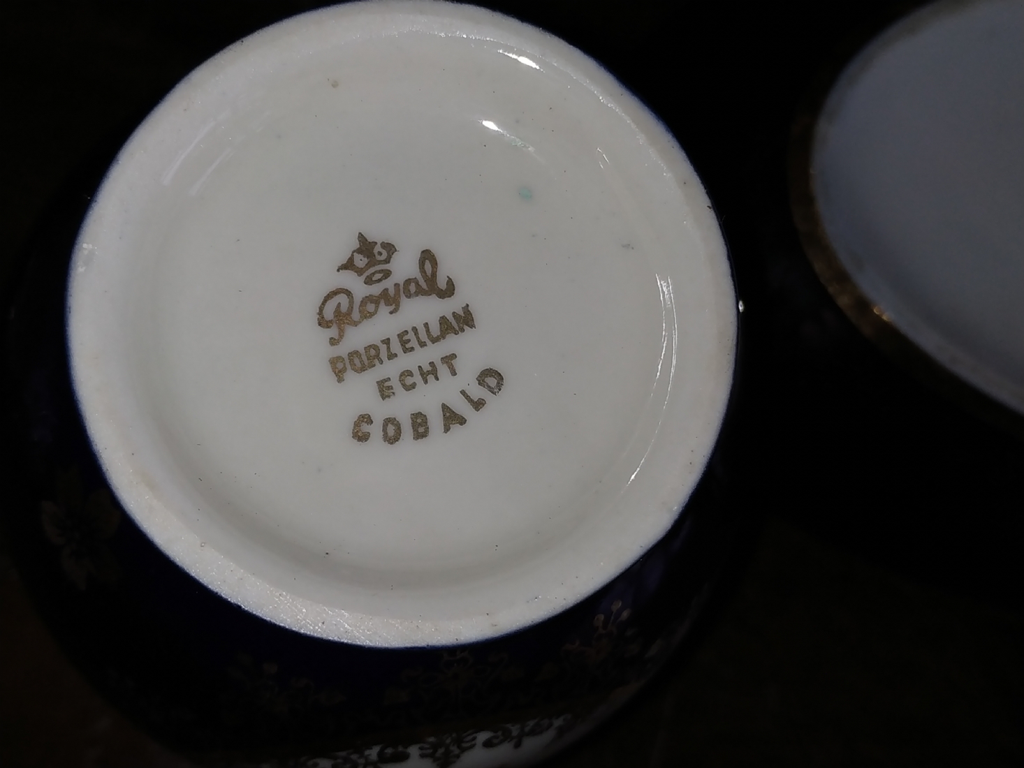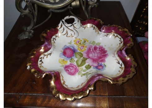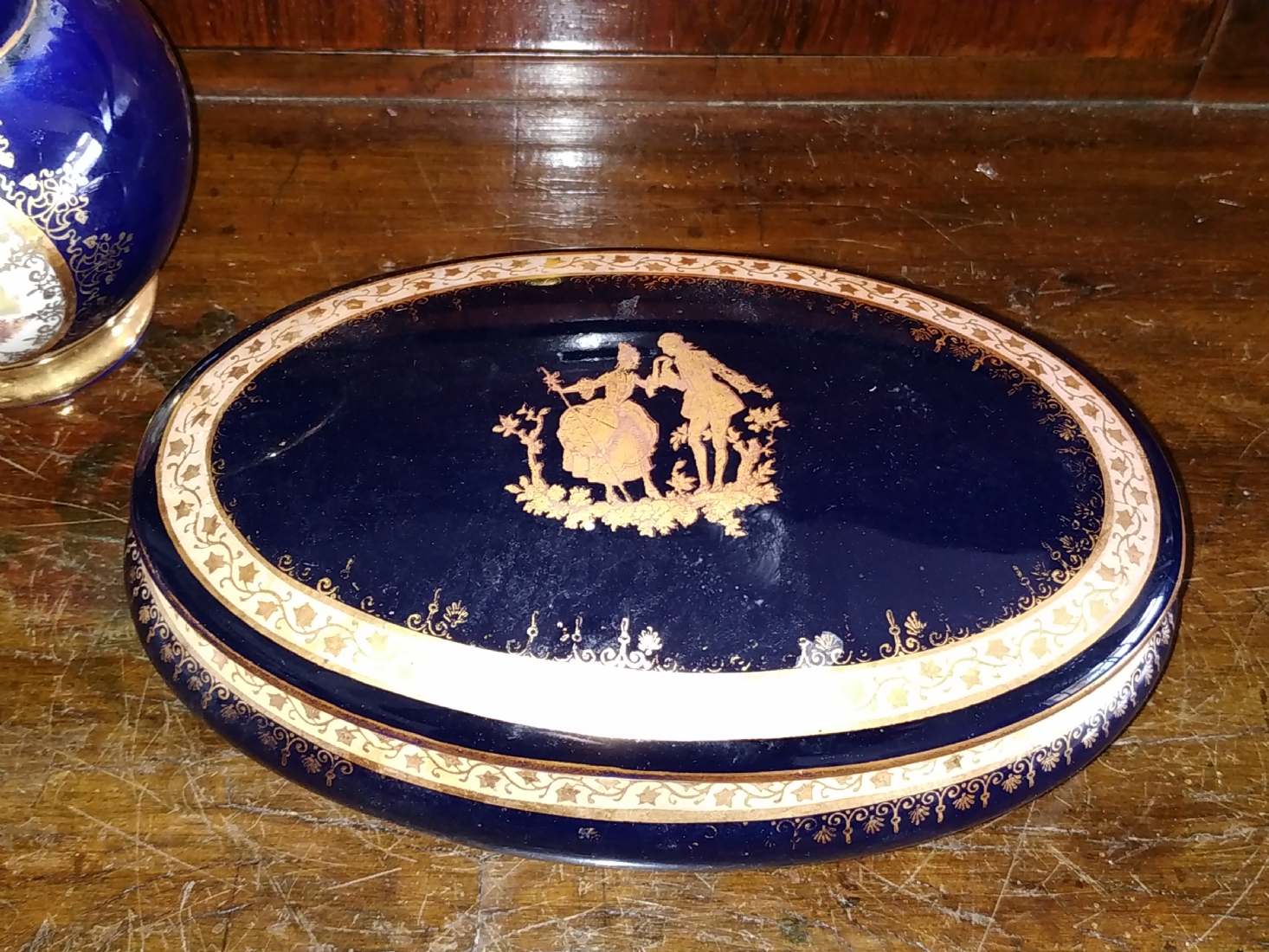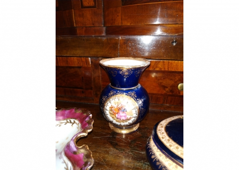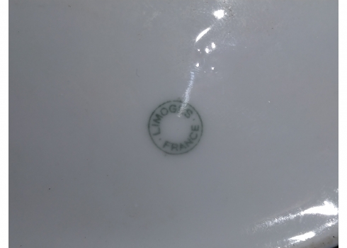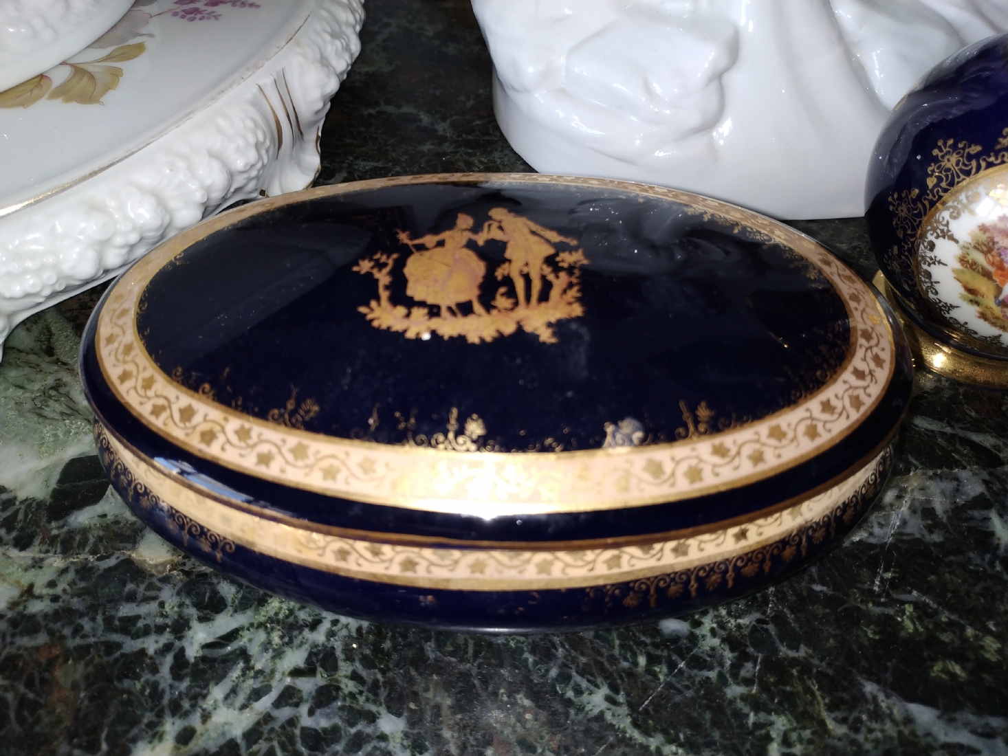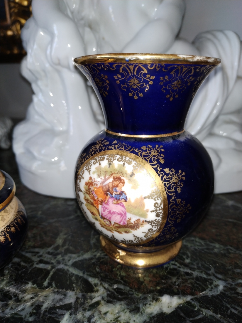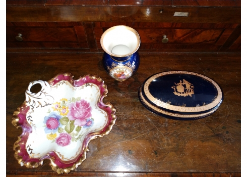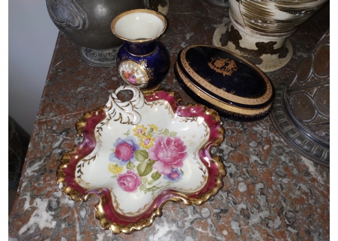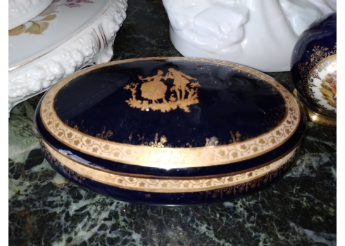 מספר הפריט בקטלוג 181לוט של שלושה כלי פורצלן שונים: עלה פורצלן (פגם קטן), קופסא צרפתית אובאלית מעוטרת זהב על קובלט כחול כהה מתוצרת: 'לימוז' וכד פורצלן מעוטר בהדפס של דמויות אצילים, חתומים, אורך הקופסא האובאלית: 17 ס"מ, גובה הכד: 10 ס"מ, רוחב העלה: 20 ס"מ.