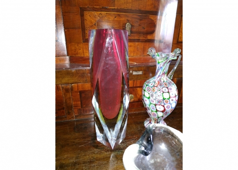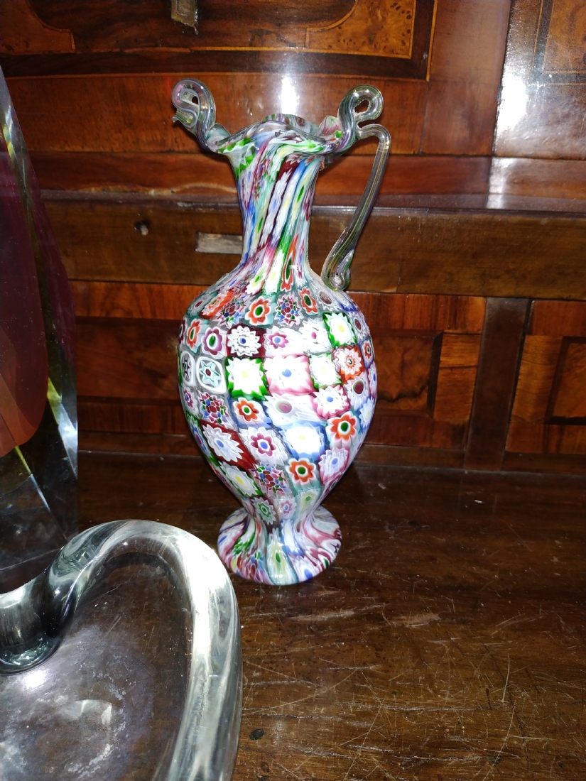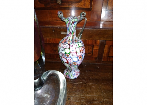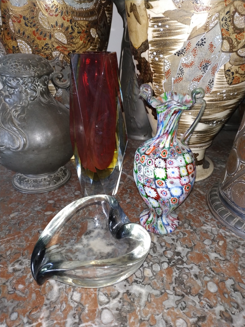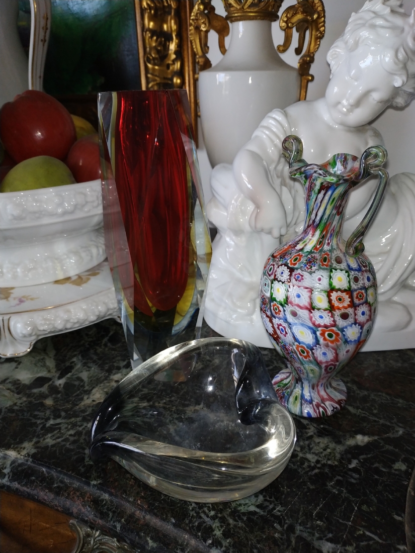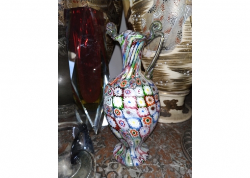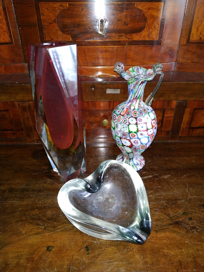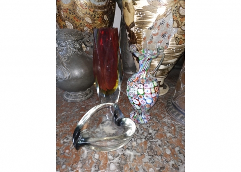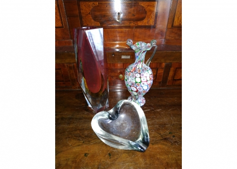 מספר הפריט בקטלוג 180לוט של שלושה כלי זכוכית שונים: אגרטל 'מילפיורי' (Millefiori) איטלקי (ונציאני), עשוי בעבודת 'Canework Glass', ידית אחת חסרה, גובה: 19 ס"מ, כלי מורנו בצורת לב בגוון אפור מעושן, רוחב: 12 ס"מ, ואגרטל לפרח בודד, בגובה: 22 ס"מ.