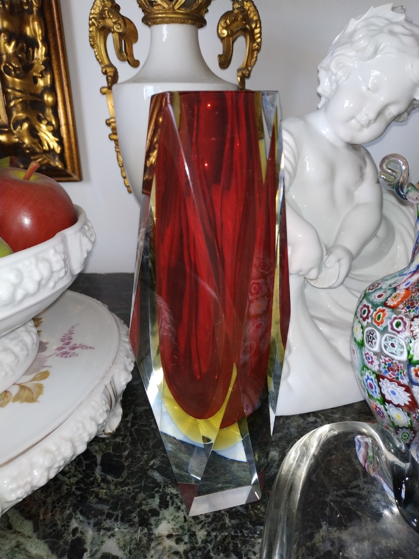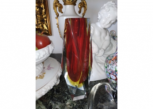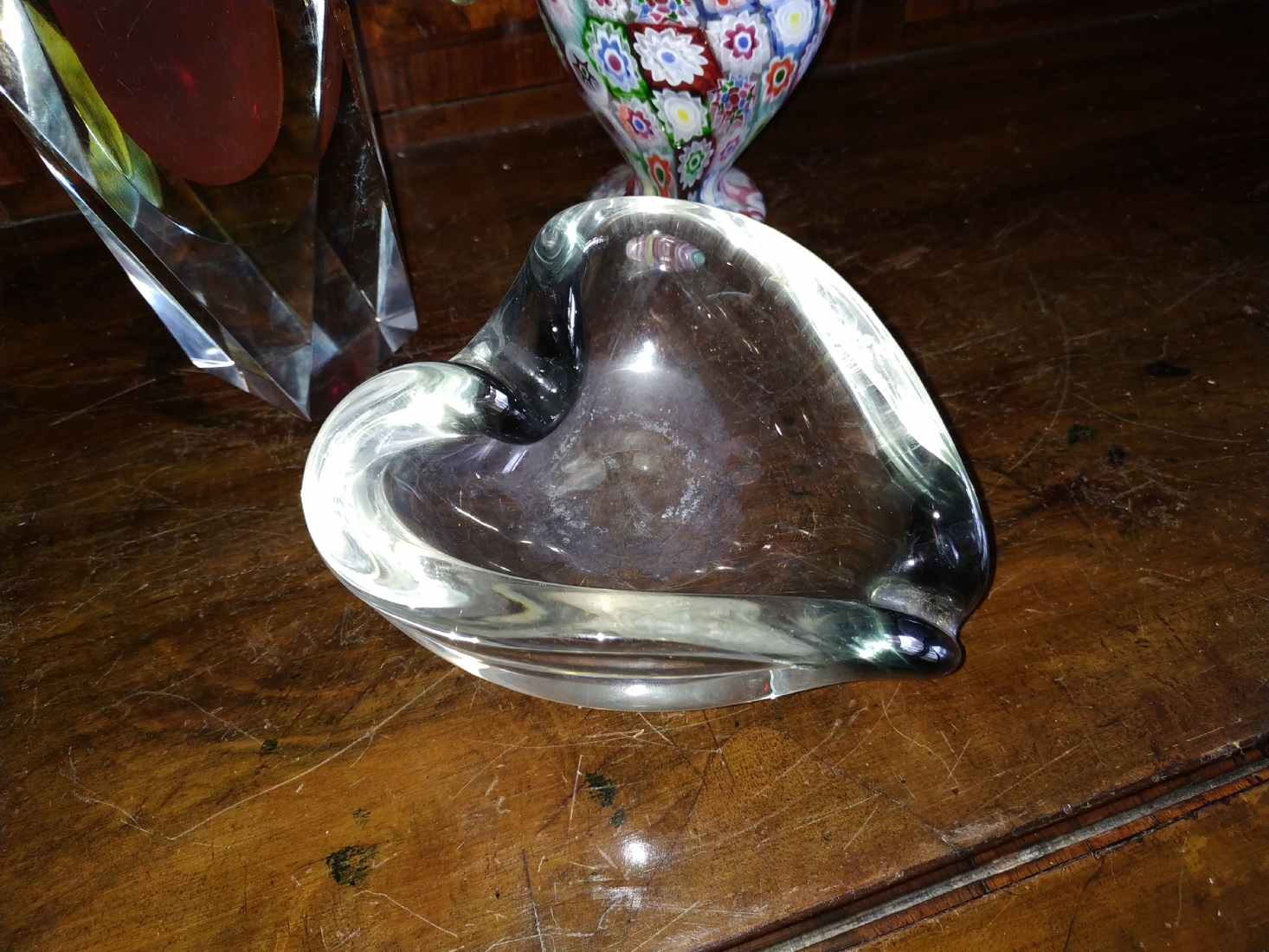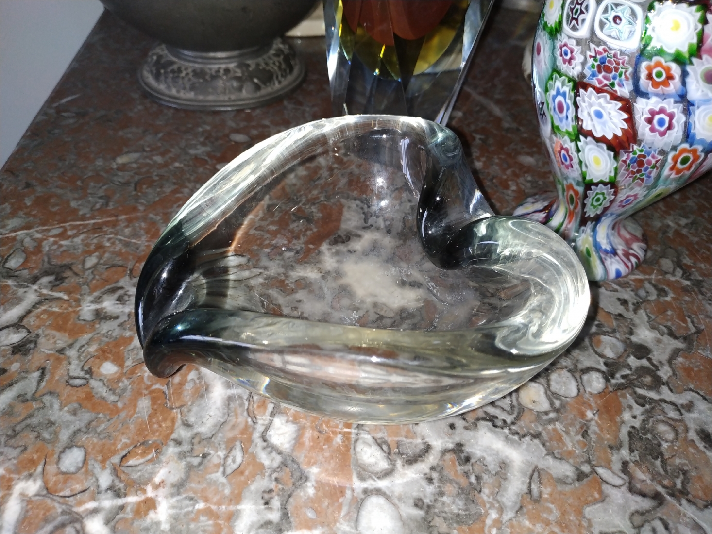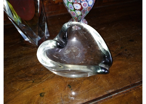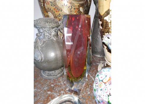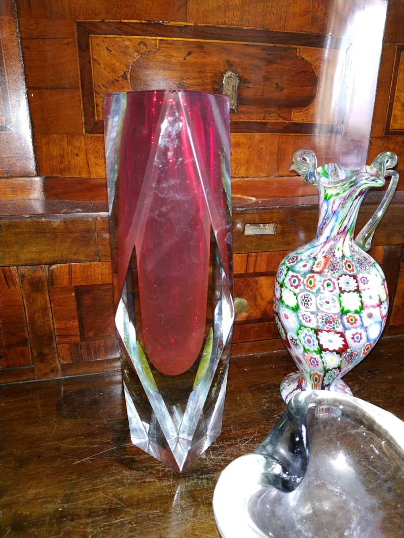מספר הפריט בקטלוג 180לוט של שלושה כלי זכוכית שונים: אגרטל 'מילפיורי' (Millefiori) איטלקי (ונציאני), עשוי בעבודת 'Canework Glass', ידית אחת חסרה, גובה: 19 ס"מ, כלי מורנו בצורת לב בגוון אפור מעושן, רוחב: 12 ס"מ, ואגרטל לפרח בודד, בגובה: 22 ס"מ.