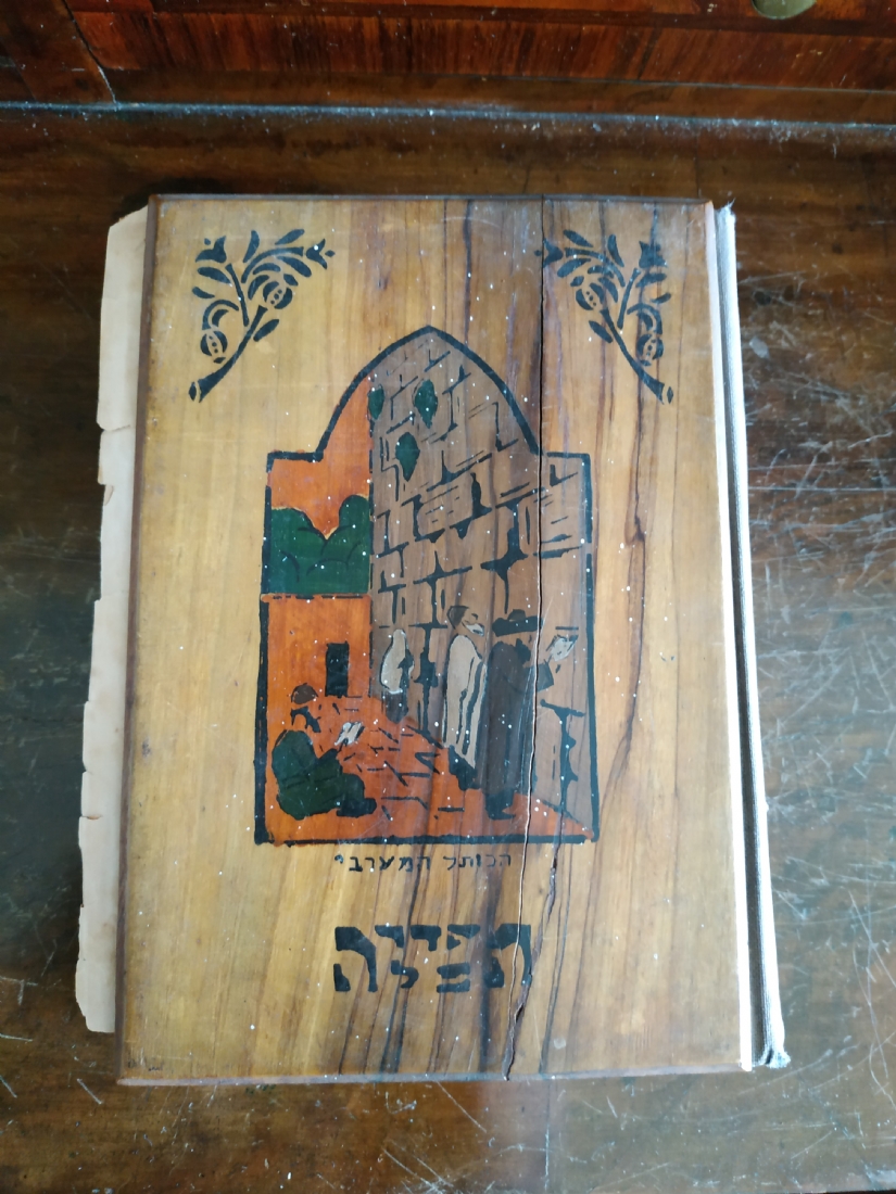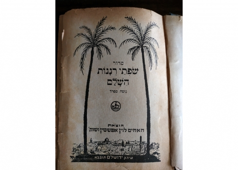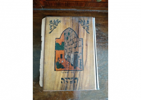 מספר הפריט בקטלוג 14סדור שפתי רננות השלם, נוסח ספרד, הוצאת האחים לוין אפשטין ושות, כריכה של בצלאל עשויה עץ זית מעוטרת בציור של הכתל המערבי, במצב משומש, מידות הכריכה: 17.5X12.5 ס"מ.