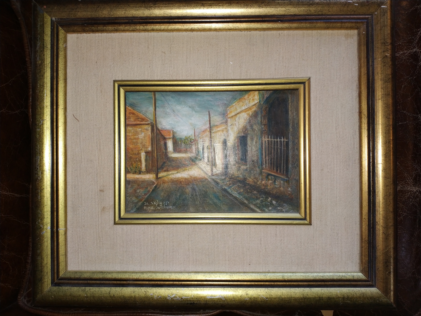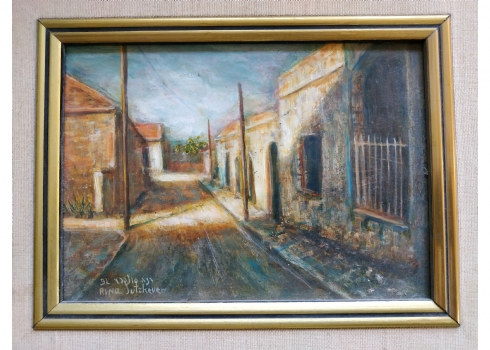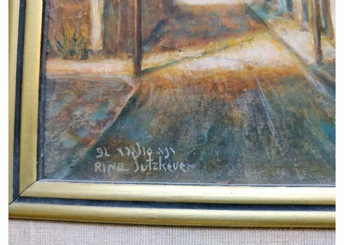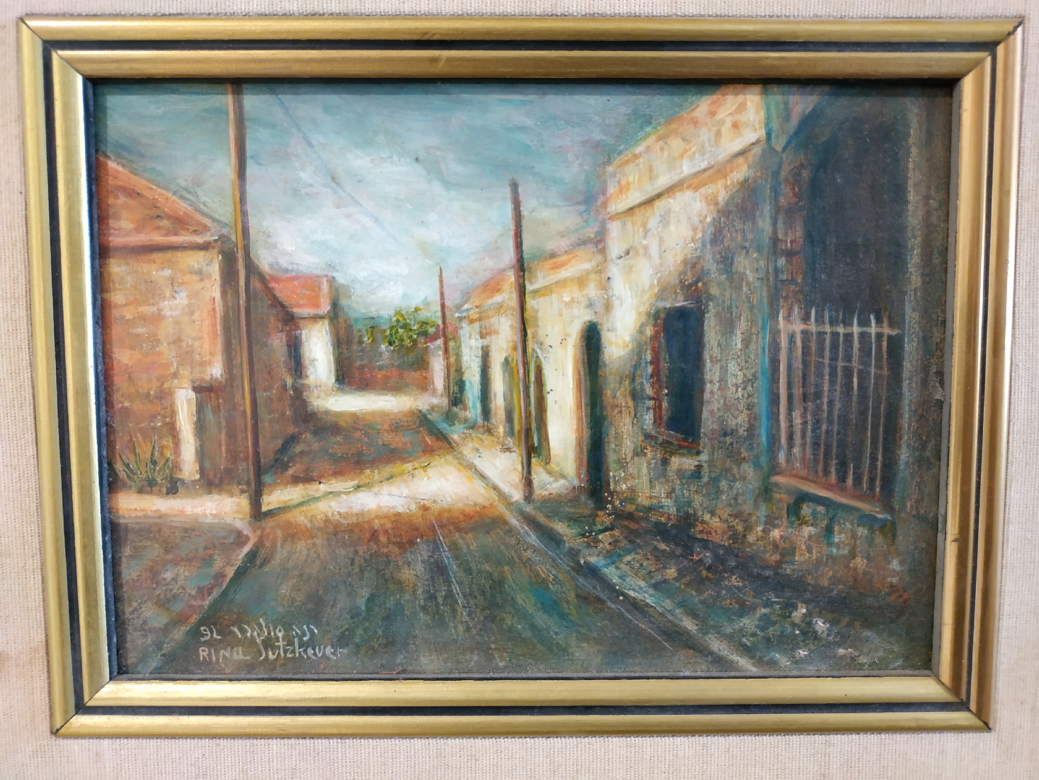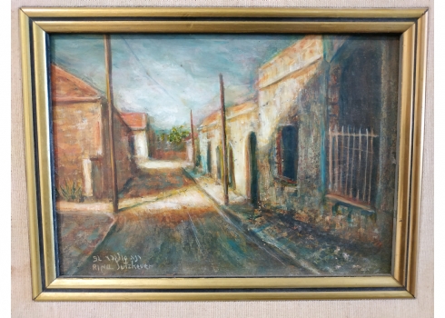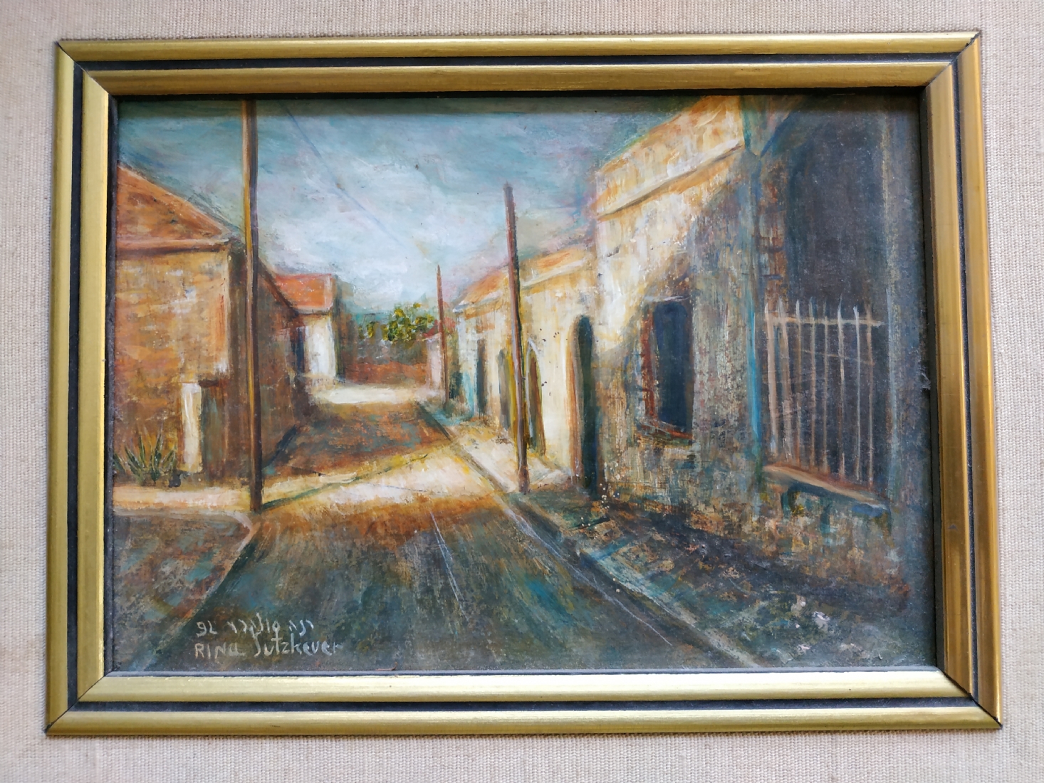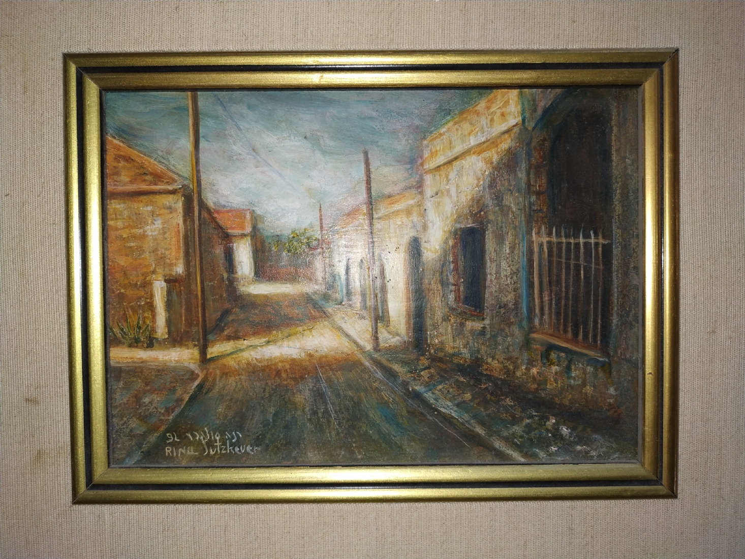 מספר הפריט בקטלוג 19רינה סוצקבר (Rina Sutzkever) - 'רחוב בנווה צדק' - ציור ישן, שמן על לוח, חתום ומתוארך: 1992, מידות: 15X22 ס"מ.