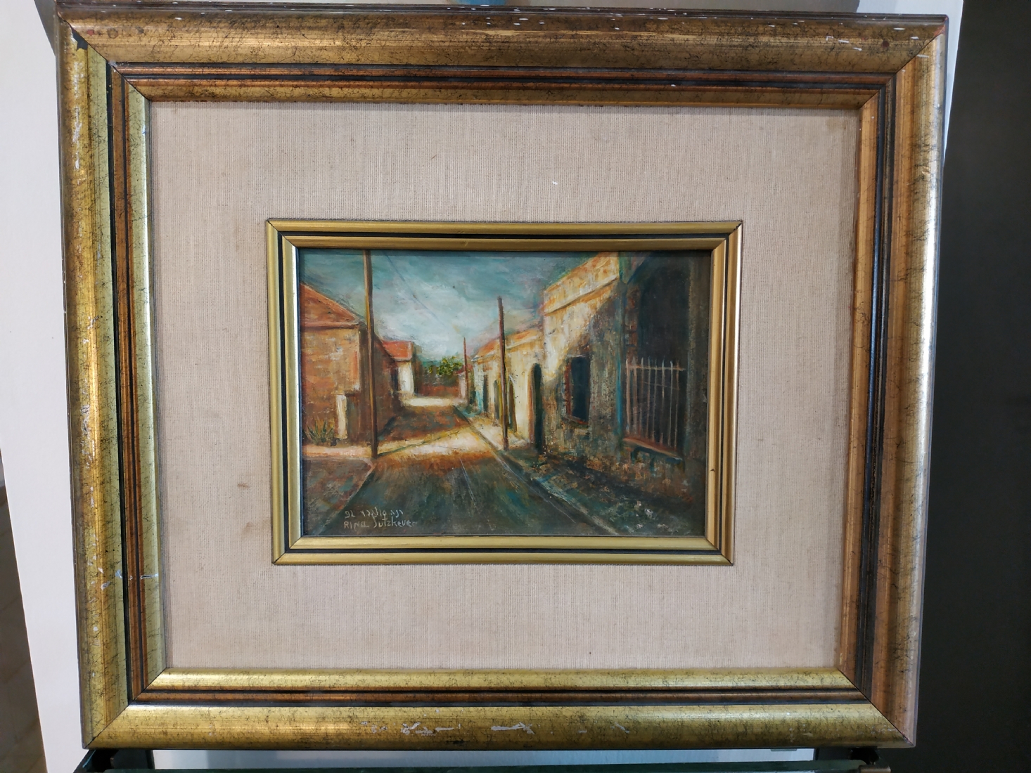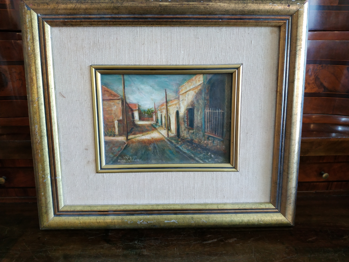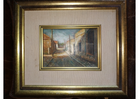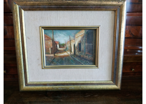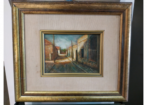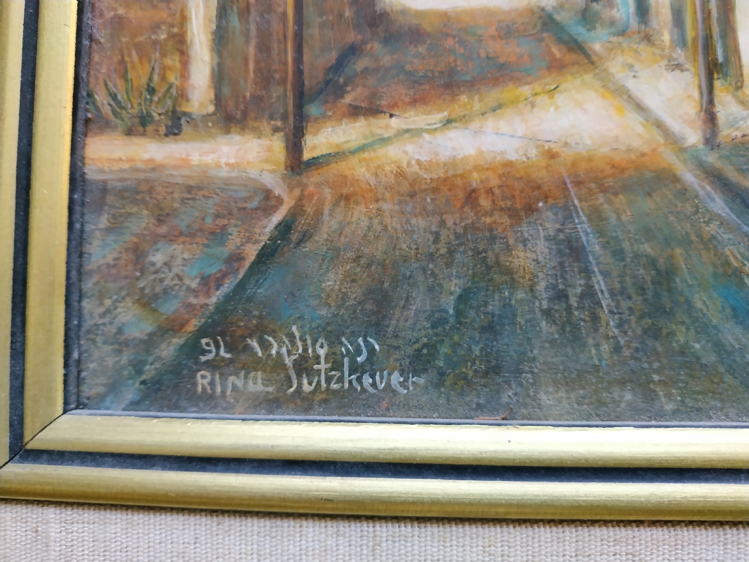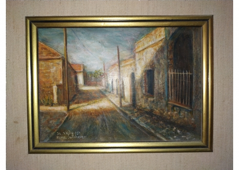 מספר הפריט בקטלוג 19רינה סוצקבר (Rina Sutzkever) - 'רחוב בנווה צדק' - ציור ישן, שמן על לוח, חתום ומתוארך: 1992, מידות: 15X22 ס"מ.