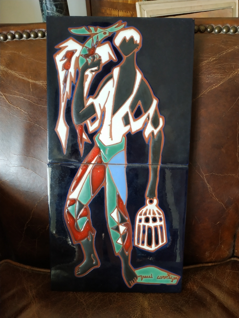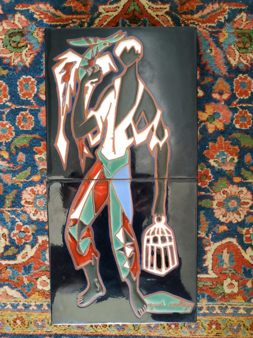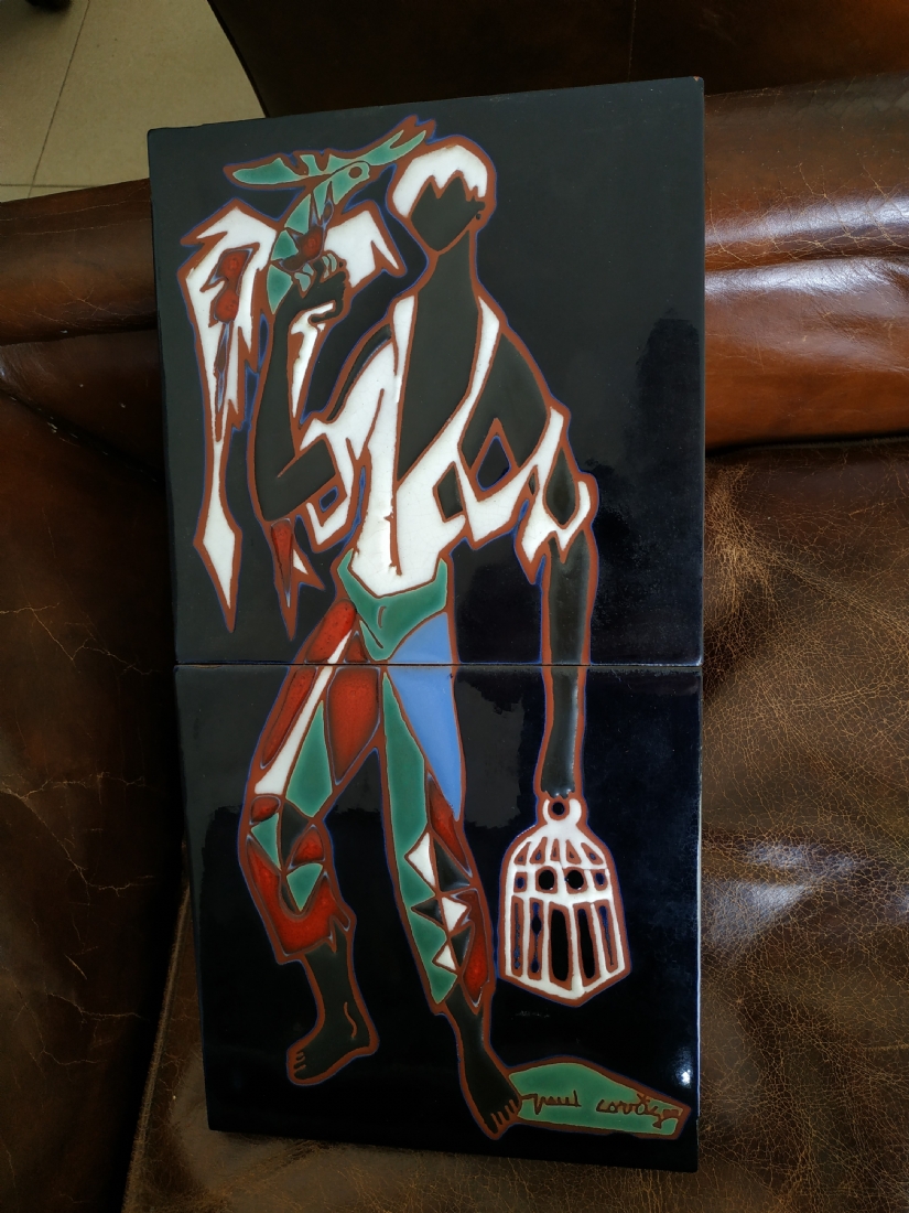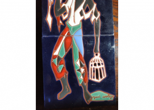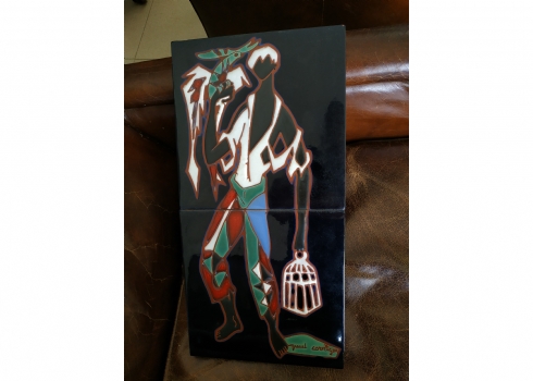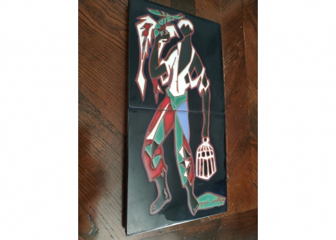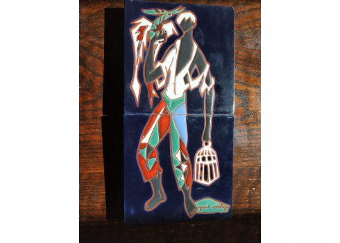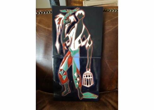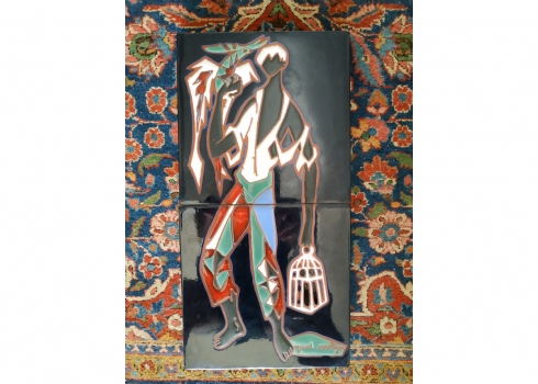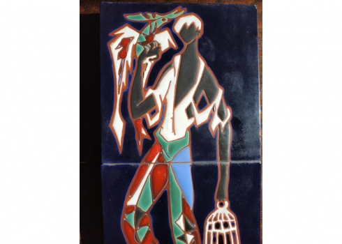 מספר הפריט בקטלוג 33שני אריחי קרמיקה מעוטרים בדמות גבר אוחז בכלוב ציפורים ותוכי, חתום (אמן לא מזוהה נשמח לעזרה בזיהוי), מוצמד ללוח, ניתן לתליה על הקיר, מידות הלוח: 40X20 ס"מ.