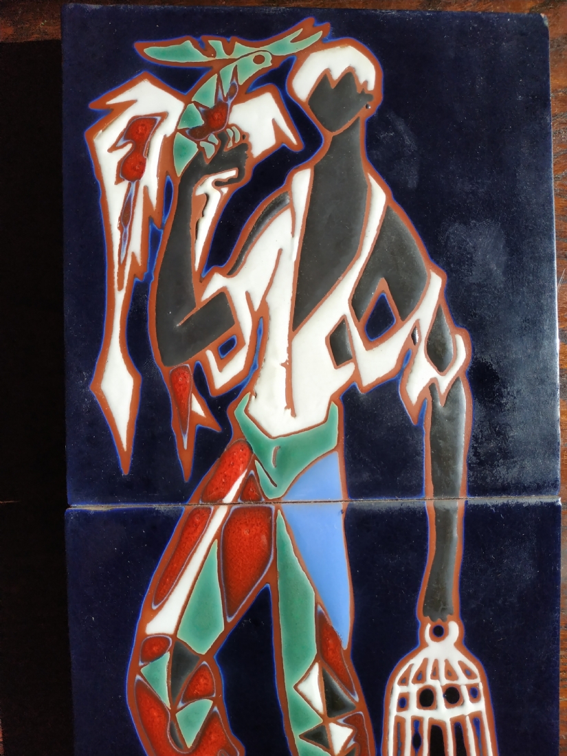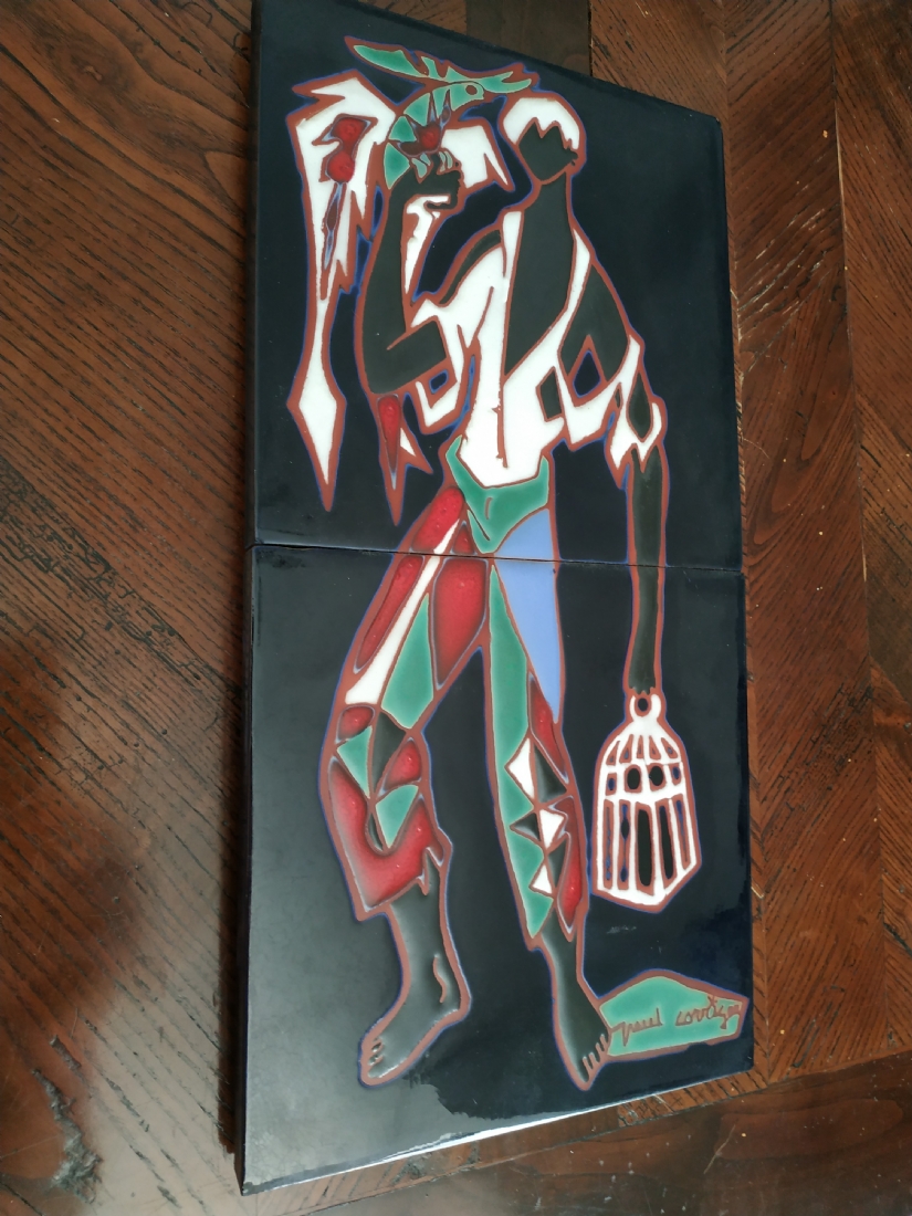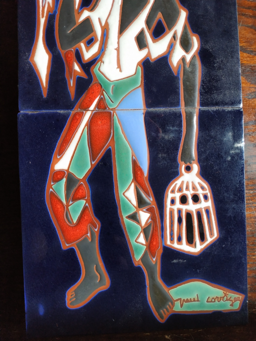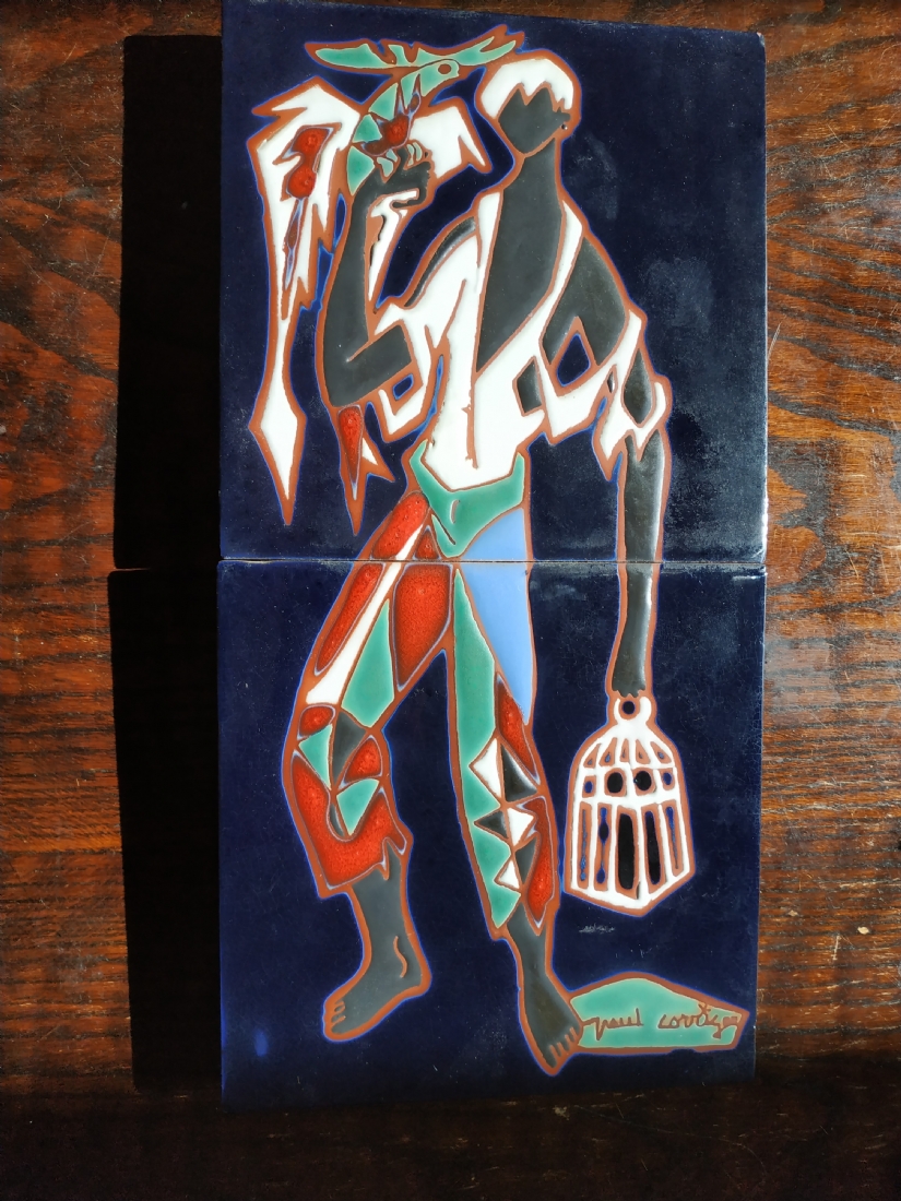 מספר הפריט בקטלוג 33שני אריחי קרמיקה מעוטרים בדמות גבר אוחז בכלוב ציפורים ותוכי, חתום (אמן לא מזוהה נשמח לעזרה בזיהוי), מוצמד ללוח, ניתן לתליה על הקיר, מידות הלוח: 40X20 ס"מ.
