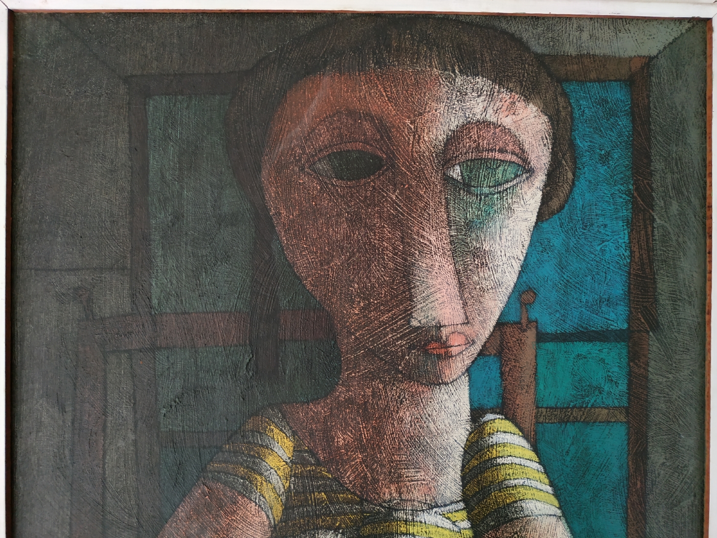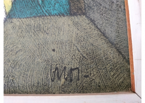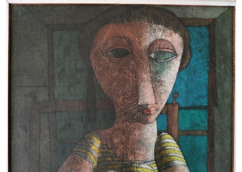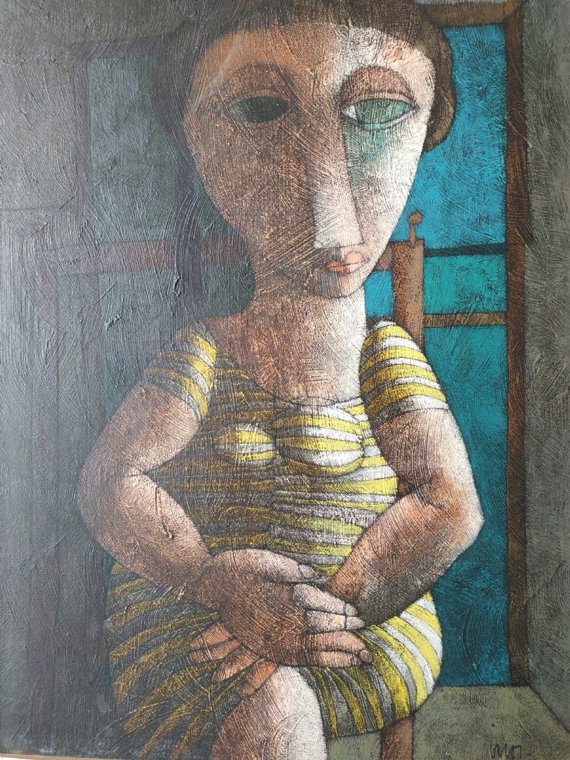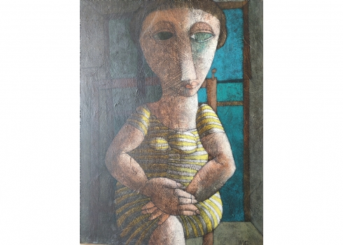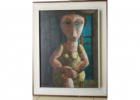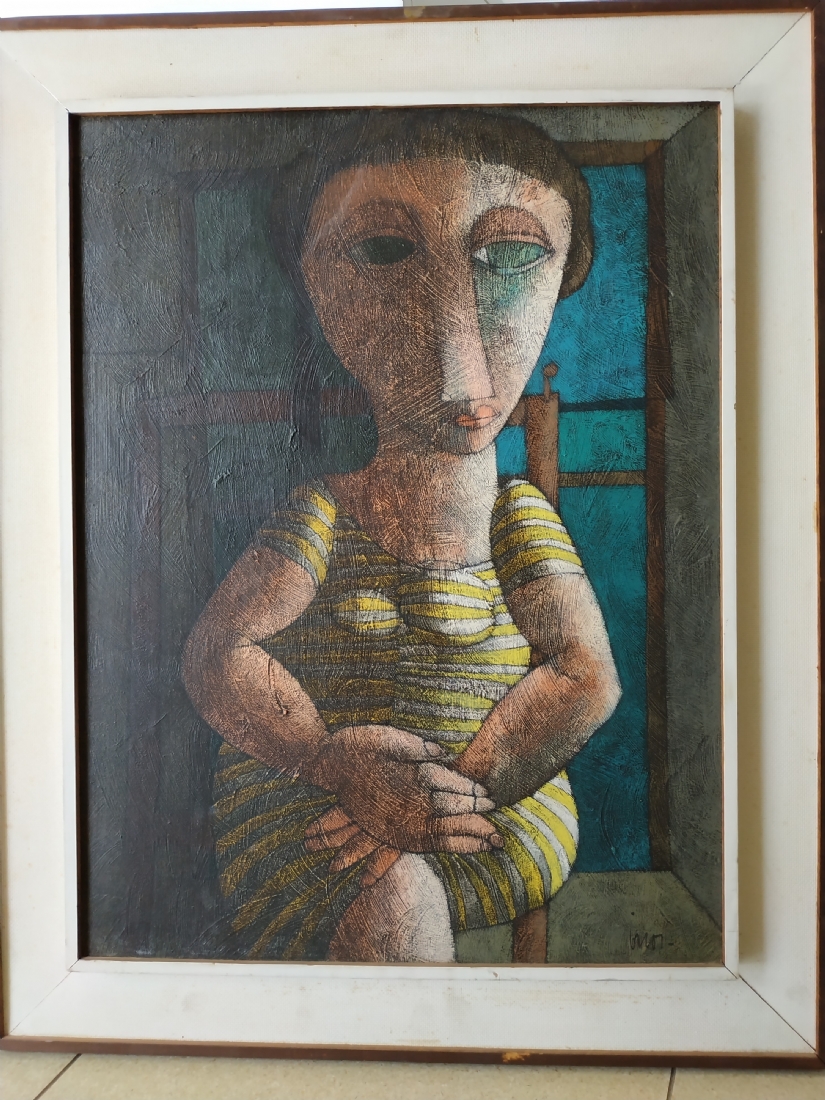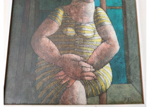 מספר הפריט בקטלוג 39אינוס קוראדין (Inos Corradin) - 'אישה בשמלת פסים' - ציור ישן, שמן על לוח, חתום Inos, מידות: 60X46 ס"מ.