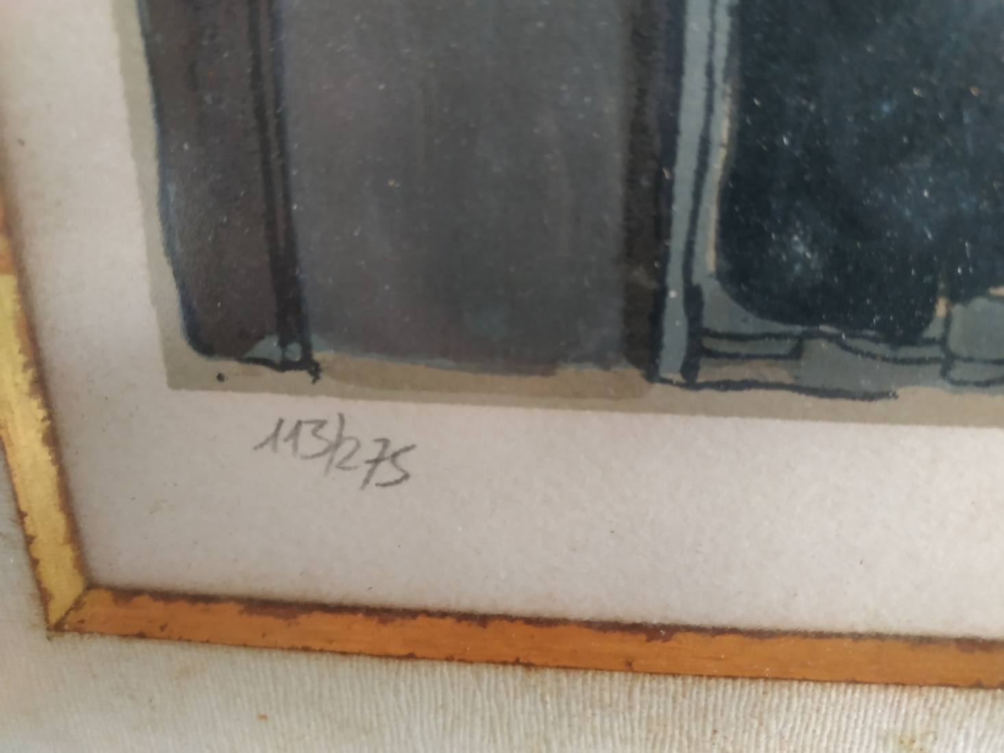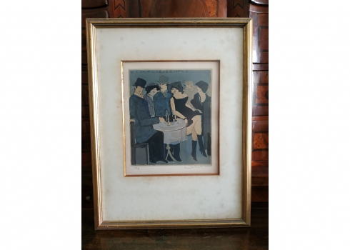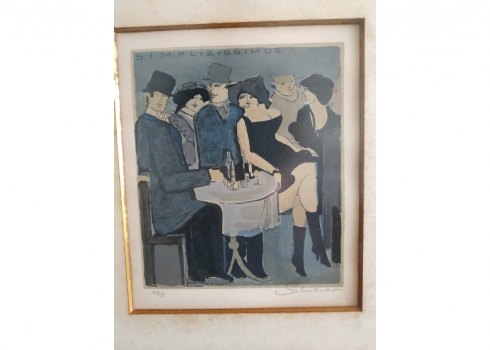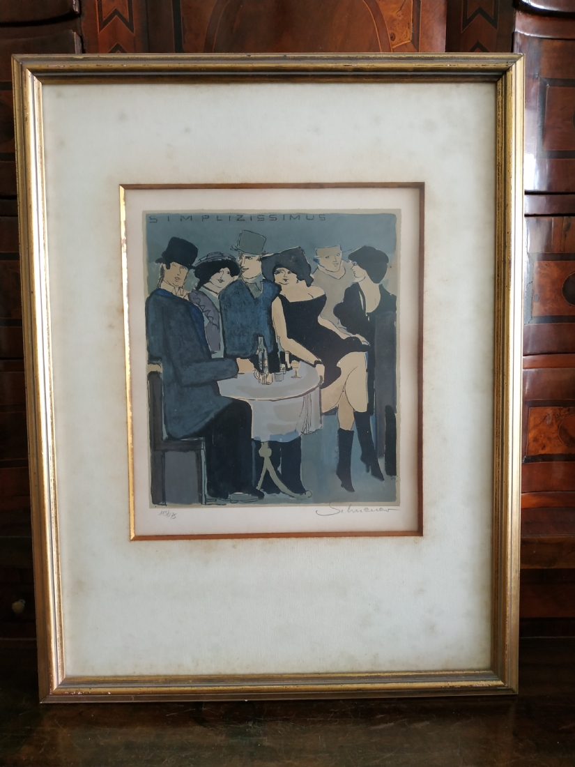 מספר הפריט בקטלוג 45דוד שניאור - 'דמויות בבית קפה / Simplizissimus' - ליטוגרפיה, חתומה בעיפרון, ממסופרת: 113/275, מידות: 33x27 ס"מ.