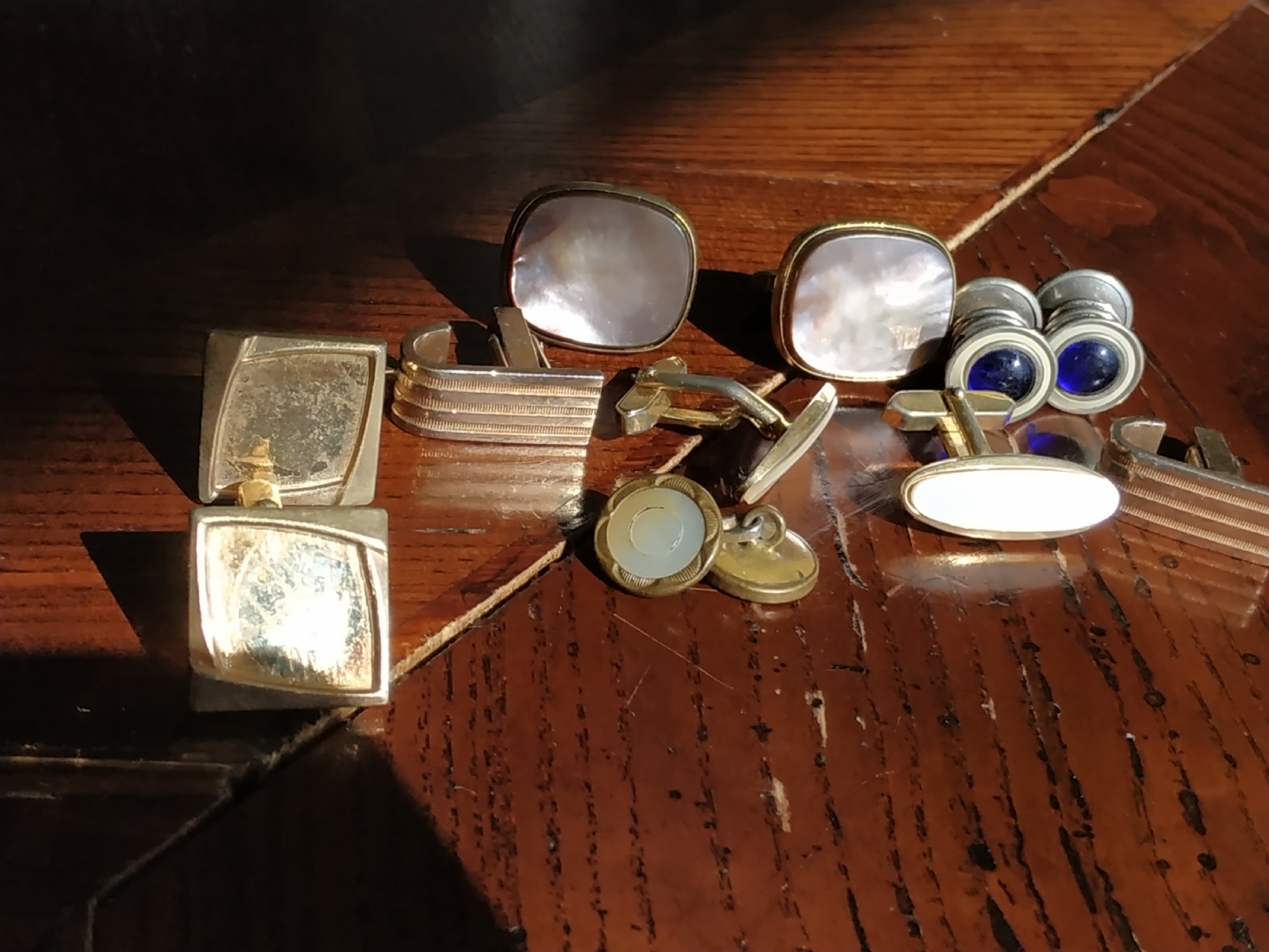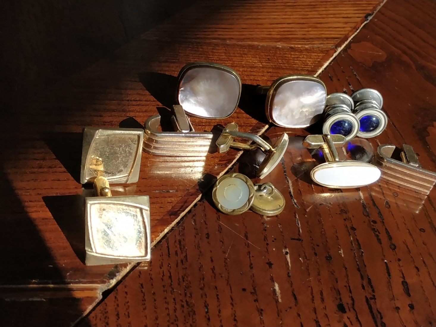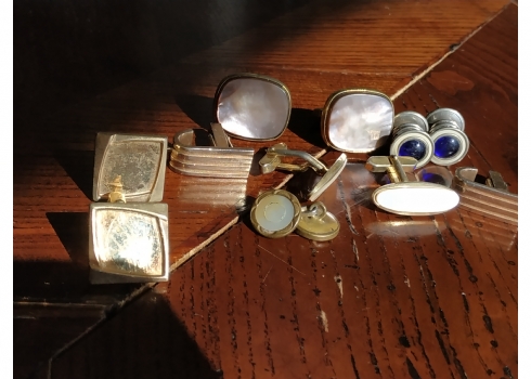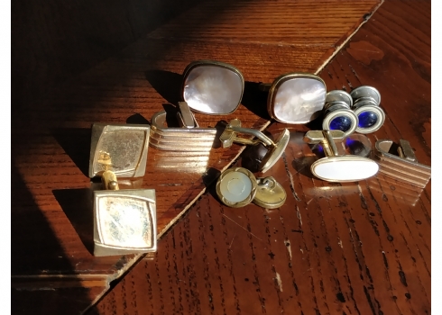 לוט של חמישה זוגות חפתים ישנים לגבר ועוד חפת בודד, עשויים מתכת חלקם מצופים בזהב ומשובצים אם הפנינה.