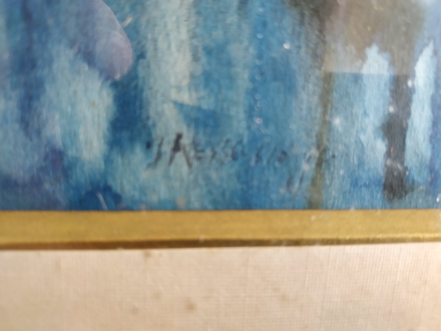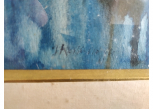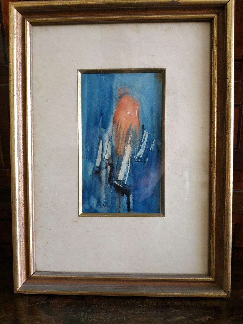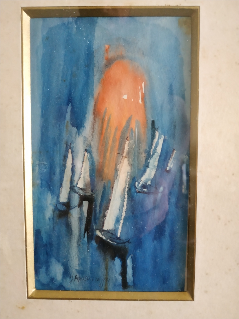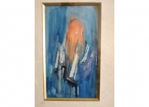 מספר הפריט בקטלוג 159יוסף קוסונוגי (Joseph Kossonogi) - 'סירות מפרש בשקיעה' - ציור ישן, אקוורל על נייר, חתום, מידות: 21X12 ס"מ.