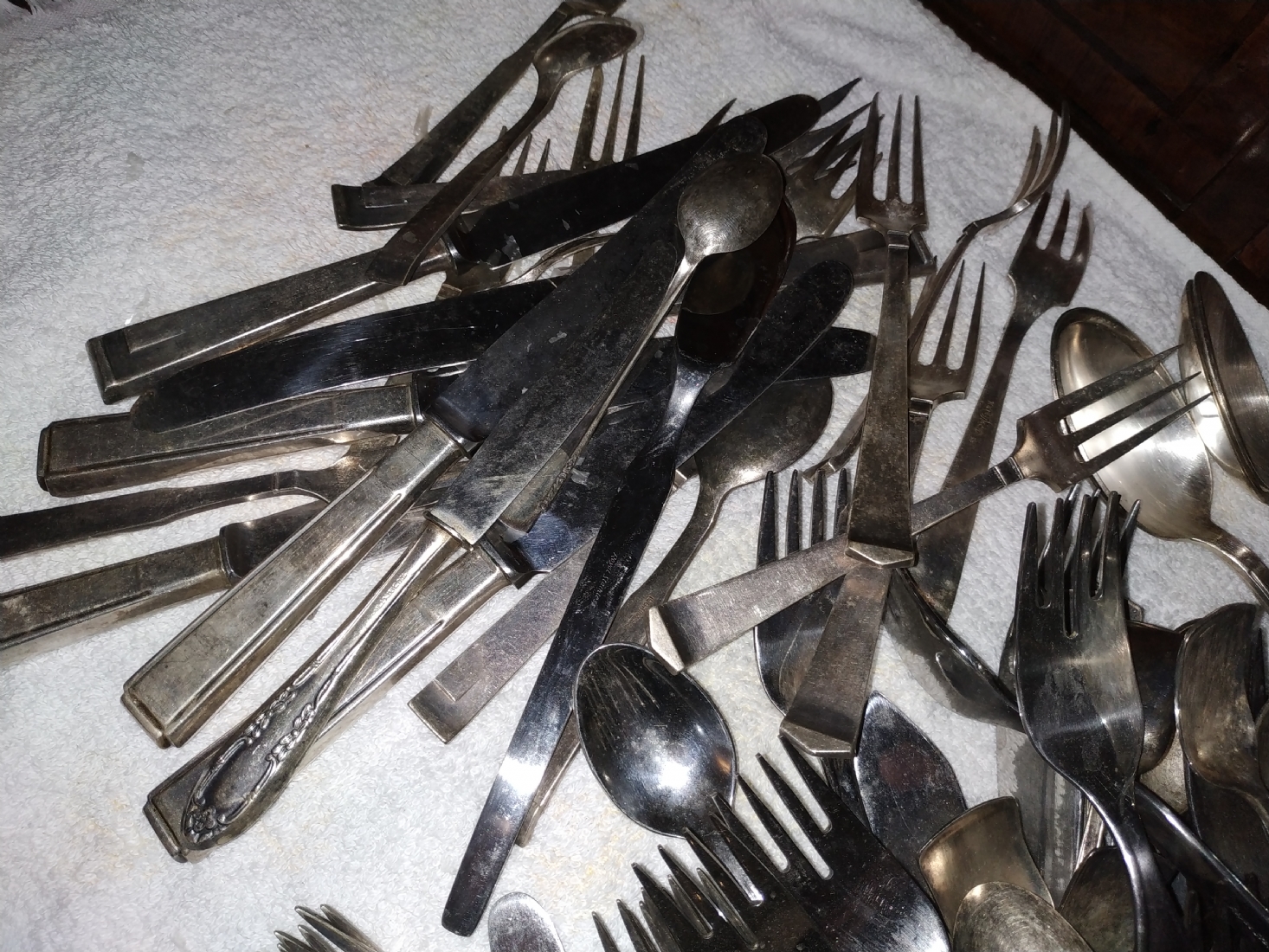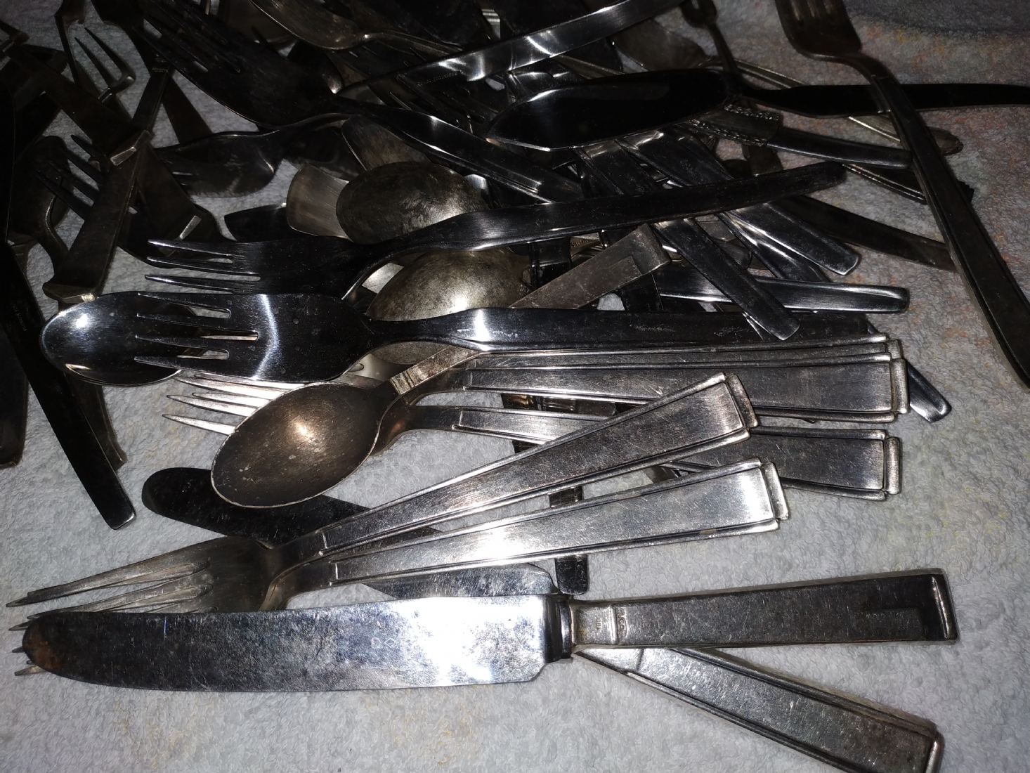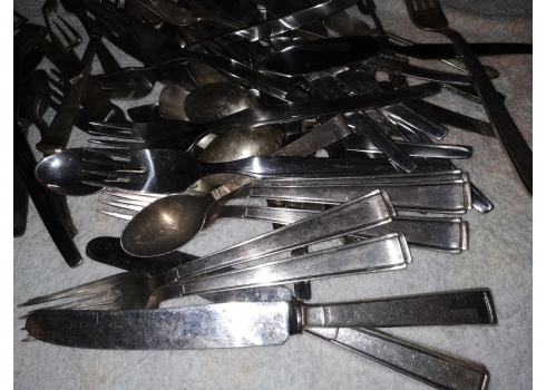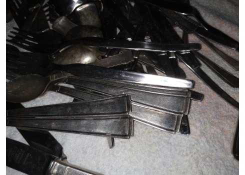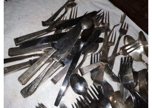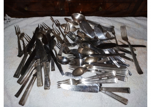 לוט של עשרות פרטי סכו"ם ישנים שונים מדגמים שונים עשויים מתכת.