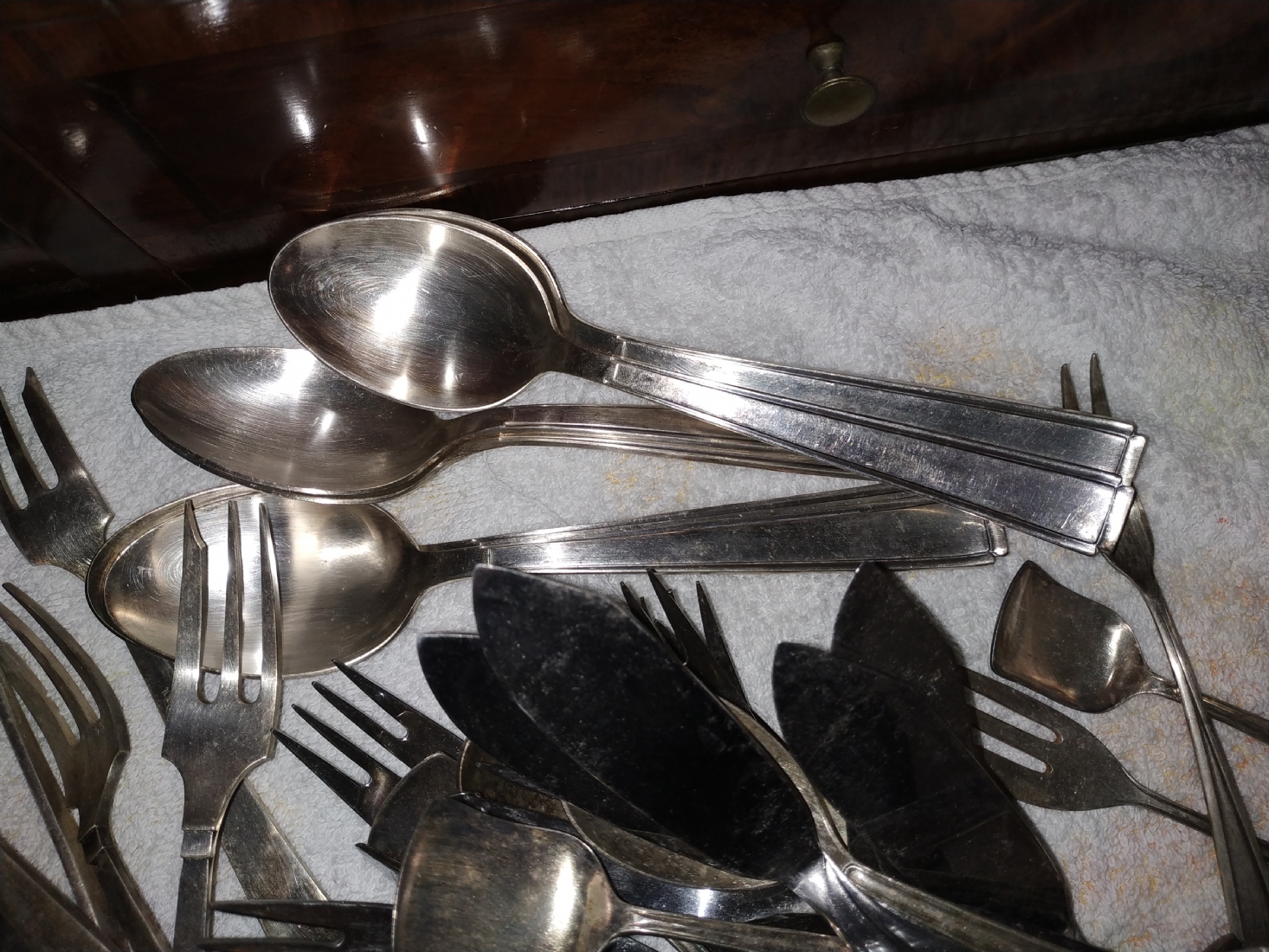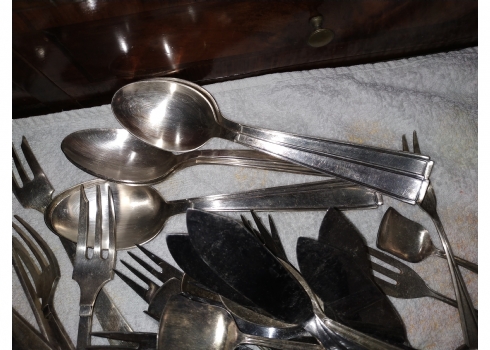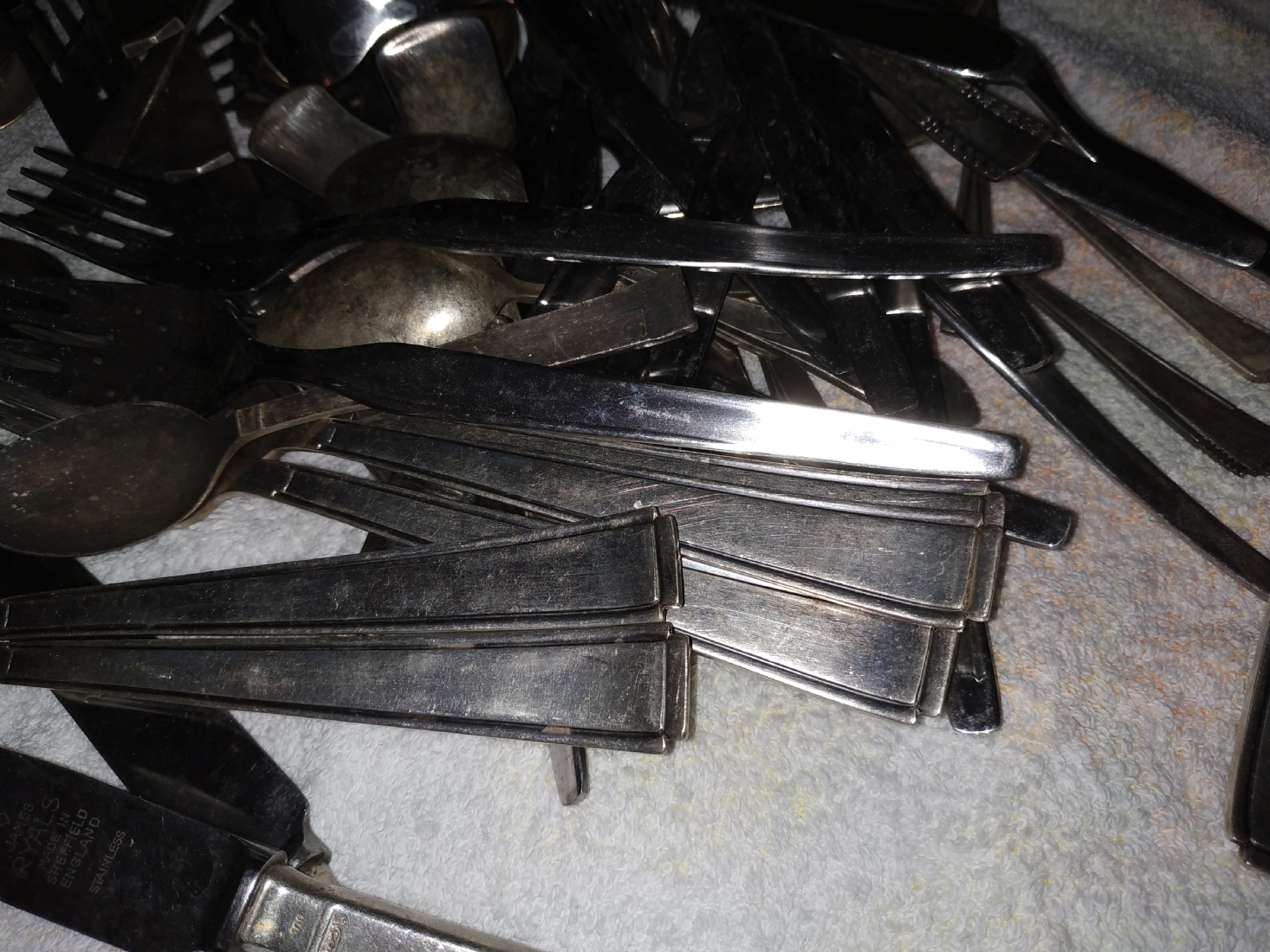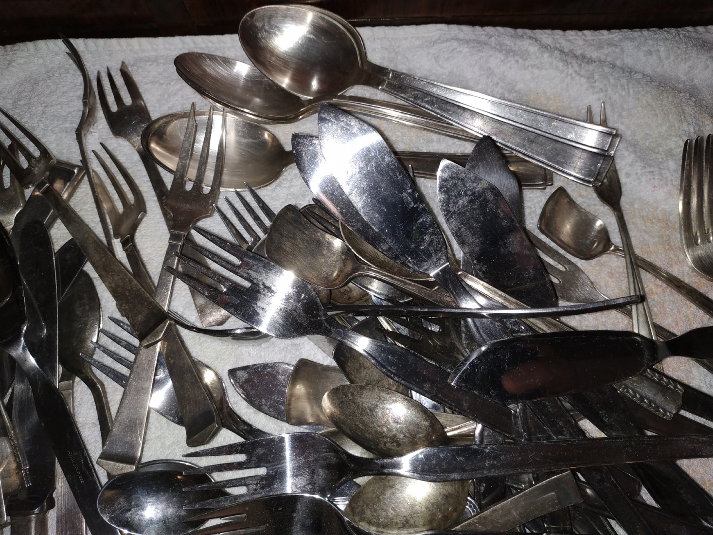 לוט של עשרות פרטי סכו"ם ישנים שונים מדגמים שונים עשויים מתכת.