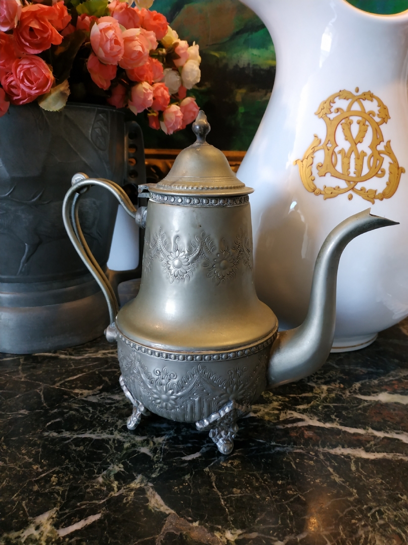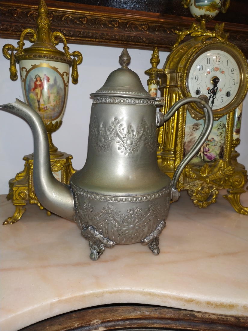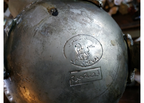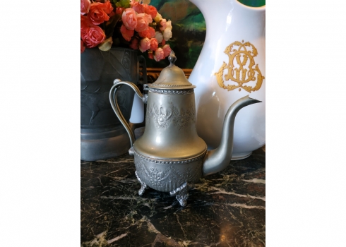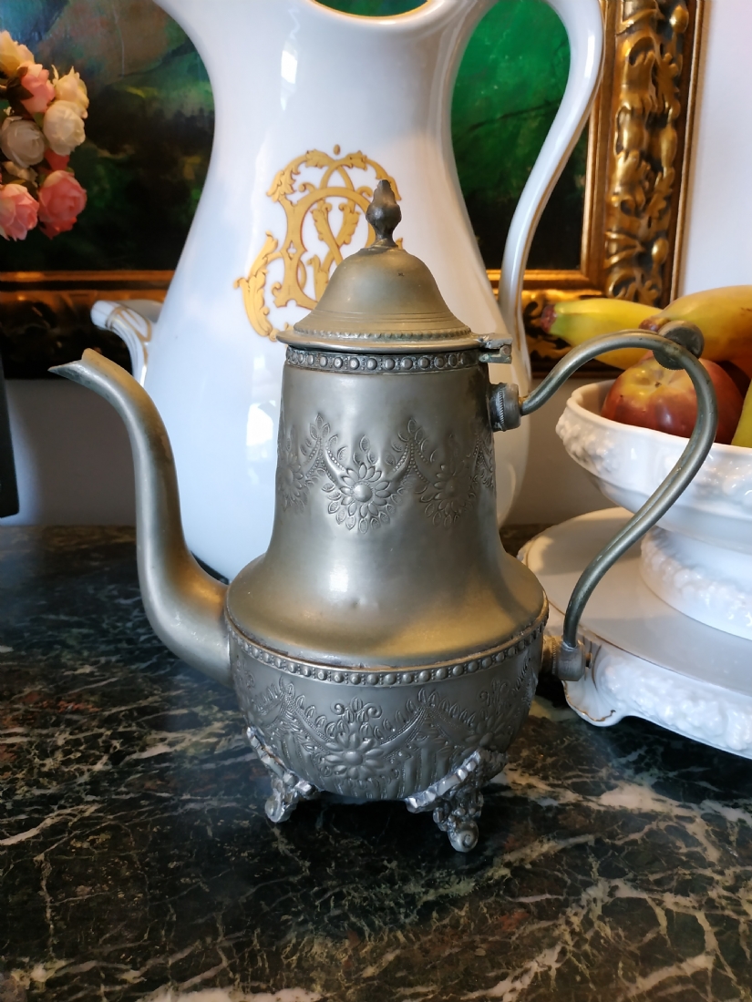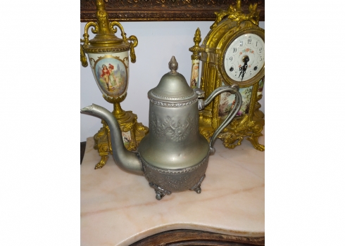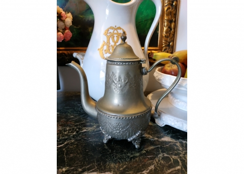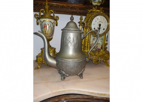 קנקן קפה מרוקאי ישן, עשוי מתכת מרוקעת, חתום, גובה: 24 ס"מ.