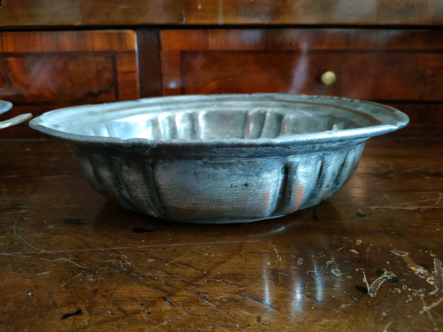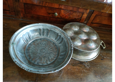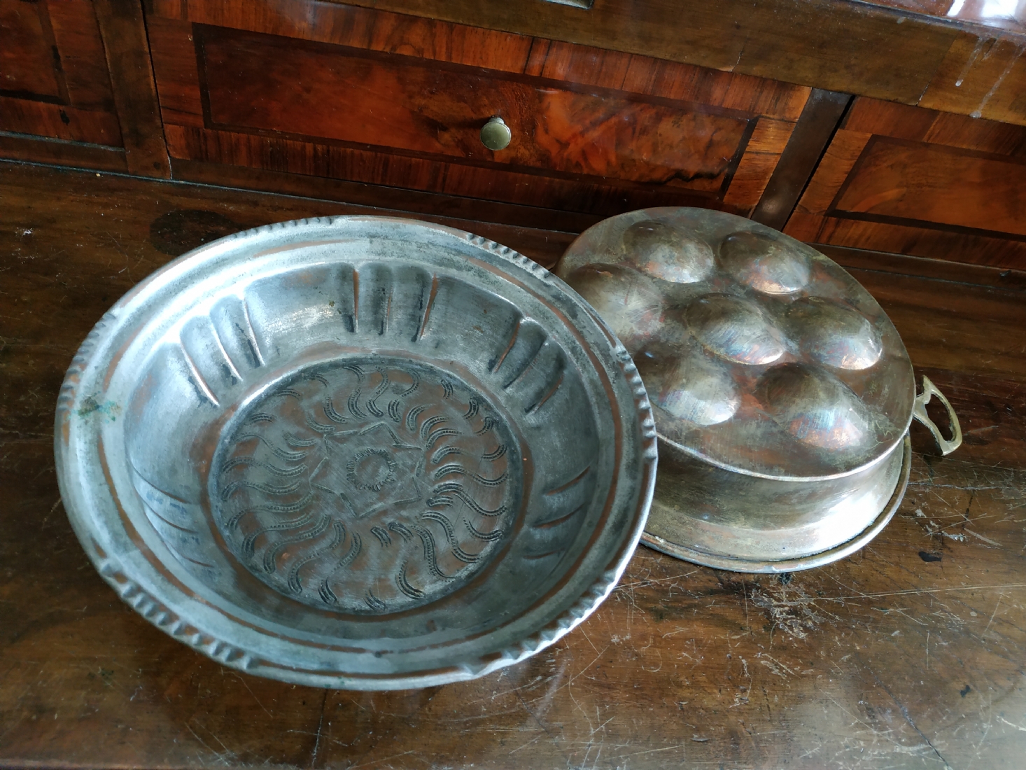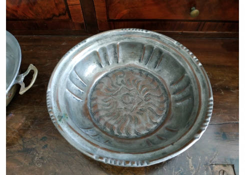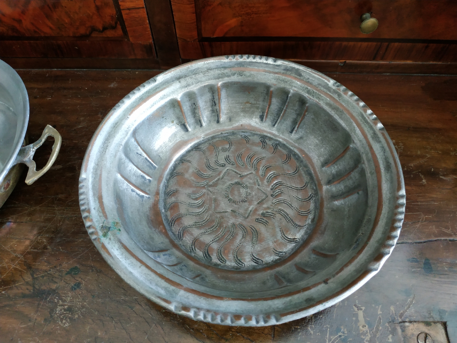 לוט של שני כלי נחושת ישנים, אחד להגשת ביצים והשני קערה איסלאמית, רוחב הכלי לביצים כולל ידיות: 24 ס"מ.
