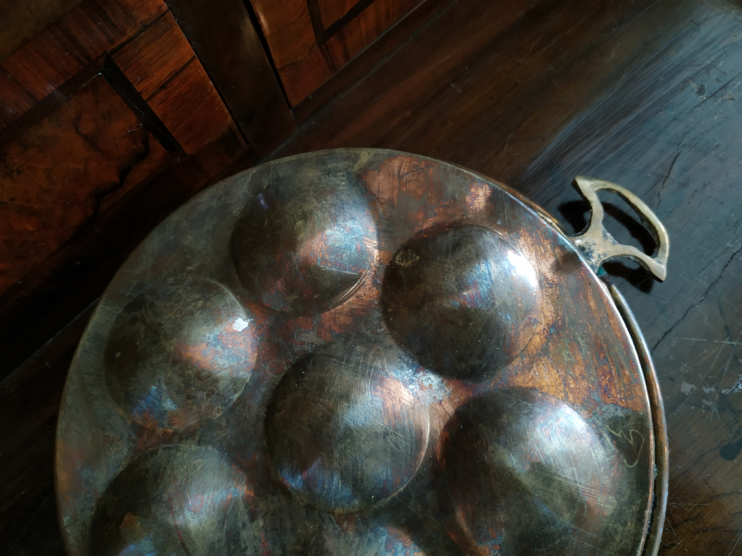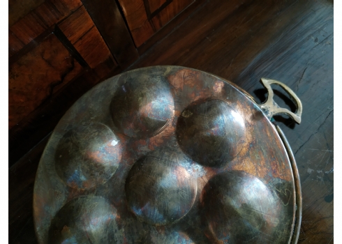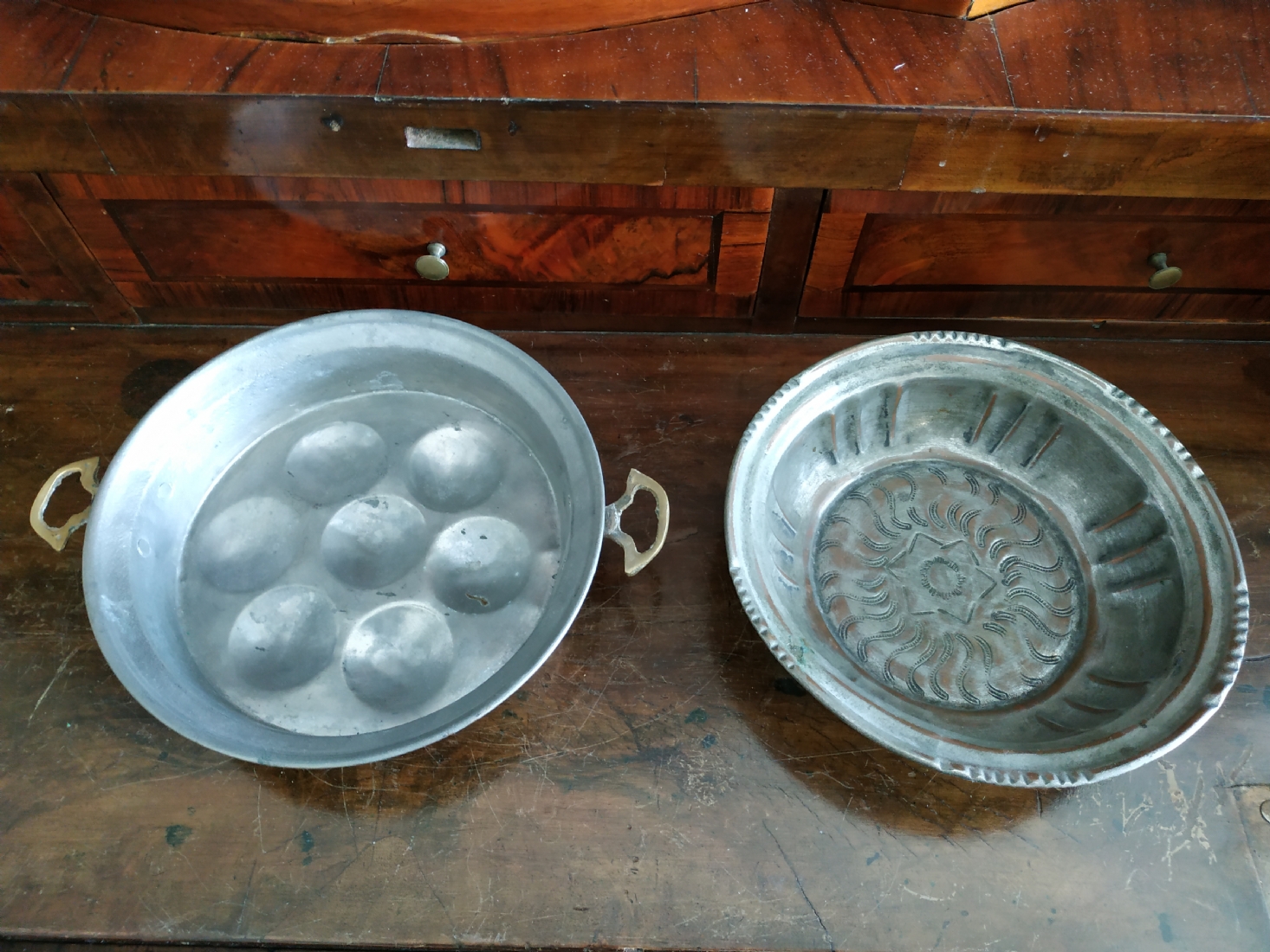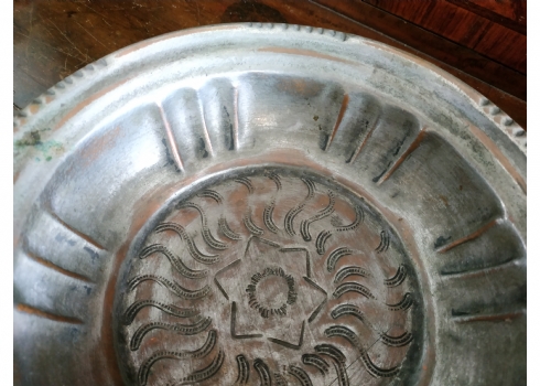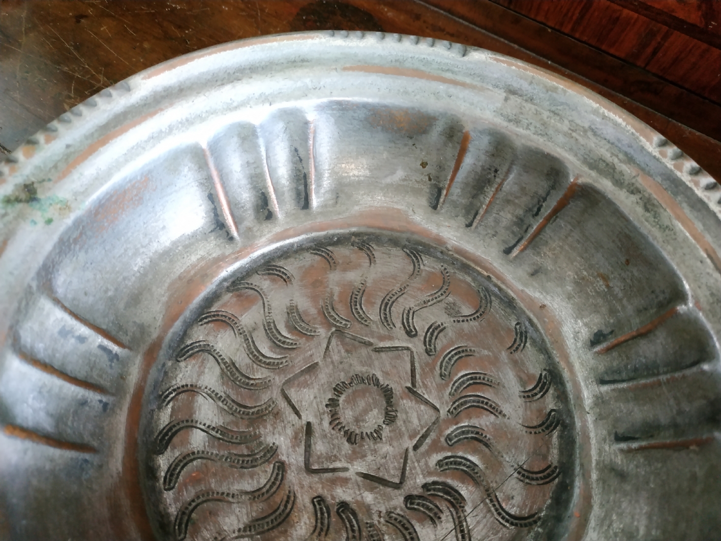 לוט של שני כלי נחושת ישנים, אחד להגשת ביצים והשני קערה איסלאמית, רוחב הכלי לביצים כולל ידיות: 24 ס"מ.