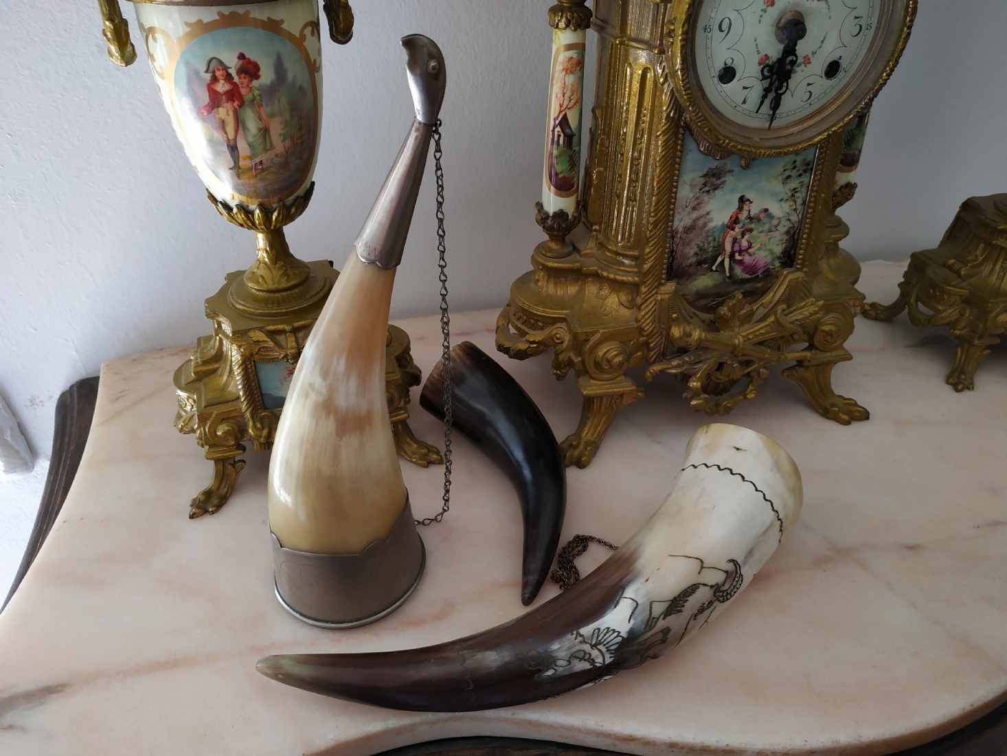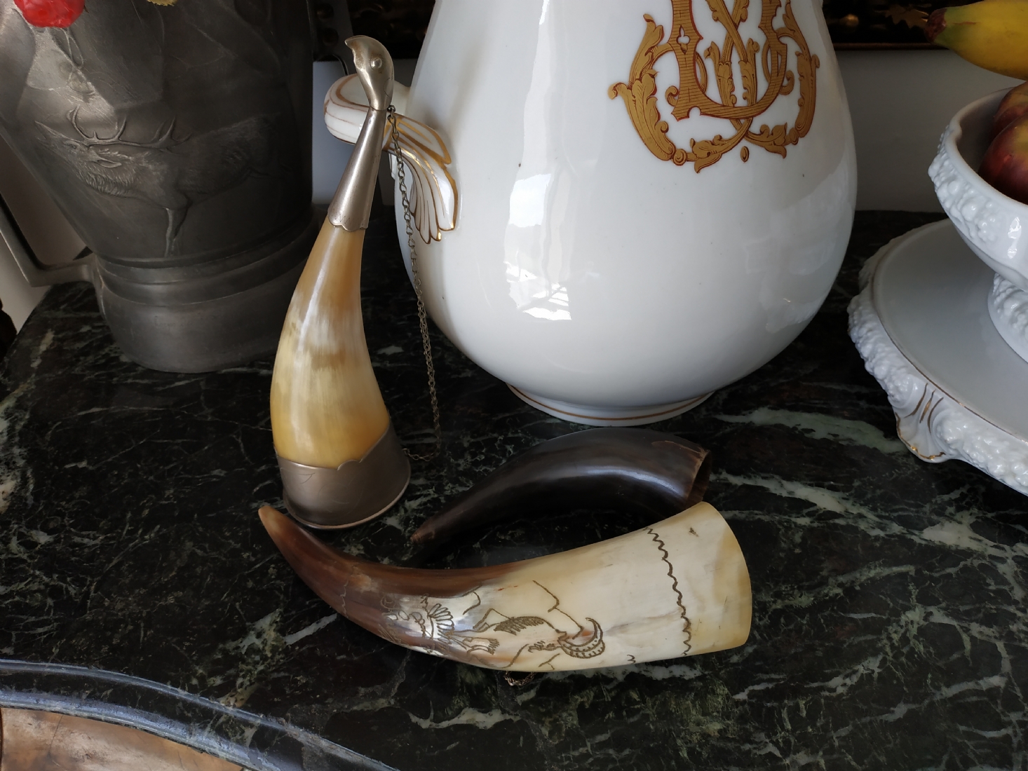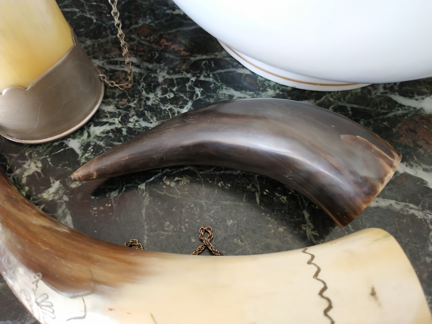 לוט של שלוש קרני חיה, לשתיים מהן התקני מתכת (קרנות שתיה לתליה על הקיר מגאורגיה), גובה הגדולה: 23 ס"מ.
