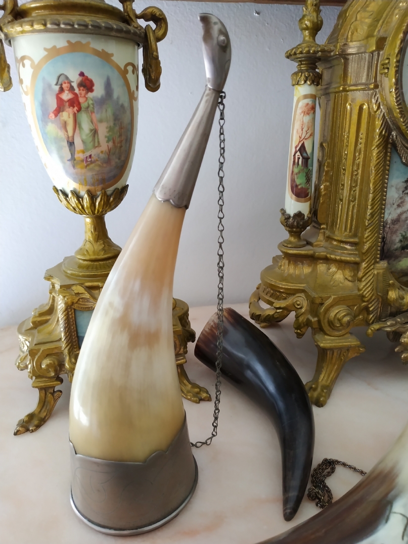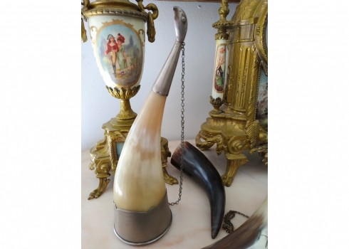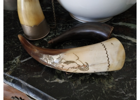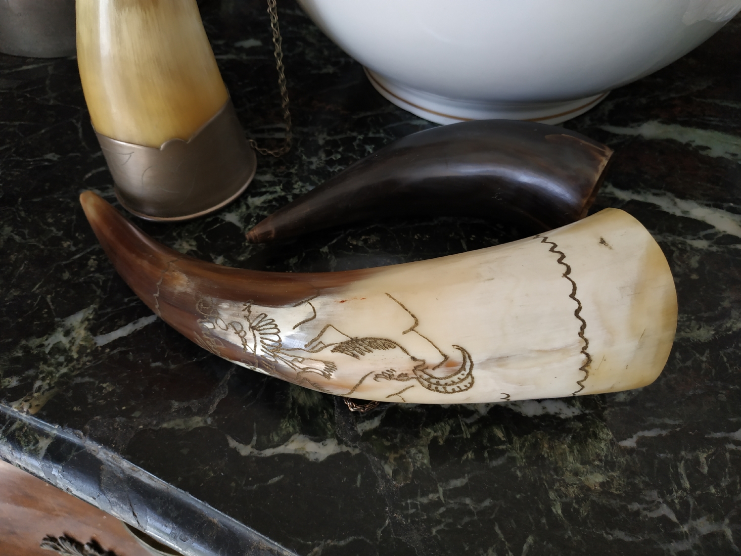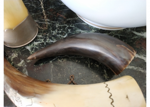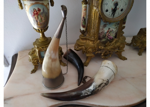 לוט של שלוש קרני חיה, לשתיים מהן התקני מתכת (קרנות שתיה לתליה על הקיר מגאורגיה), גובה הגדולה: 23 ס"מ.