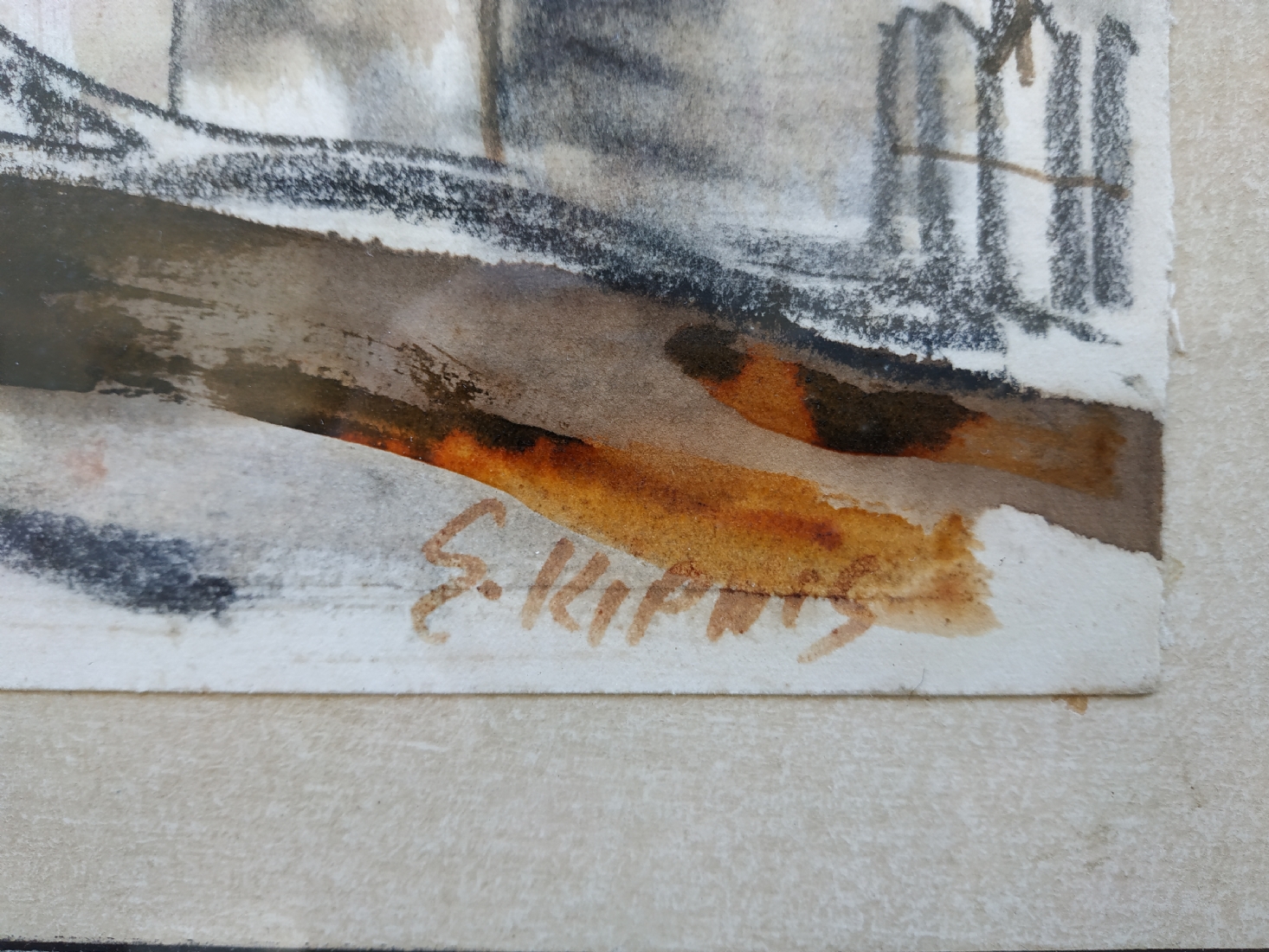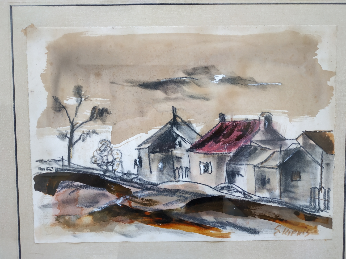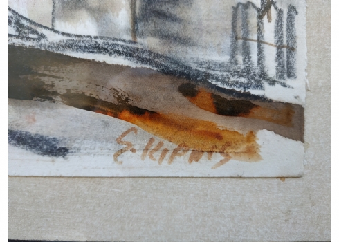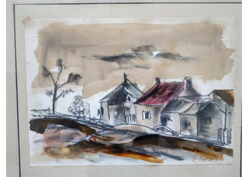 מספר הפריט בקטלוג 277עמנואל קיפניס - 'בית עם גג רעפים אדום' - ציור ישן, גירי פנדה ואקוורל על נייר, חתום, מידות: 25X35 ס"מ.