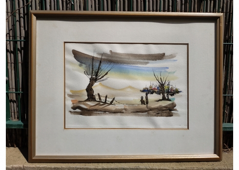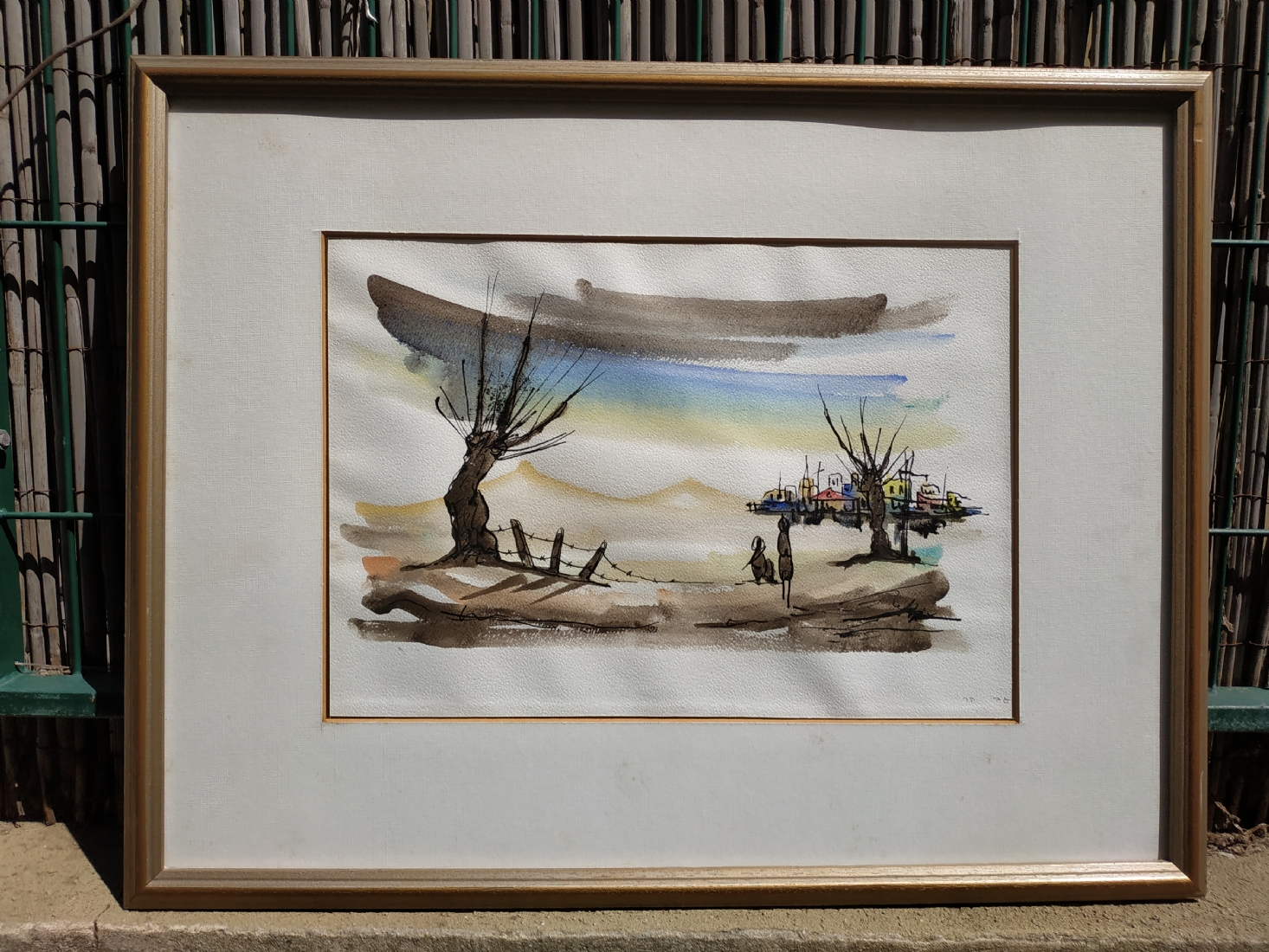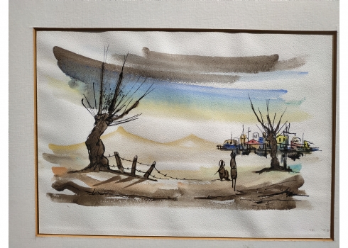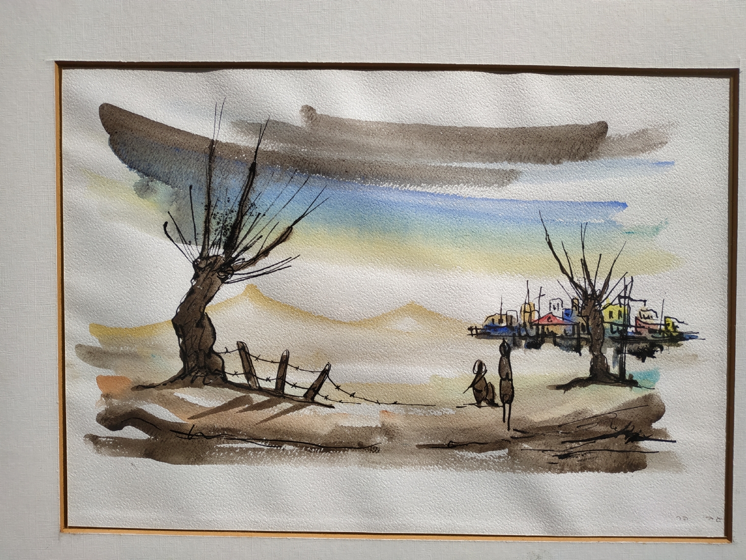 גבי הר - 'גדר תייל' - רישום דיו ואקוורל על נייר, חתום, מידות: 30X45 ס"מ.