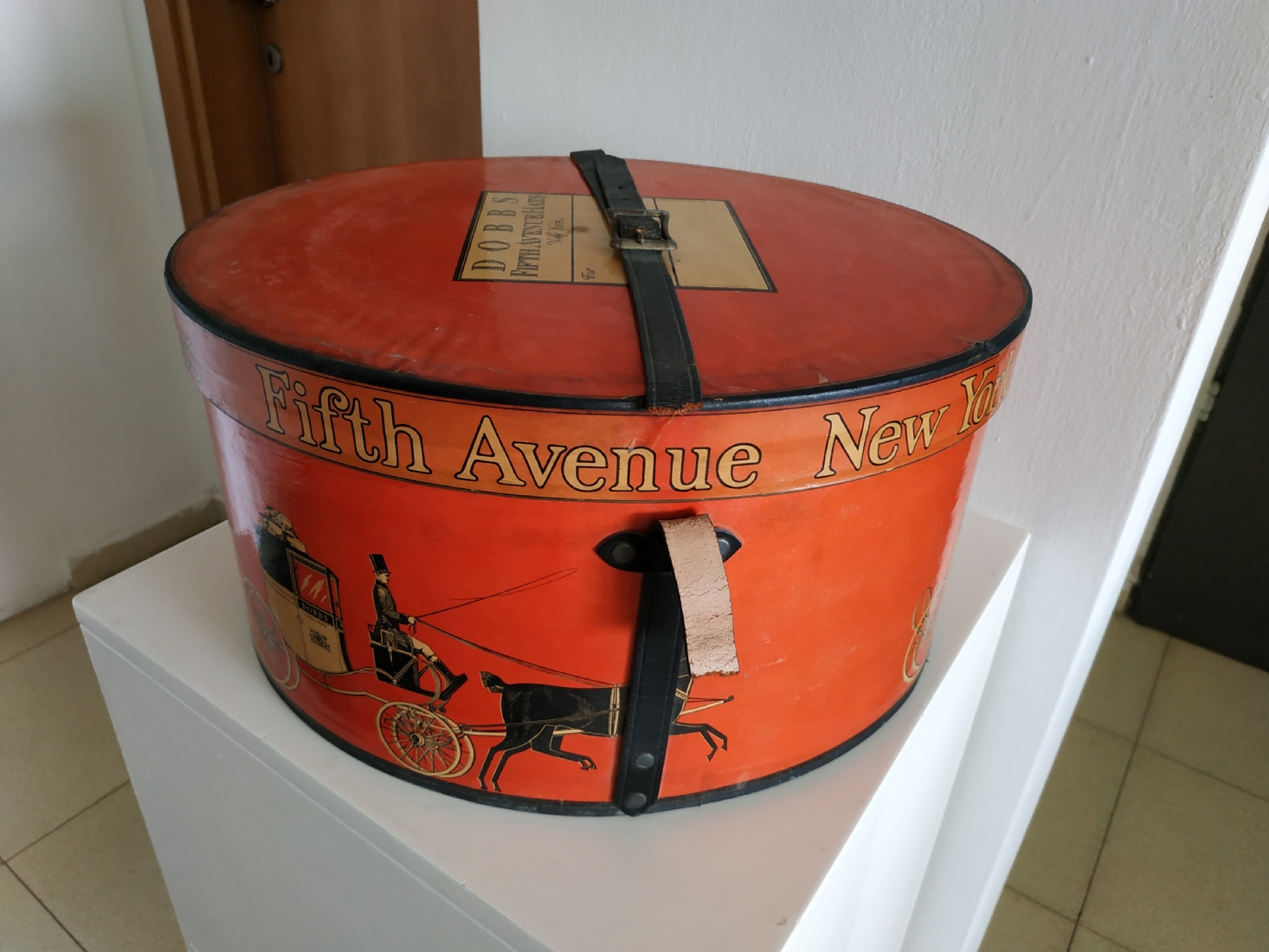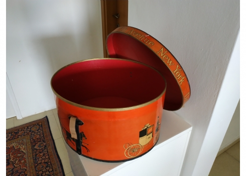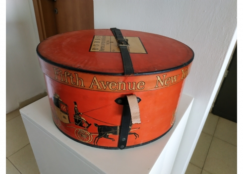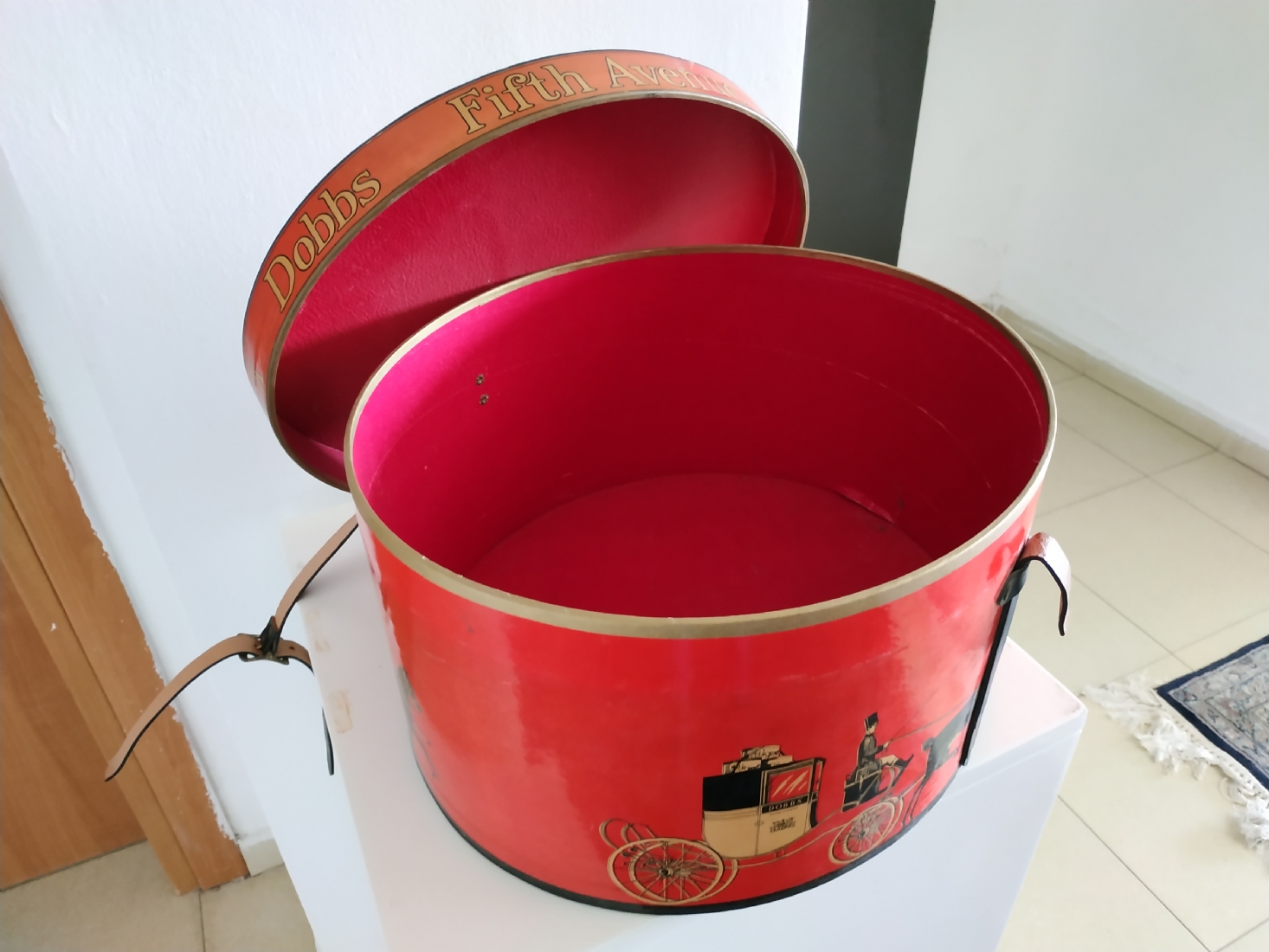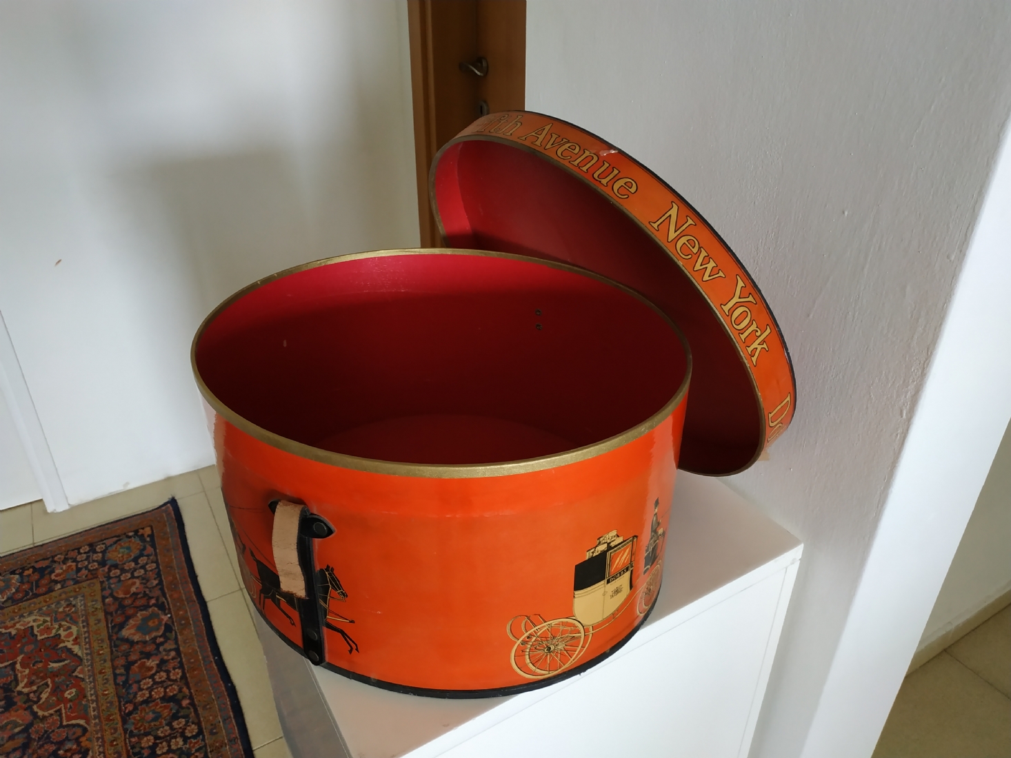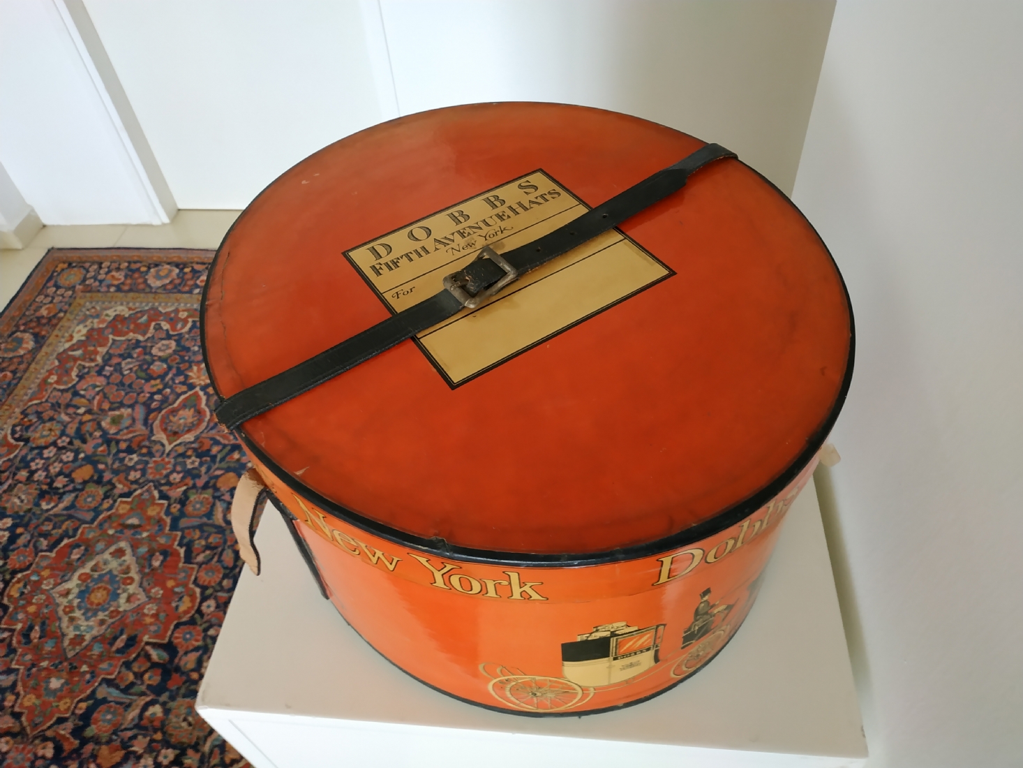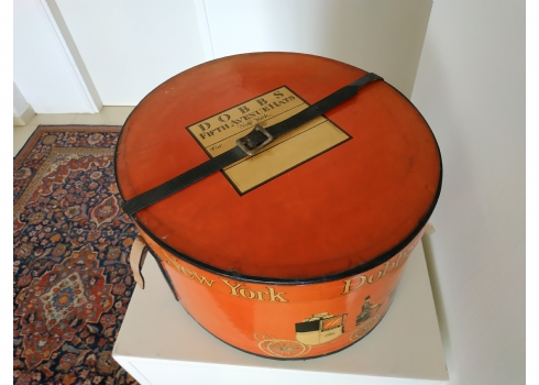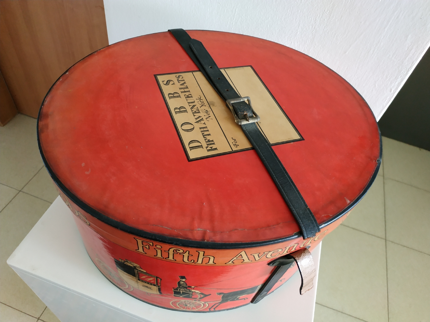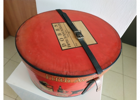 מספר הפריט בקטלוג 306פריט עיצובי נהדר למעצבי פנים - קופסא לכובע (לנסיעות), עשוי קרטון ורצועת עור (פגם לרצועה), גובה: 20 ס"מ, רוחב: 40 ס"מ.