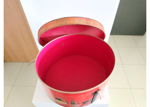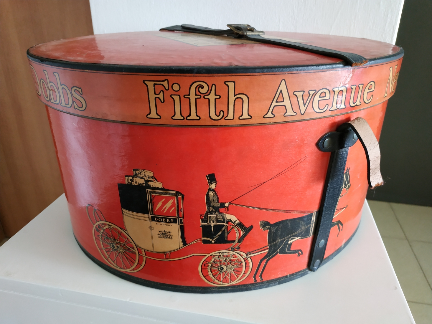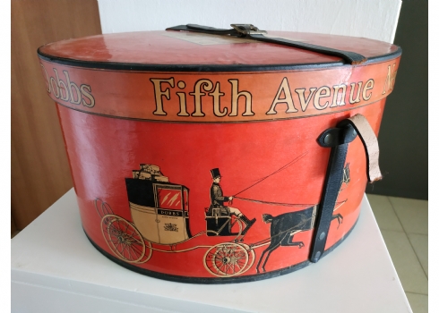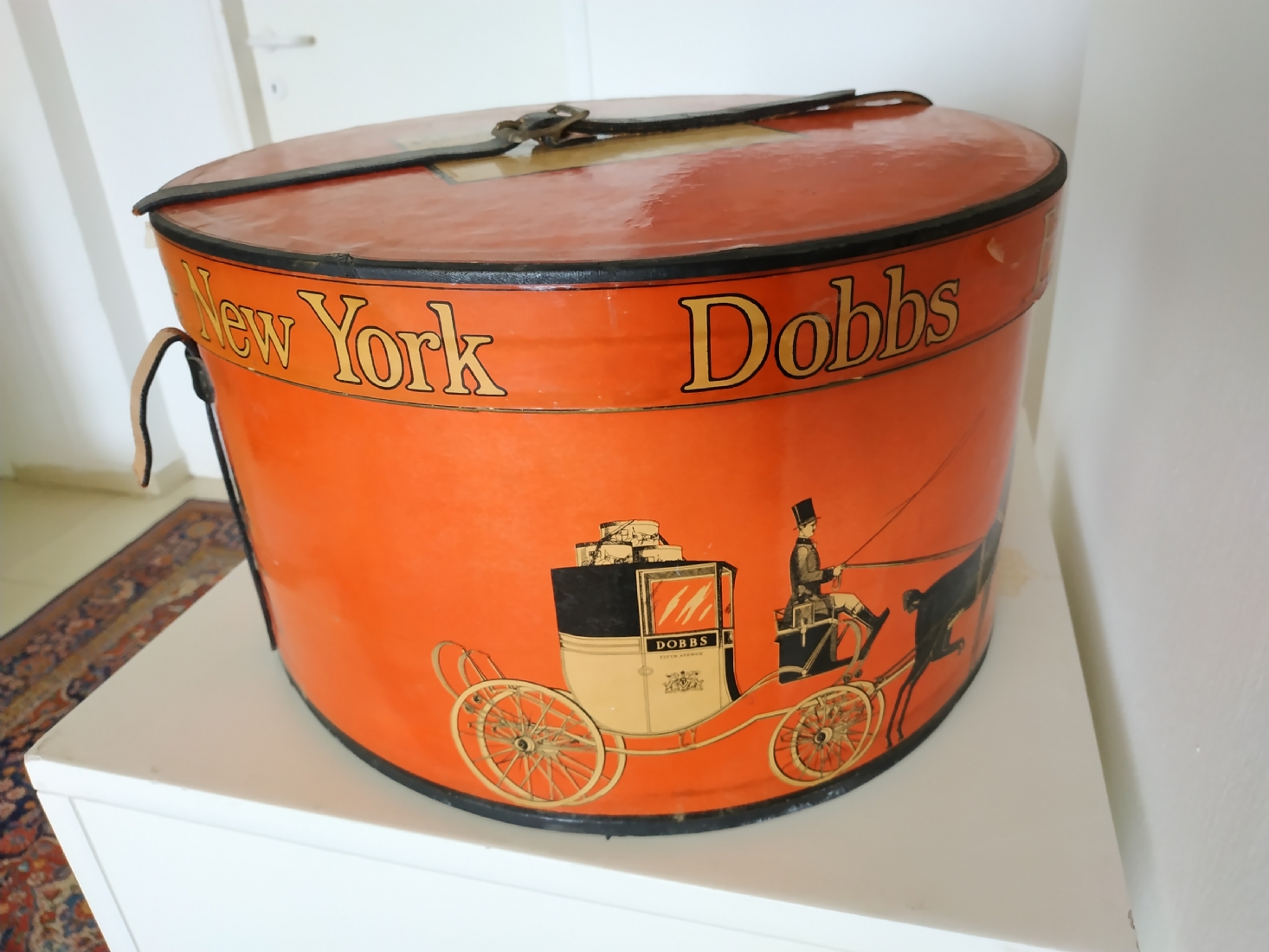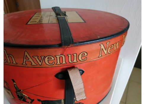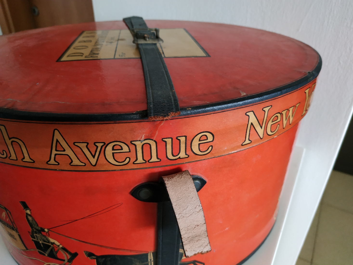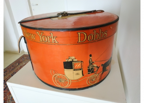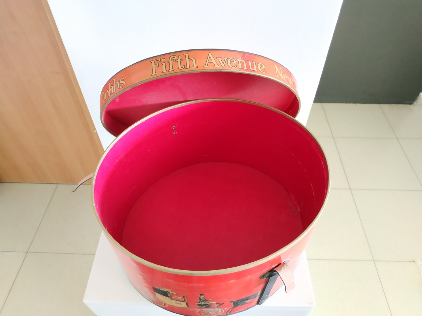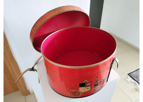 מספר הפריט בקטלוג 306פריט עיצובי נהדר למעצבי פנים - קופסא לכובע (לנסיעות), עשוי קרטון ורצועת עור (פגם לרצועה), גובה: 20 ס"מ, רוחב: 40 ס"מ.