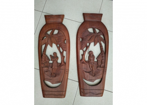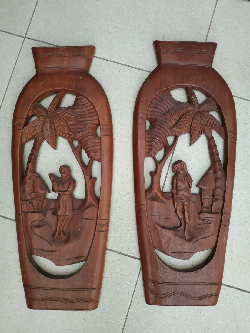 שני קישוטי קיר גדולים עשויים עץ מגולף, גובה: 56 ס"מ.