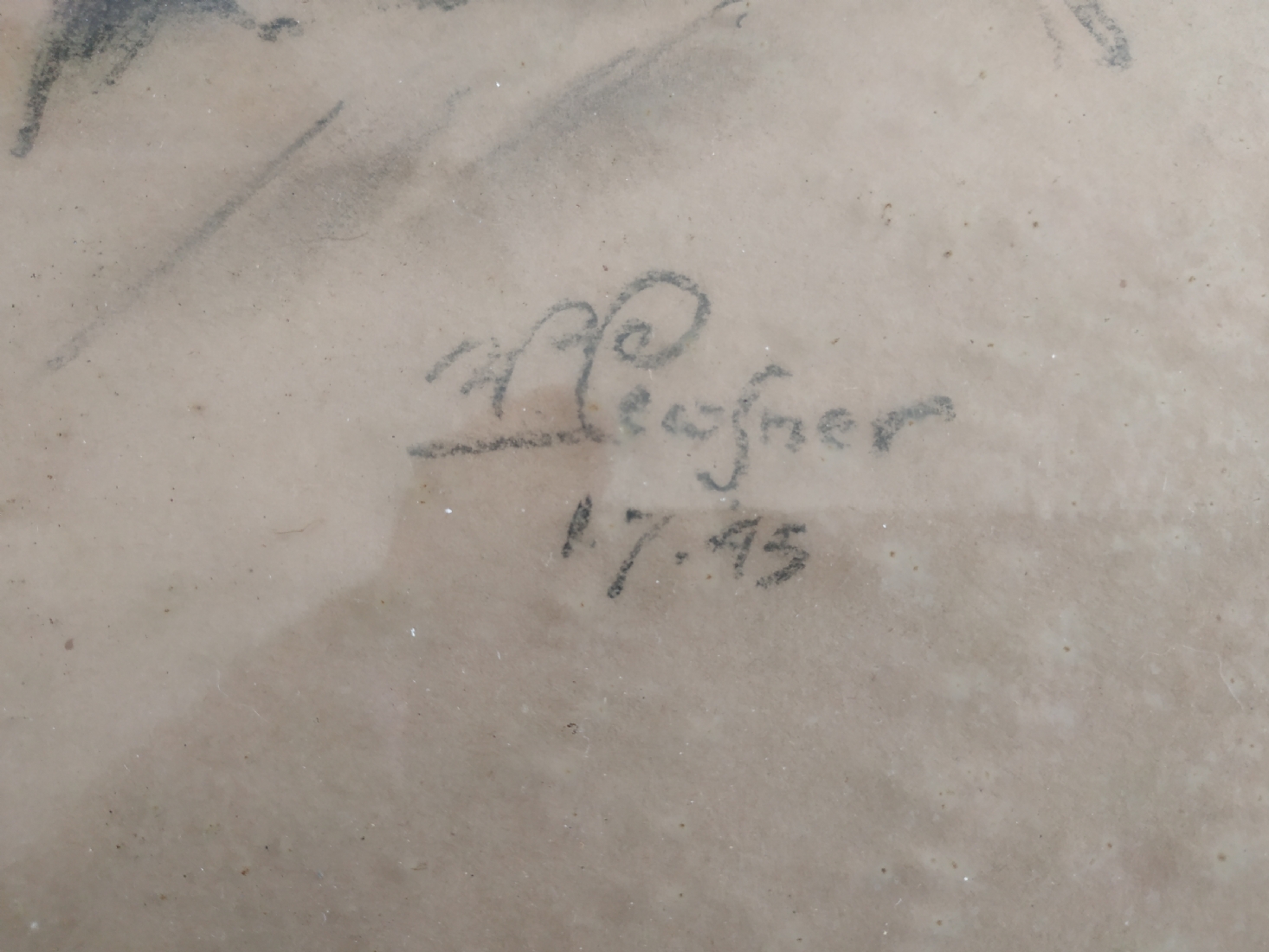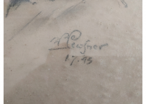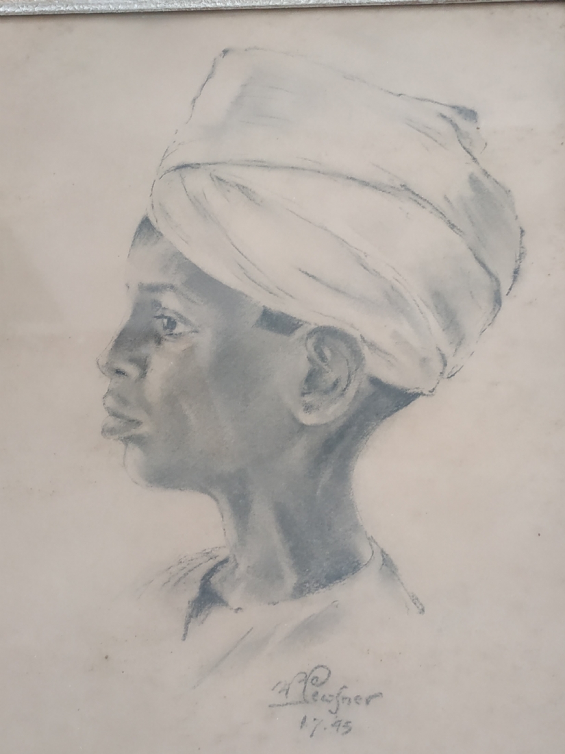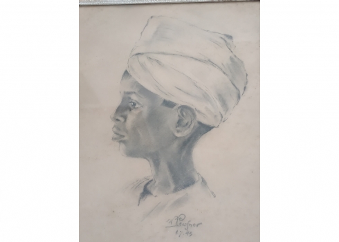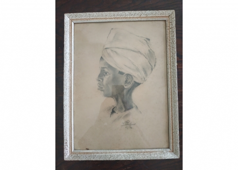 'ראש נער ערבי' - ציור ישן, גירי פחם על נייר, פגם לנייר בתחתית (מצולם), חתום ומתוארך: 1945, מידות: 40X30 ס"מ.