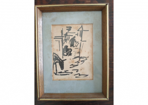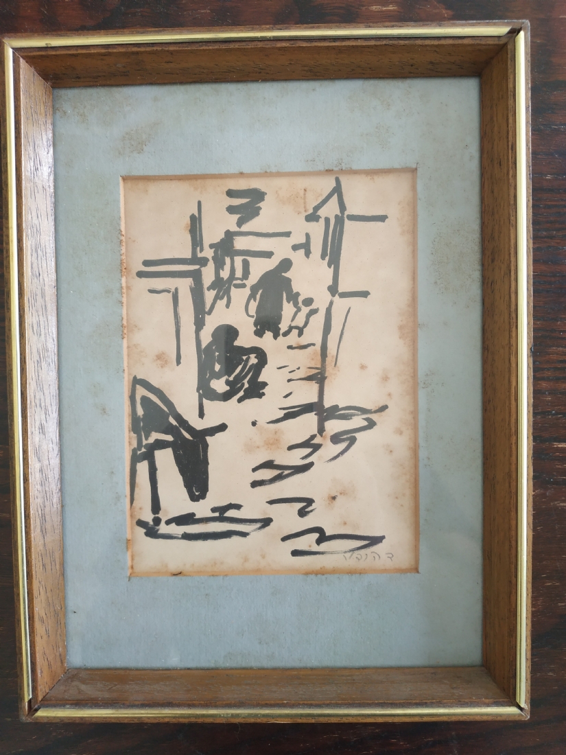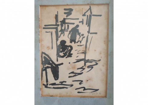 מספר הפריט בקטלוג 207דוד הנדלר (David Hendler) - 'שלוש דמויות וחמור' - ציור ישן, אקוורל על נייר, חתום, מידות: 17X13 ס"מ.
