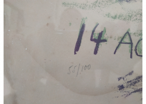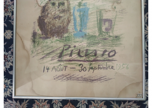 מספר הפריט בקטלוג 221פבלו פיקאסו - כרזה ישנה ‘Galerie 65 Cannes, 1956’, חתומה בעיפרון וממוספר: 55/100, כתמים, מידות: 76X56 ס"מ.