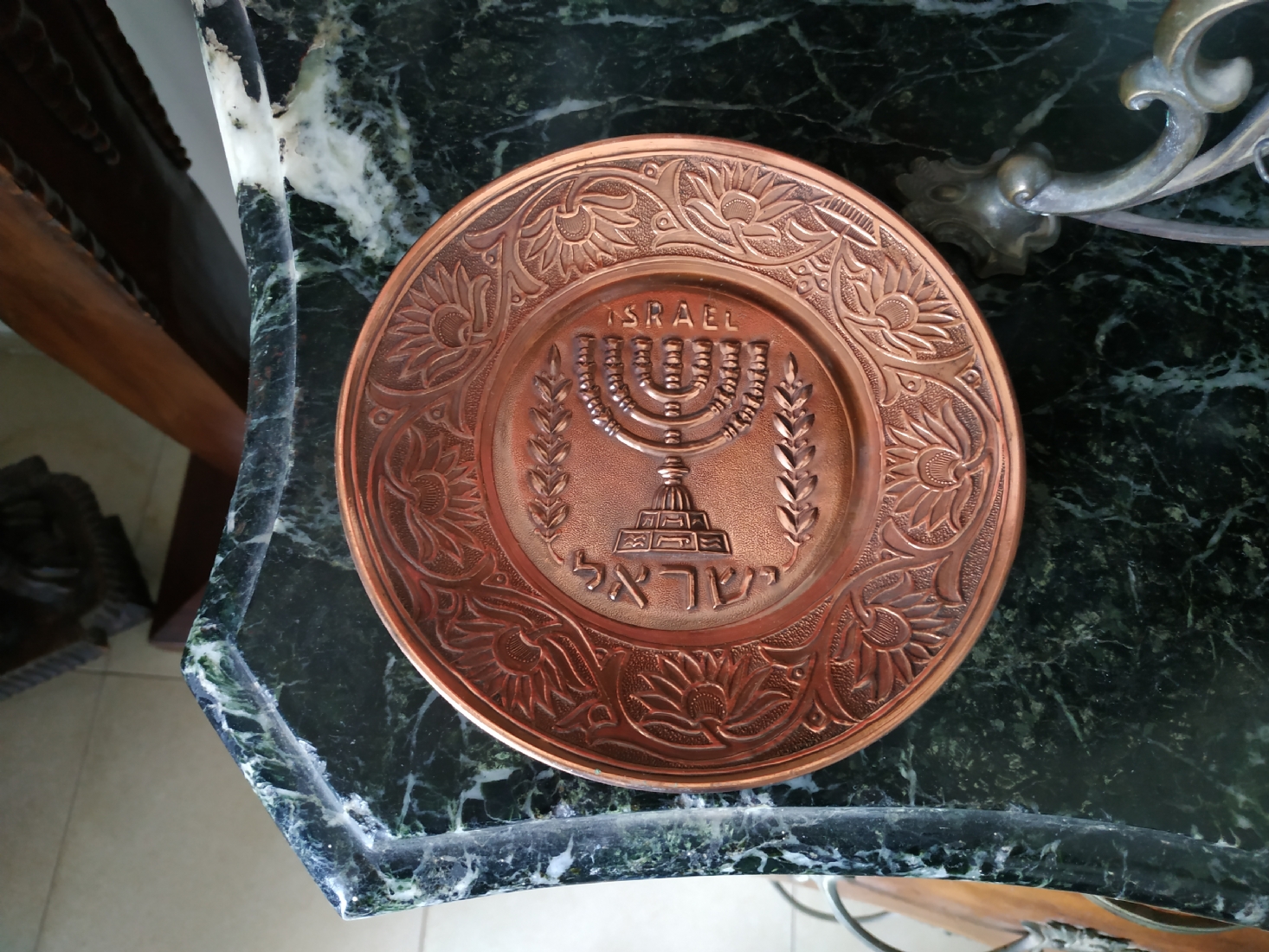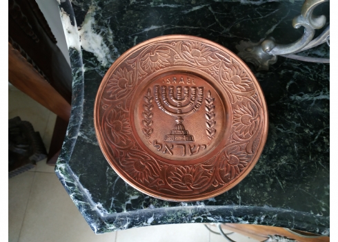 צלוחית נחושת ישראלית לתליה על הקיר, מעוטרת בסמל המדינ