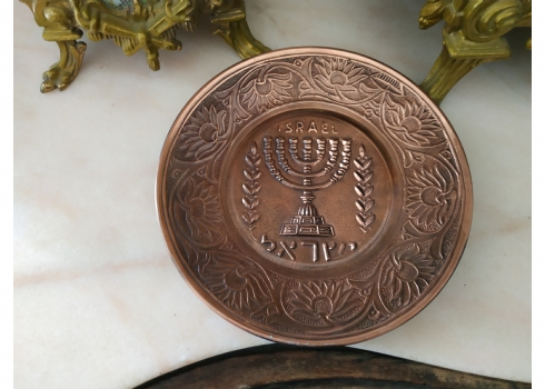 צלוחית נחושת ישראלית לתליה על הקיר, מעוטרת בסמל המדינה, קוטר: 15 ס"מ.