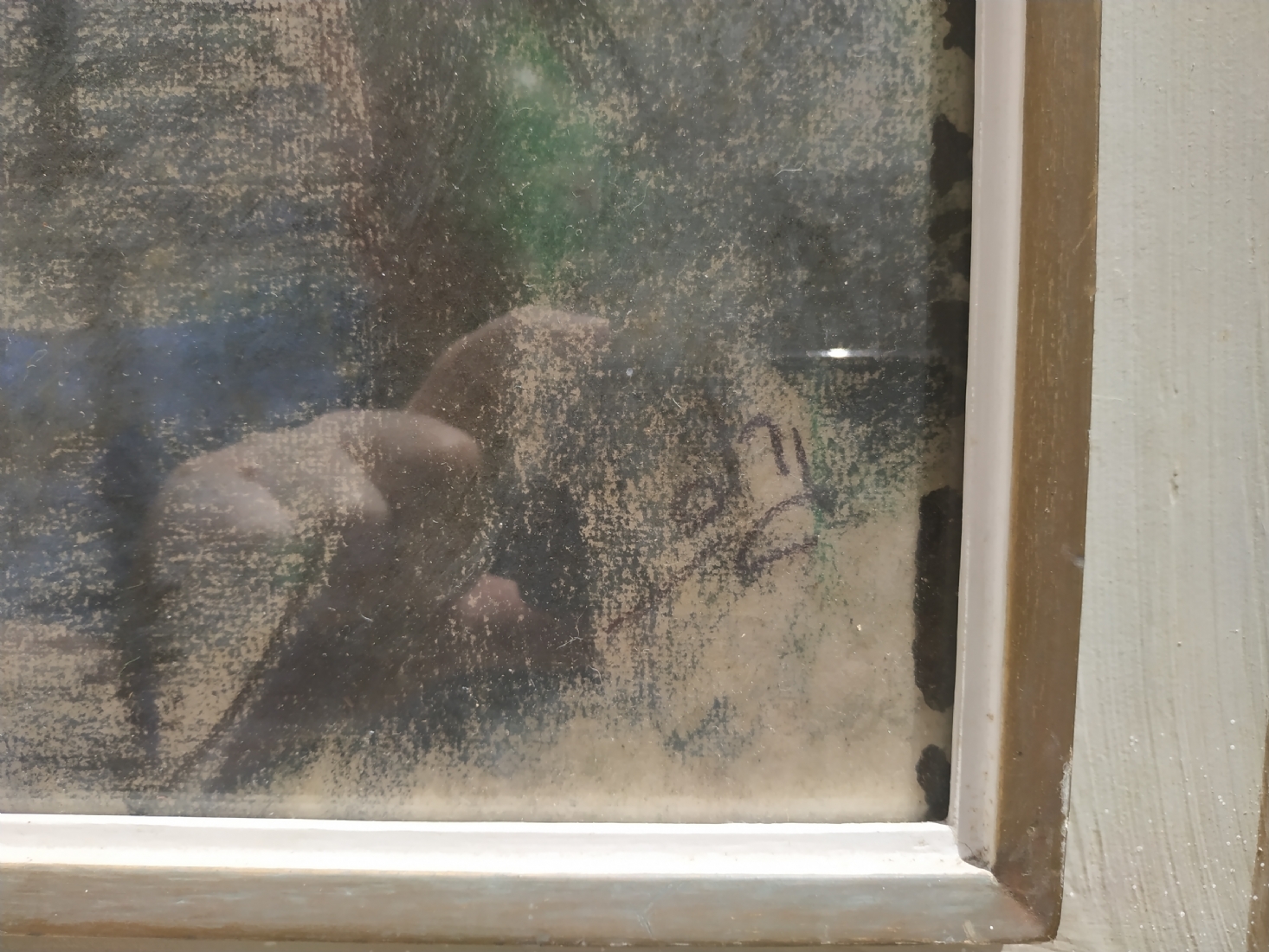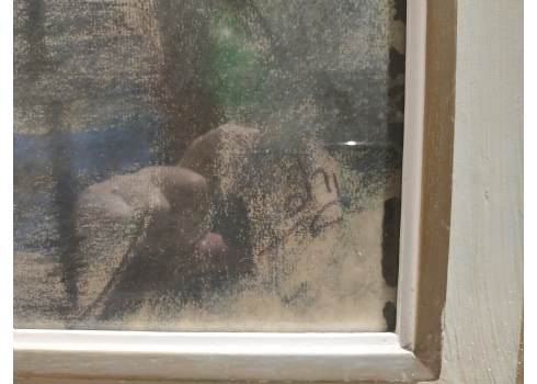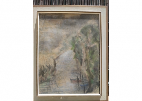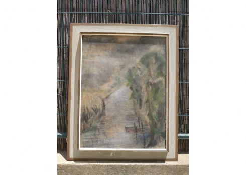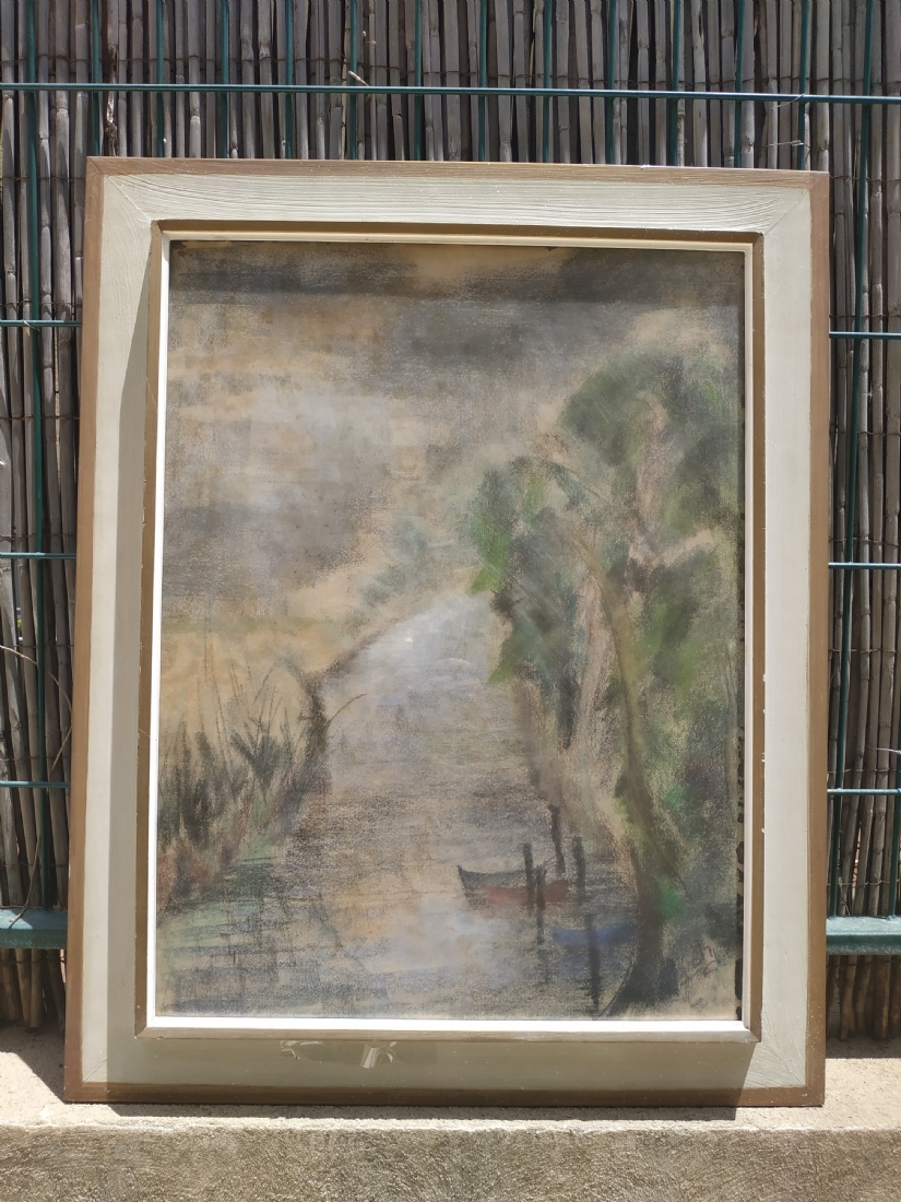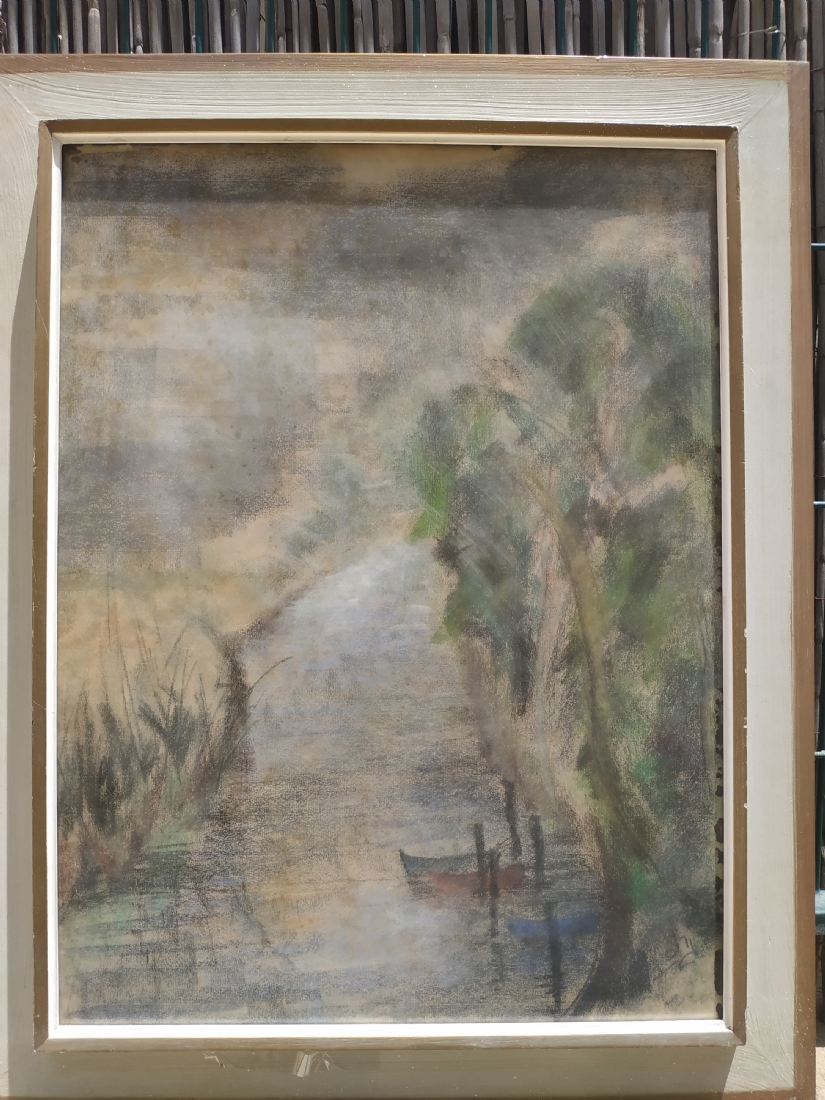 'סירה קשורה למזח' - ציור גדול, גירי פסטל על נייר, חתום: 'גרוס', מידות: 62X47 ס"מ.