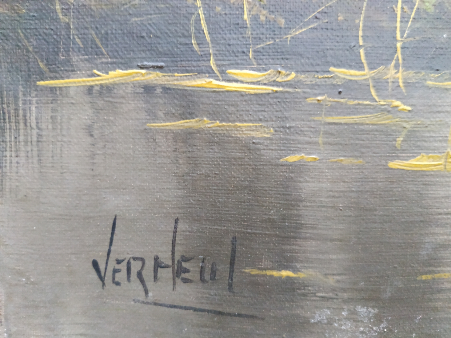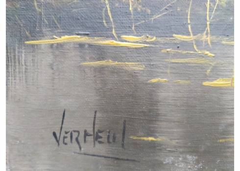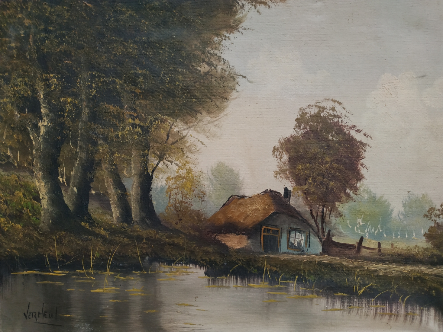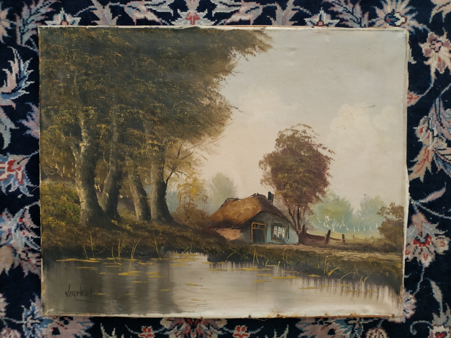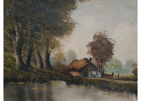 'בקתה בנוף חום' - ציור ישן, שמן על בד, חתום, מידות: 40X50 ס"מ.