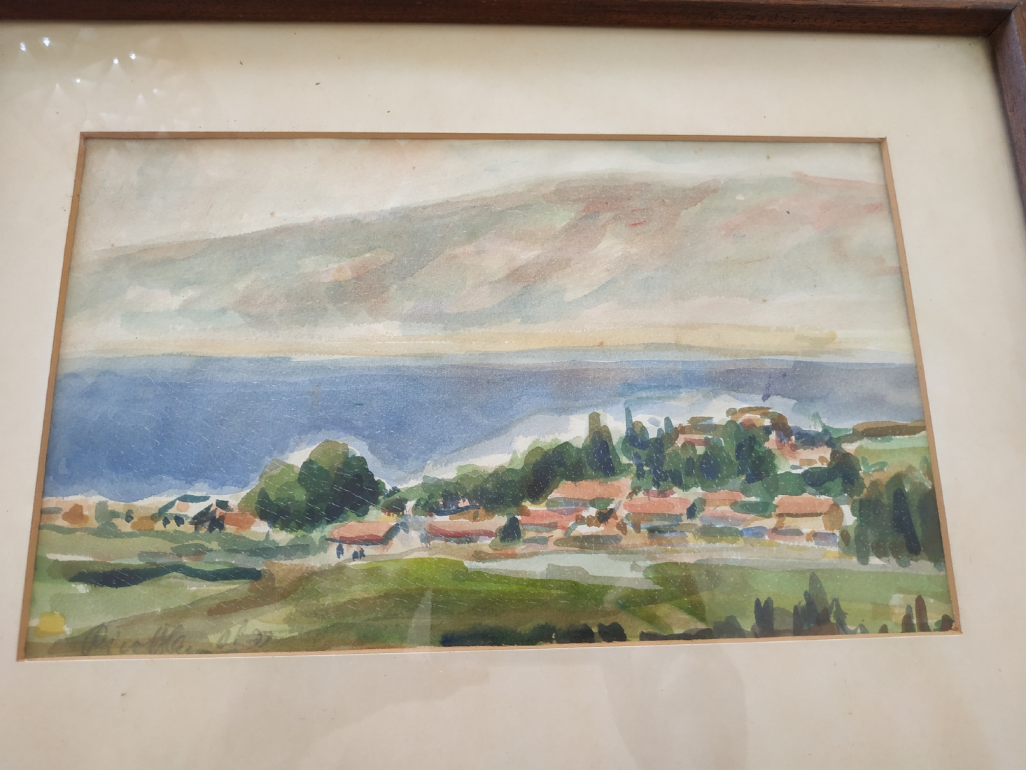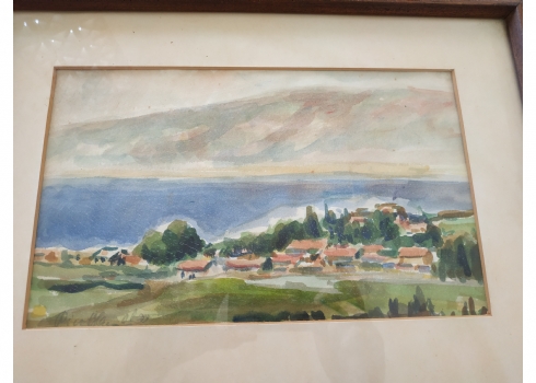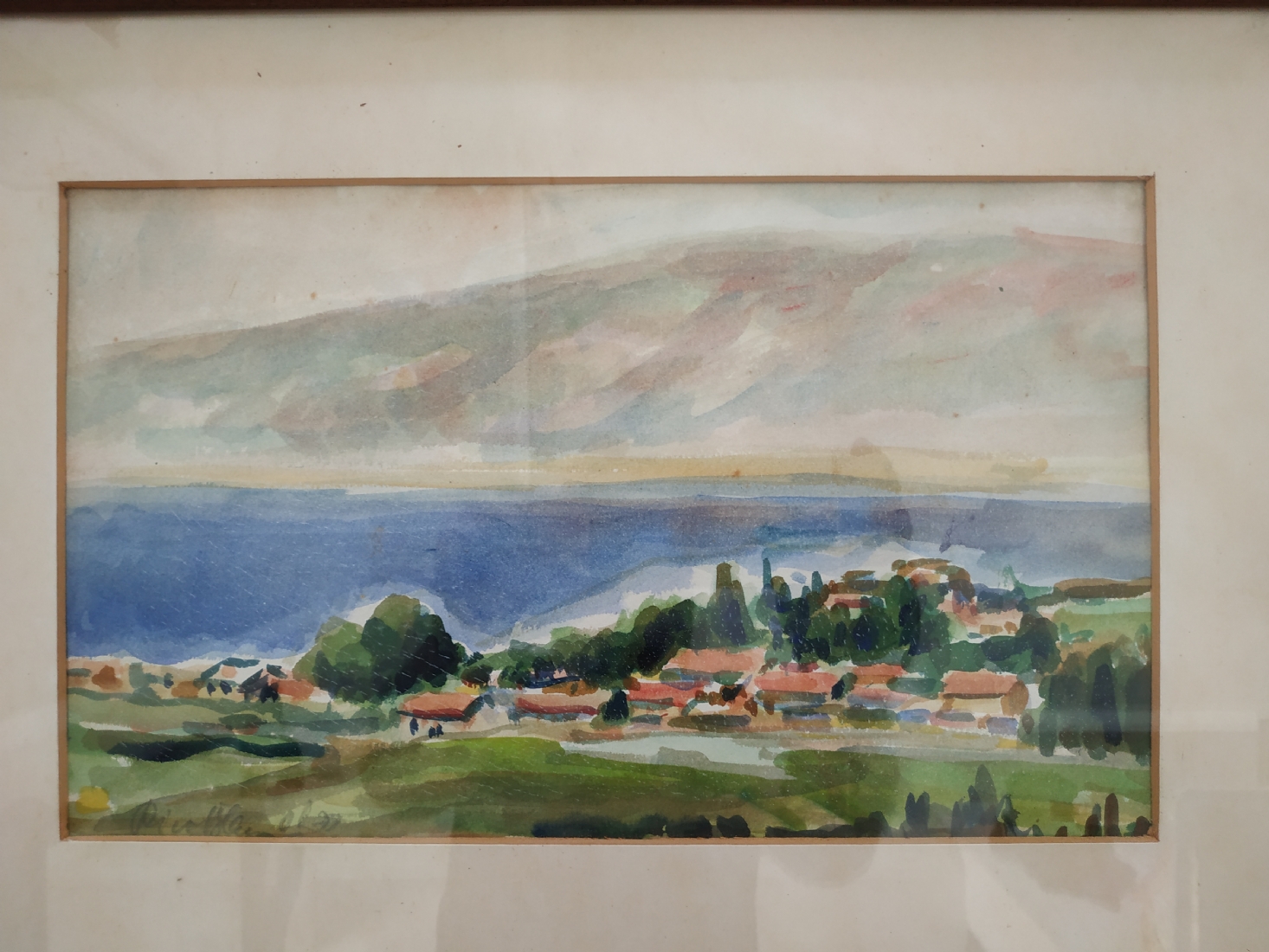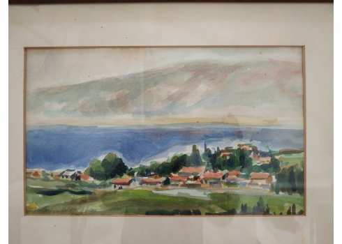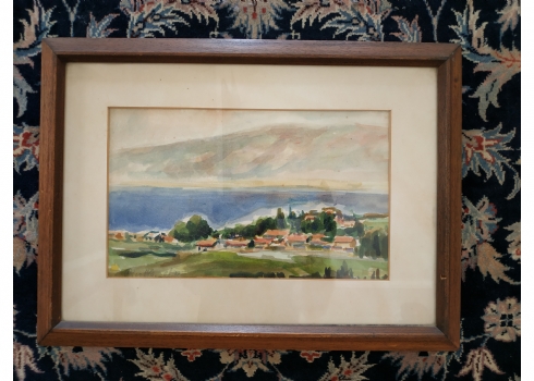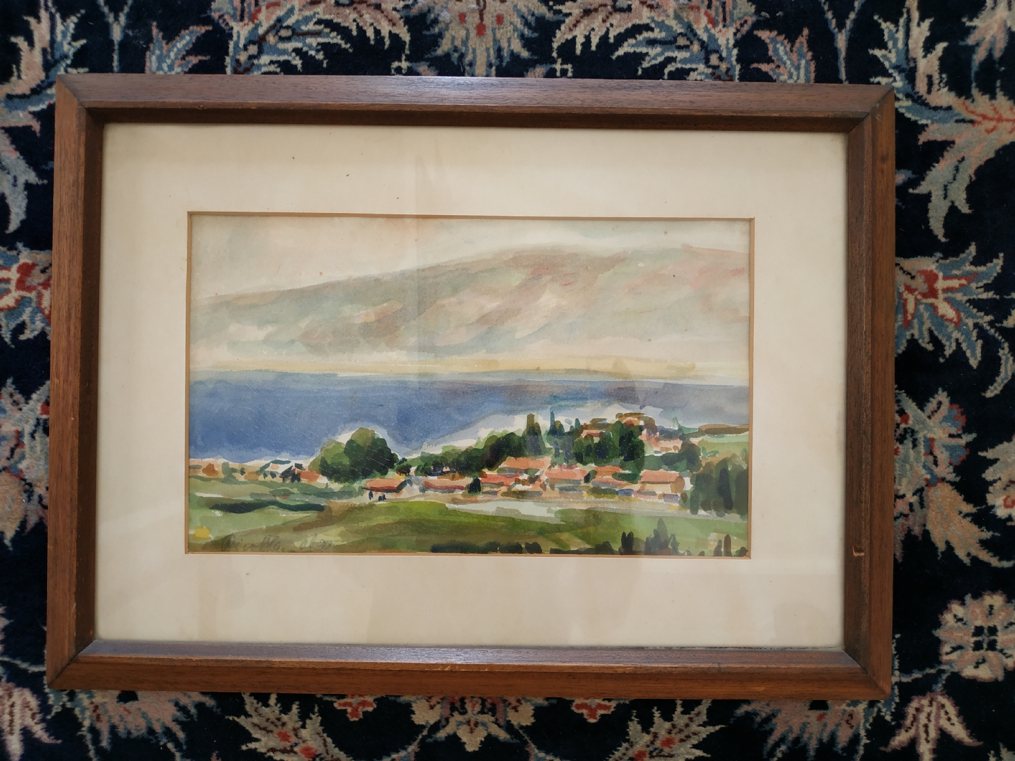 'נוף כינרת' - ציור ישן ויפה, אקוורל על נייר, חתום (נשמח לעזרה בזיהוי האמן), מידות: 19X31 ס"מ.