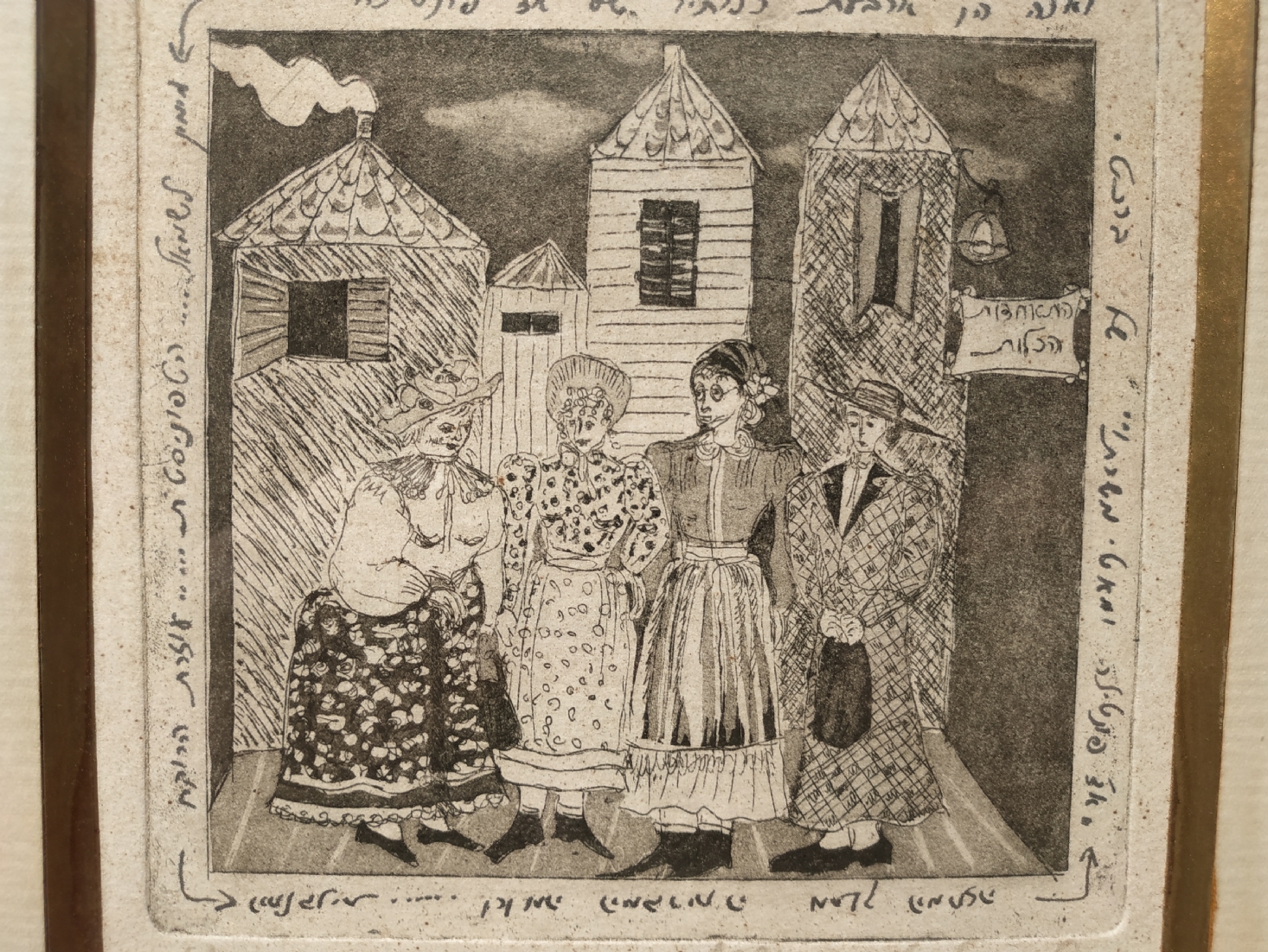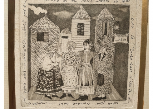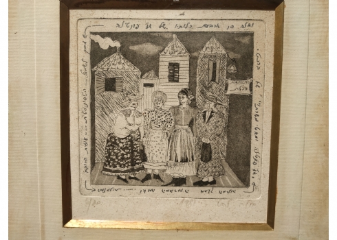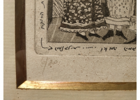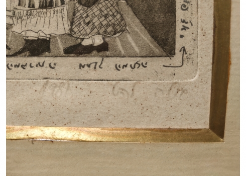 מספר הפריט בקטלוג 111גילה להט - 'ארבע כלותיו של אדון פונטילה' - תצריב על נייר, חתום, נושא את שם היצירה מתוך :'אדון פונטילא ומאטי משרתו' (קומדיה אפית, פרי עטו של המחזאי הגרמני המודרני ברטולט ברכט)מתוארך לשנת 1981 וממוספר: 6/20, מידות: 18X18 ס"מ.