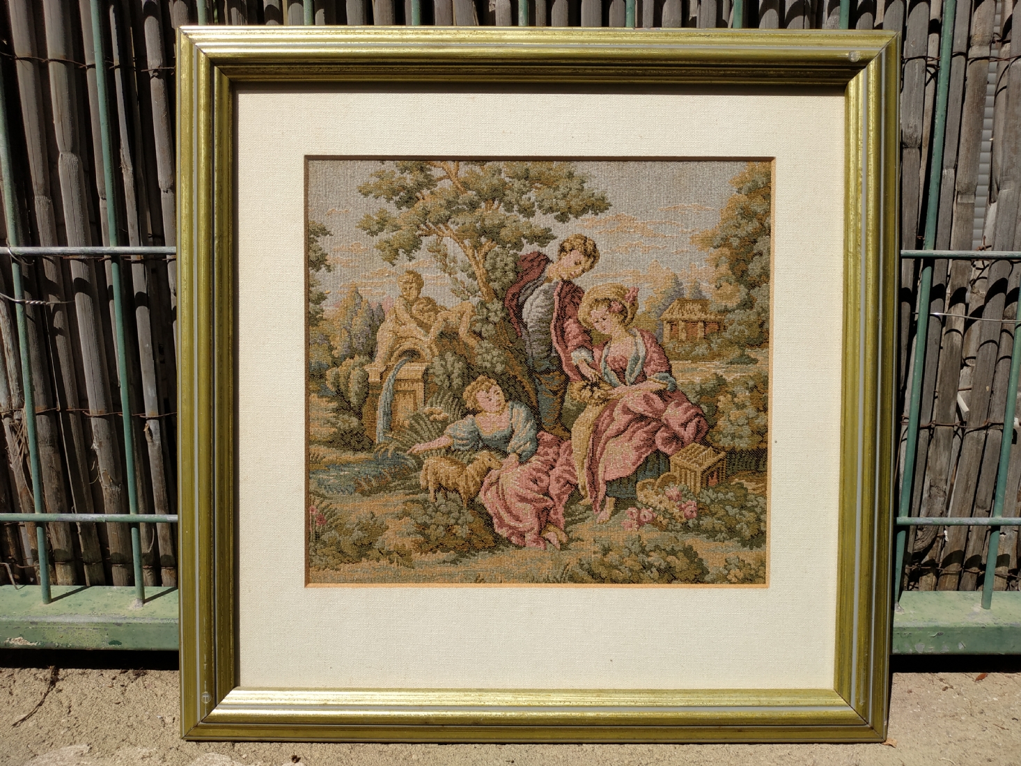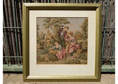 אריג גובלן מעוטר בסצנה גאלנטית רומנטית, ממוסגר, מידות המסגרת: 36X36 ס"מ.