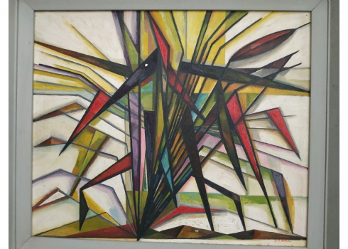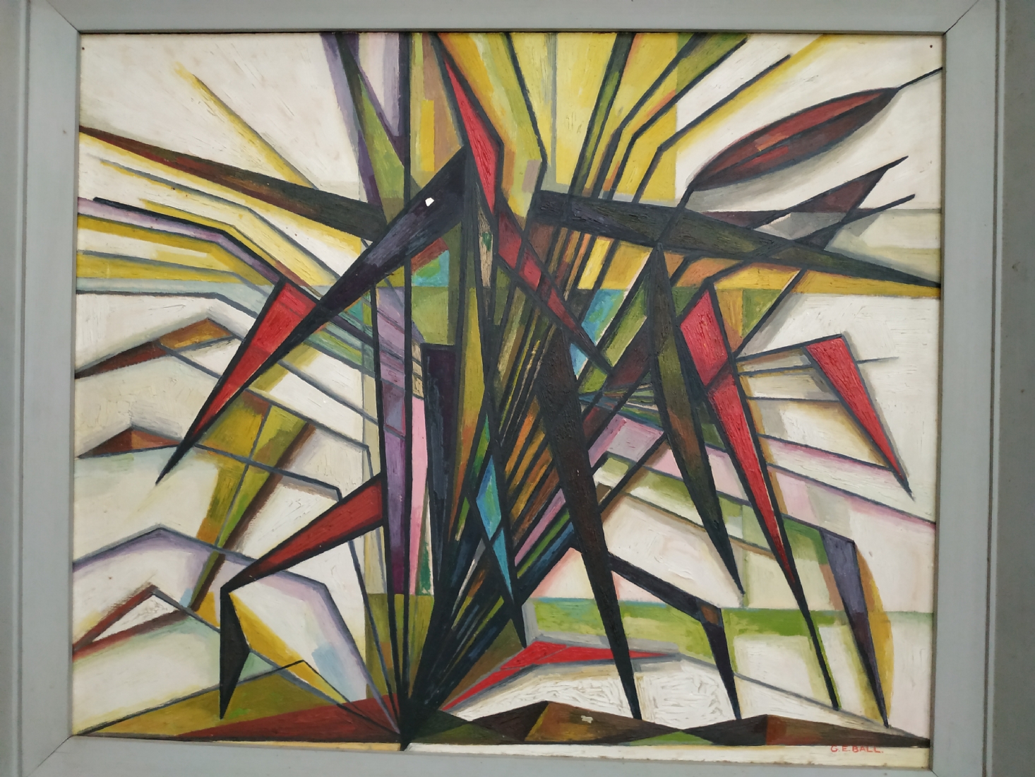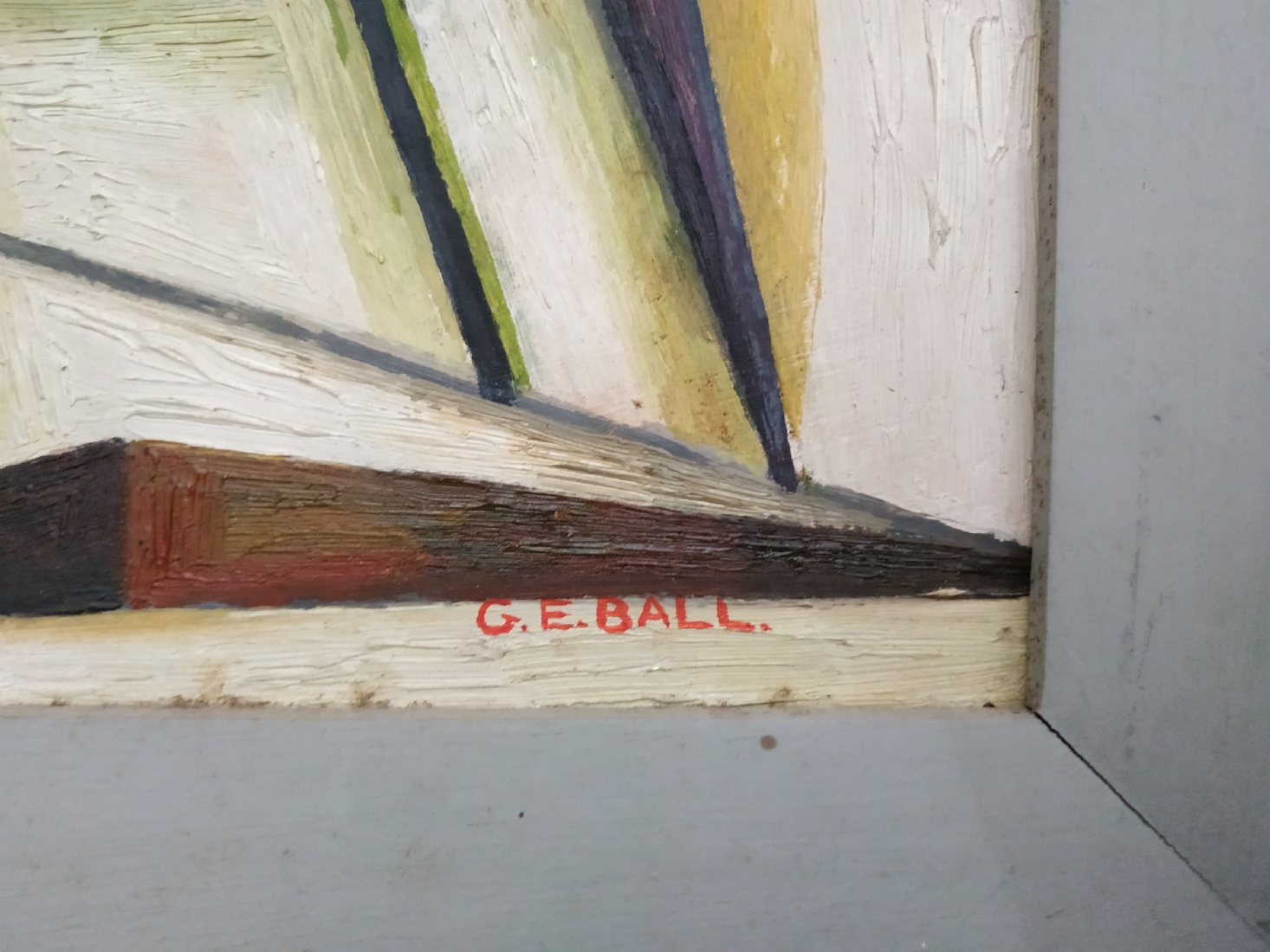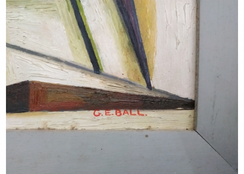 'קני סוף' - ציור ישן, שמן על לוח, חתום: 'G. E. Ball' (כפי הנראה George Edward BALL יליד 1875, אנגליה), קילוף צבע במרכז הציור (מצולם - נקודה לבנה במרכז), מידות: 51X60 ס"מ.