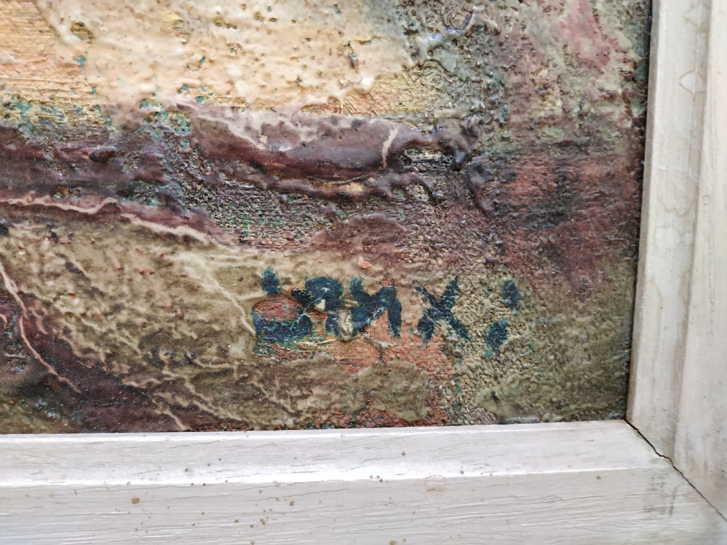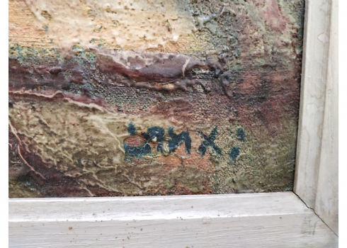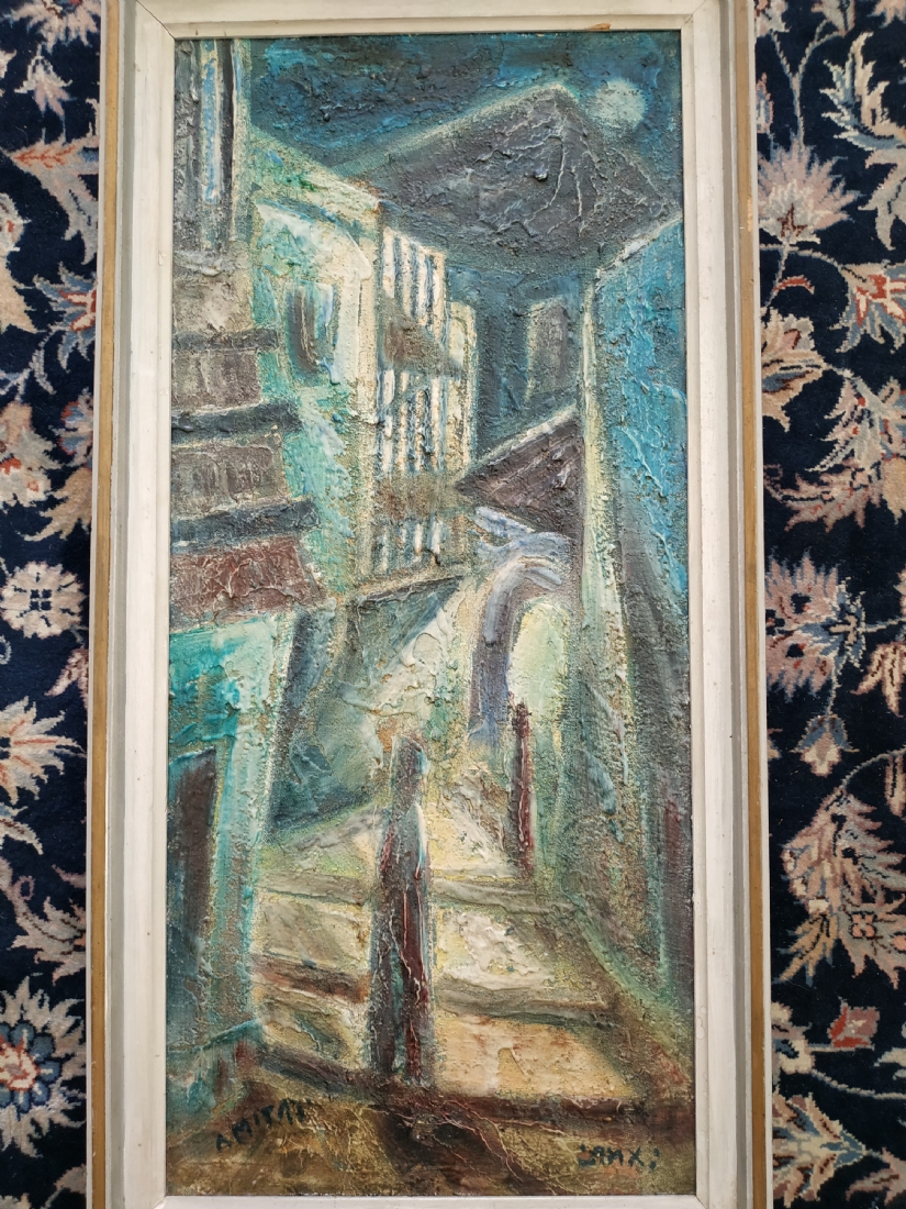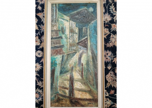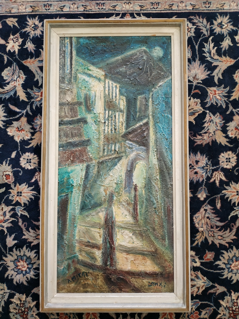 יצחק אמיתי (Yitzhak Amitai) - 'דמויות בסמטה בצפת' - ציור ישן, שמן על בד, חתום, מידות: 75X34 ס"מ.