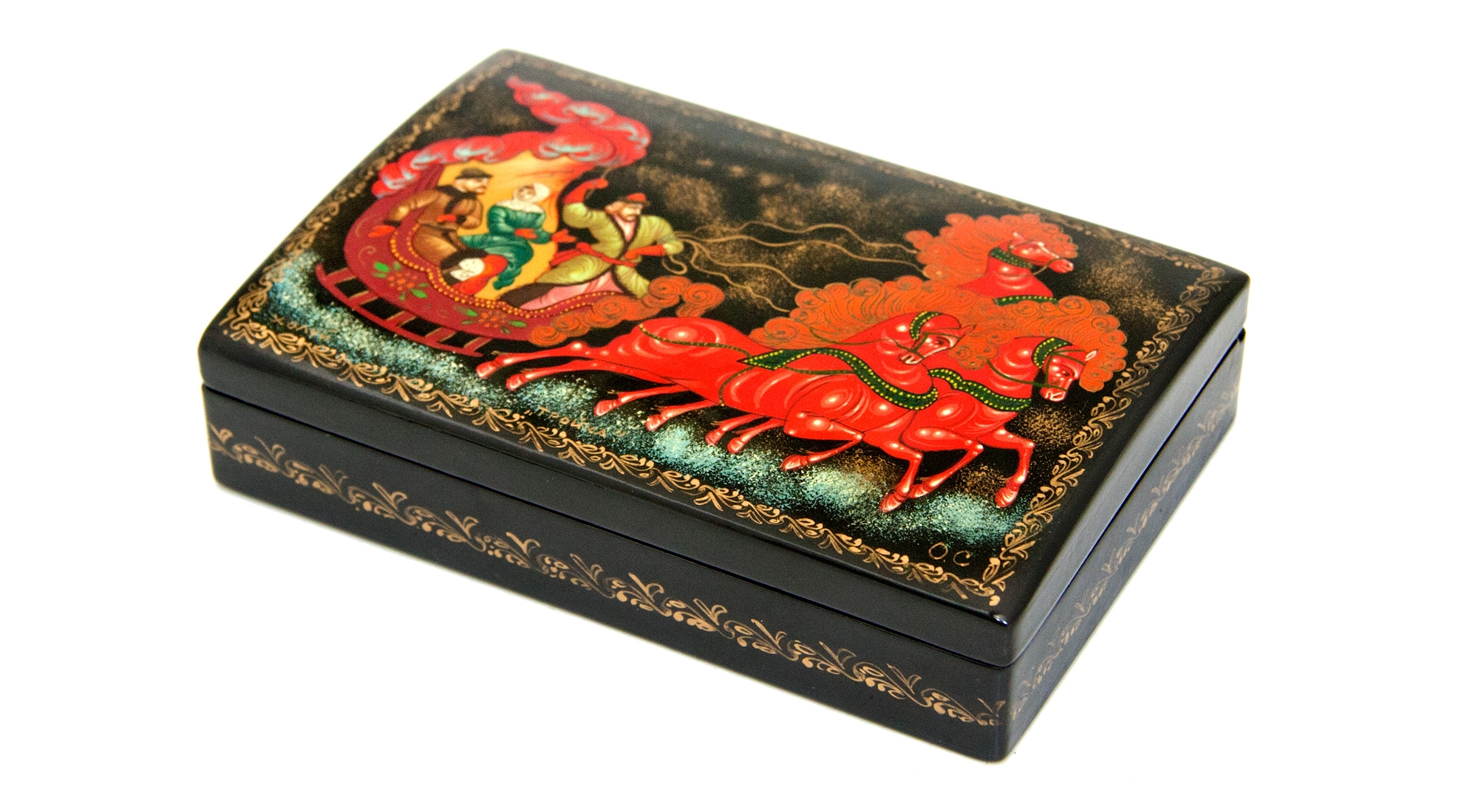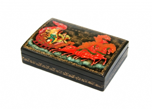 קופסת 'פלך' רוסית, מצוירת ביד, על רקגע לכה שחורה, חתומה, אורך: 15 ס"מ.