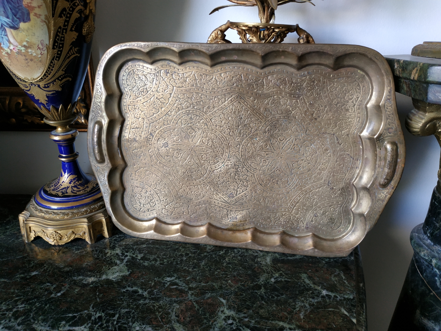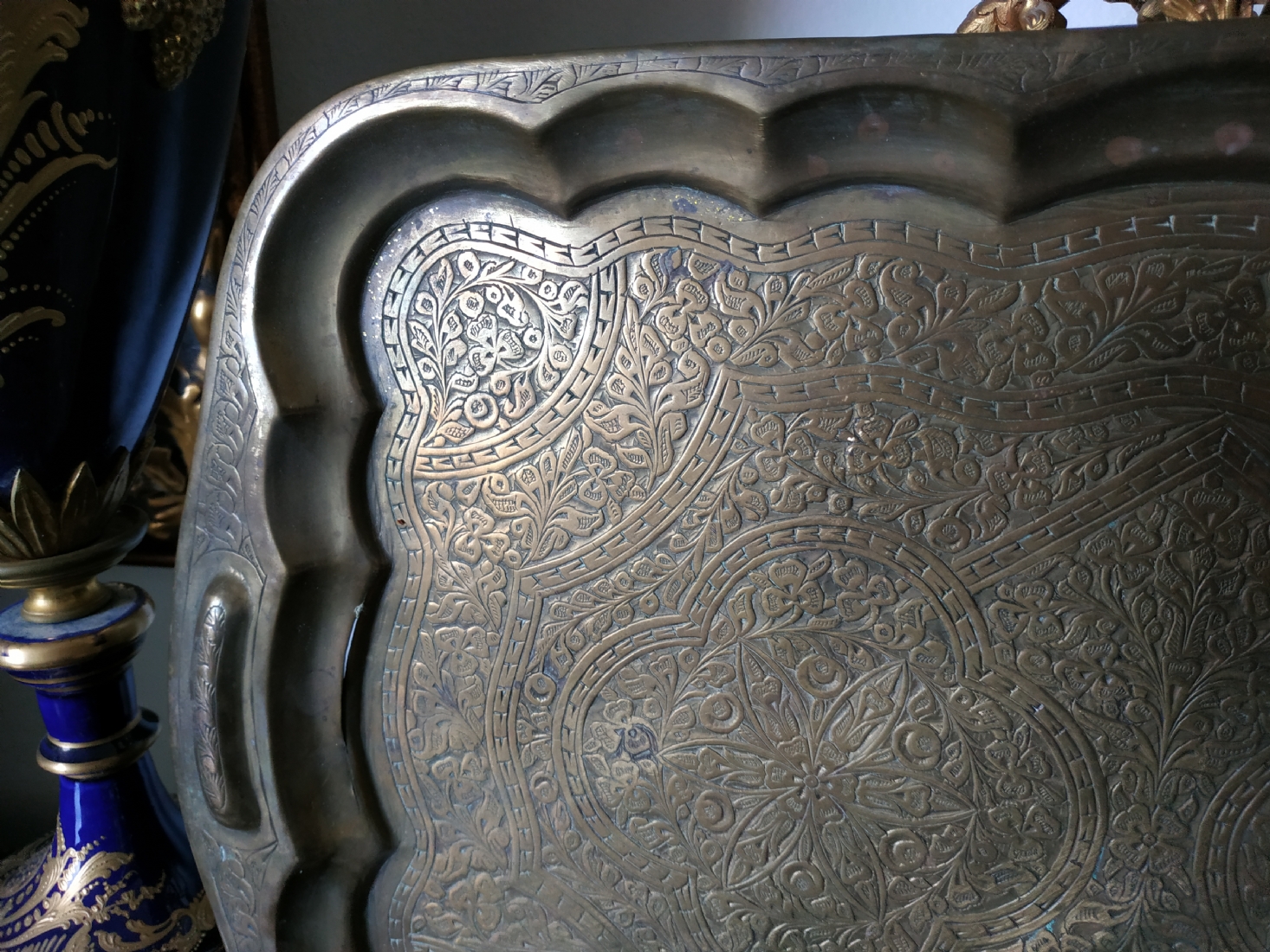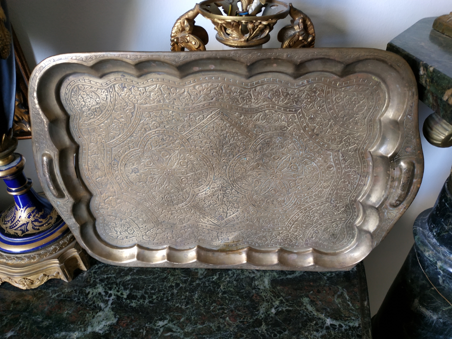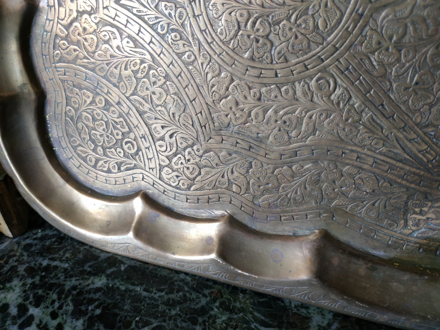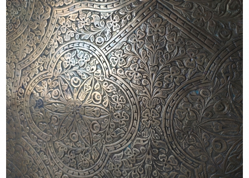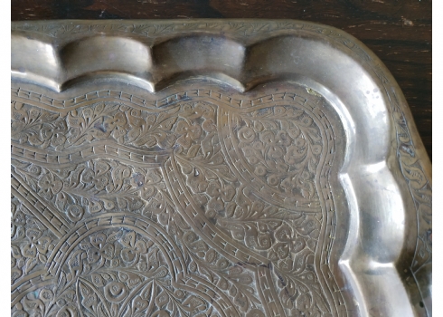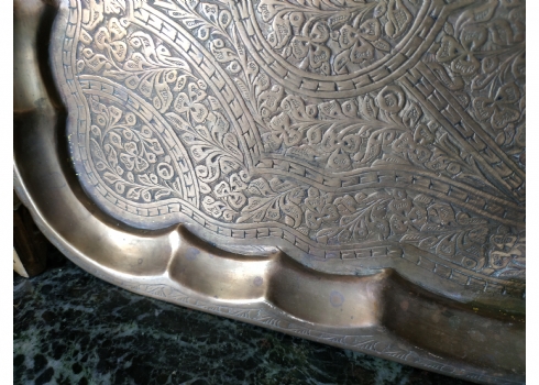 מגש הודי ישן, עשוי פליז מרוקע בעבודת יד אמן