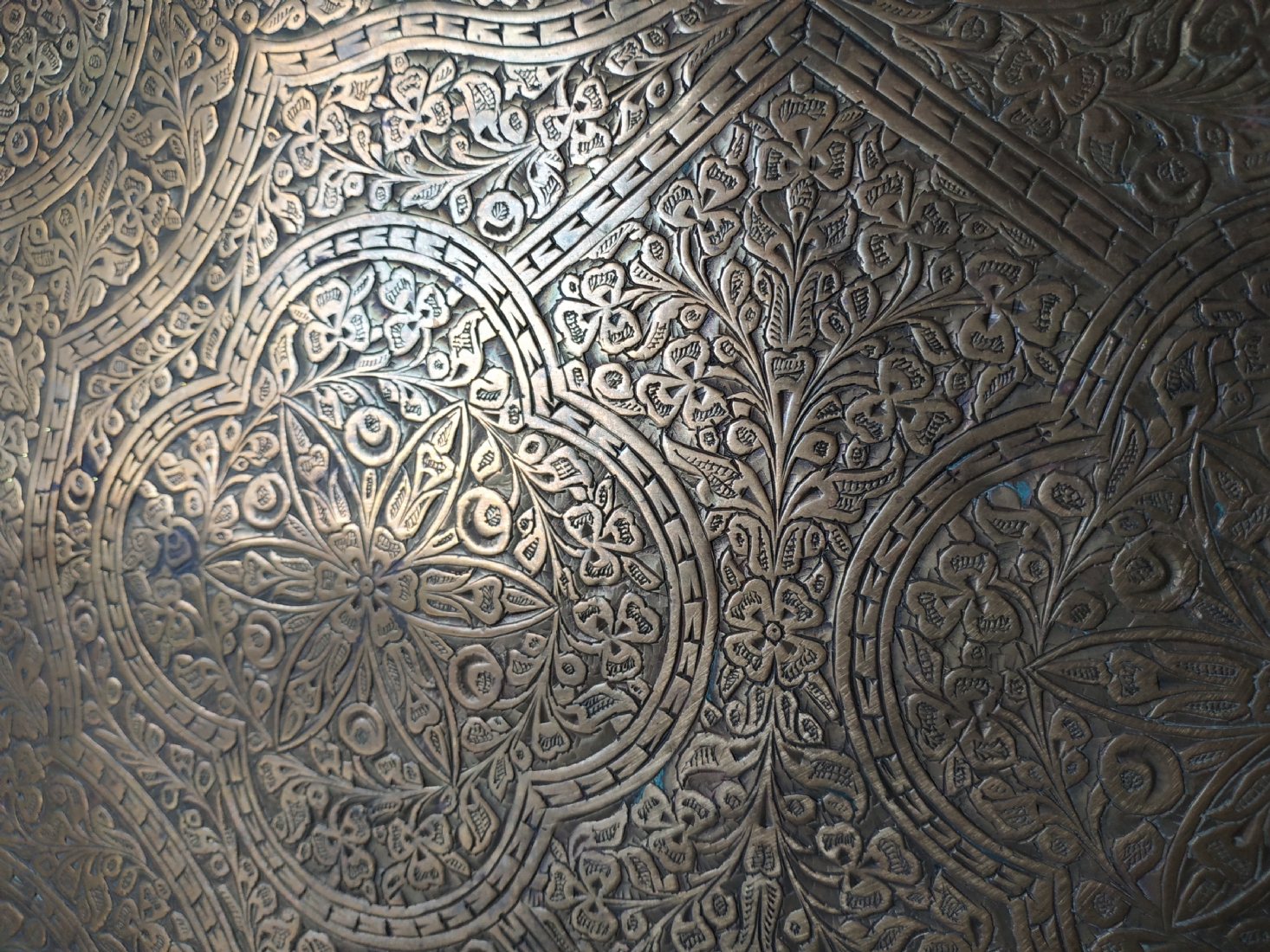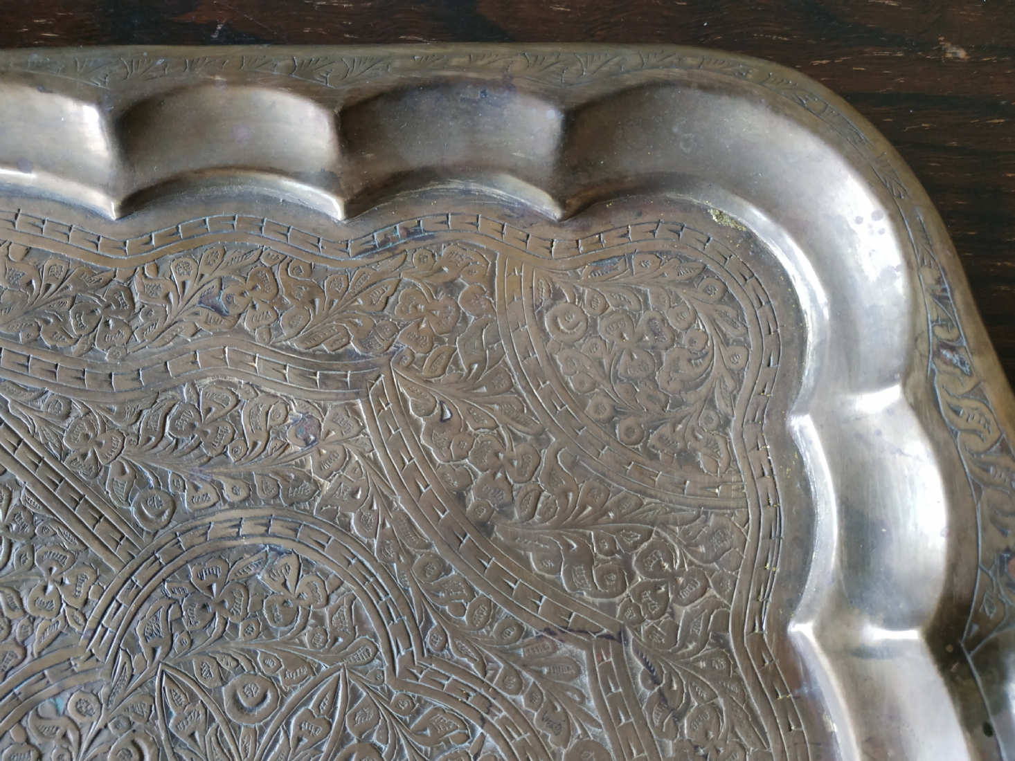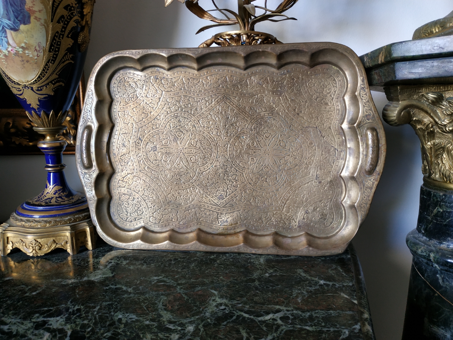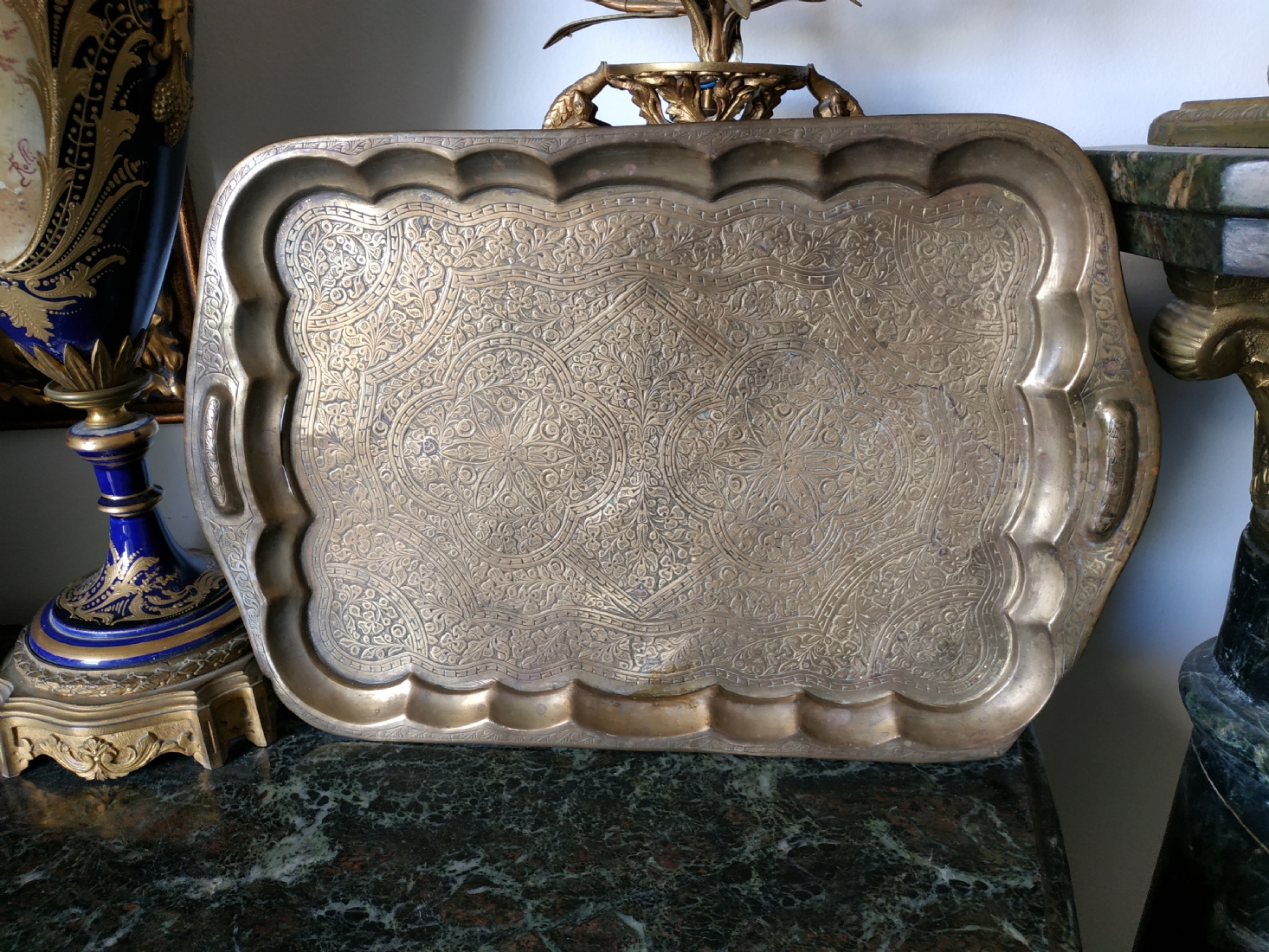 מגש הודי ישן, עשוי פליז מרוקע בעבודת יד אמן