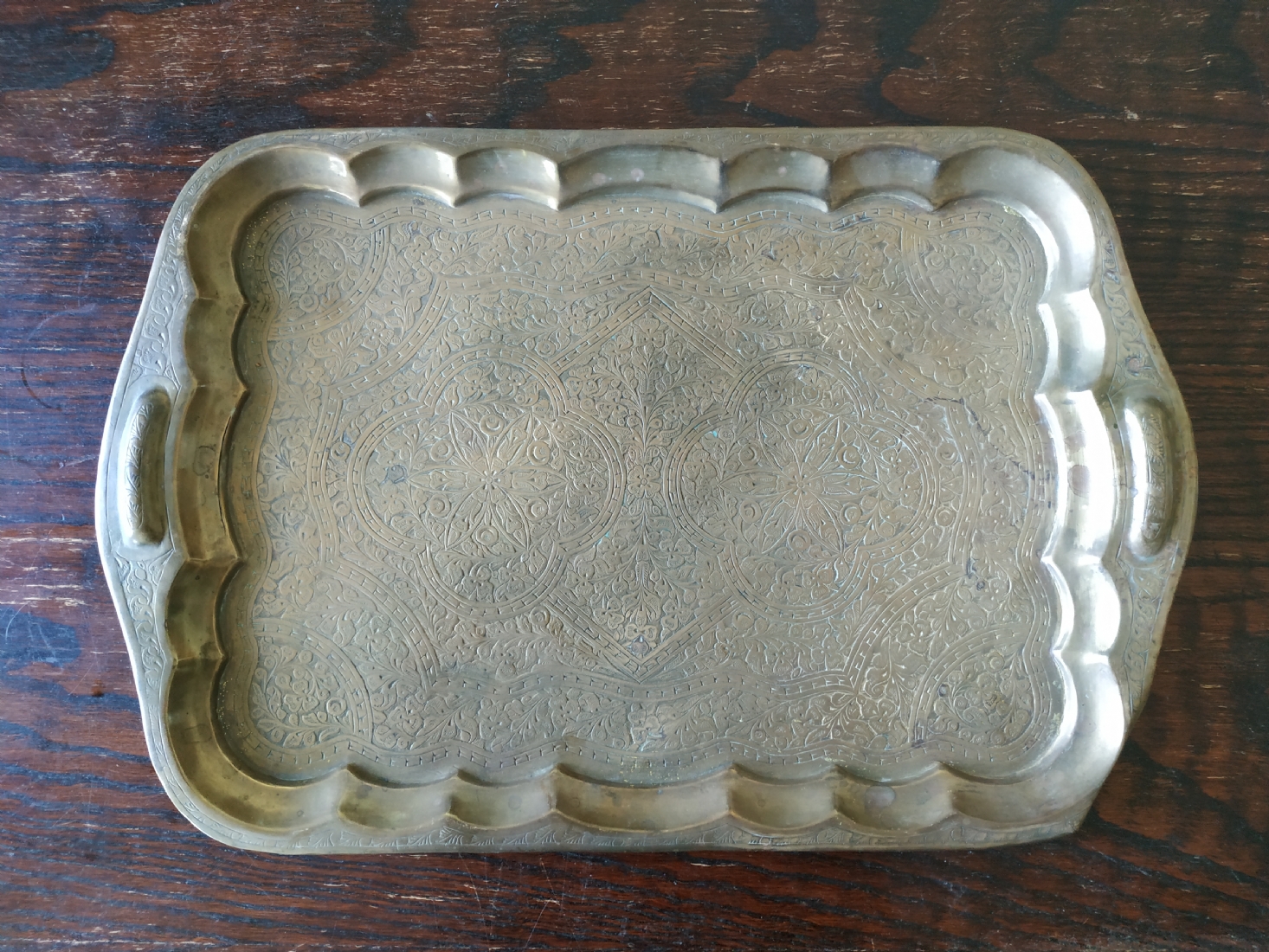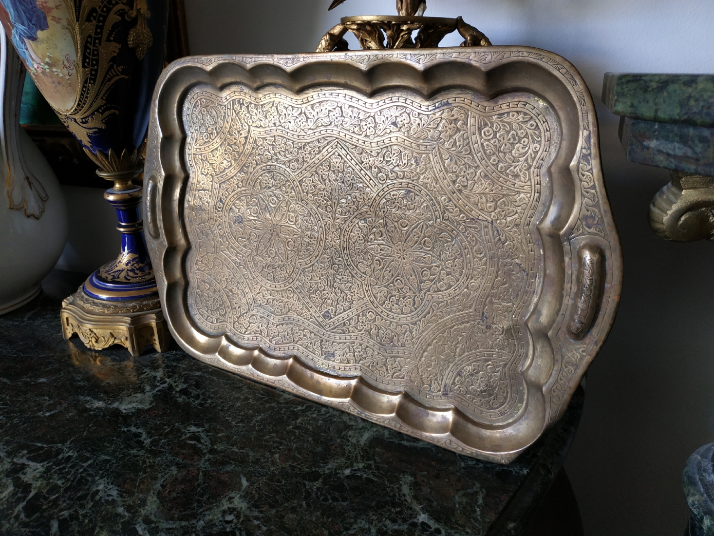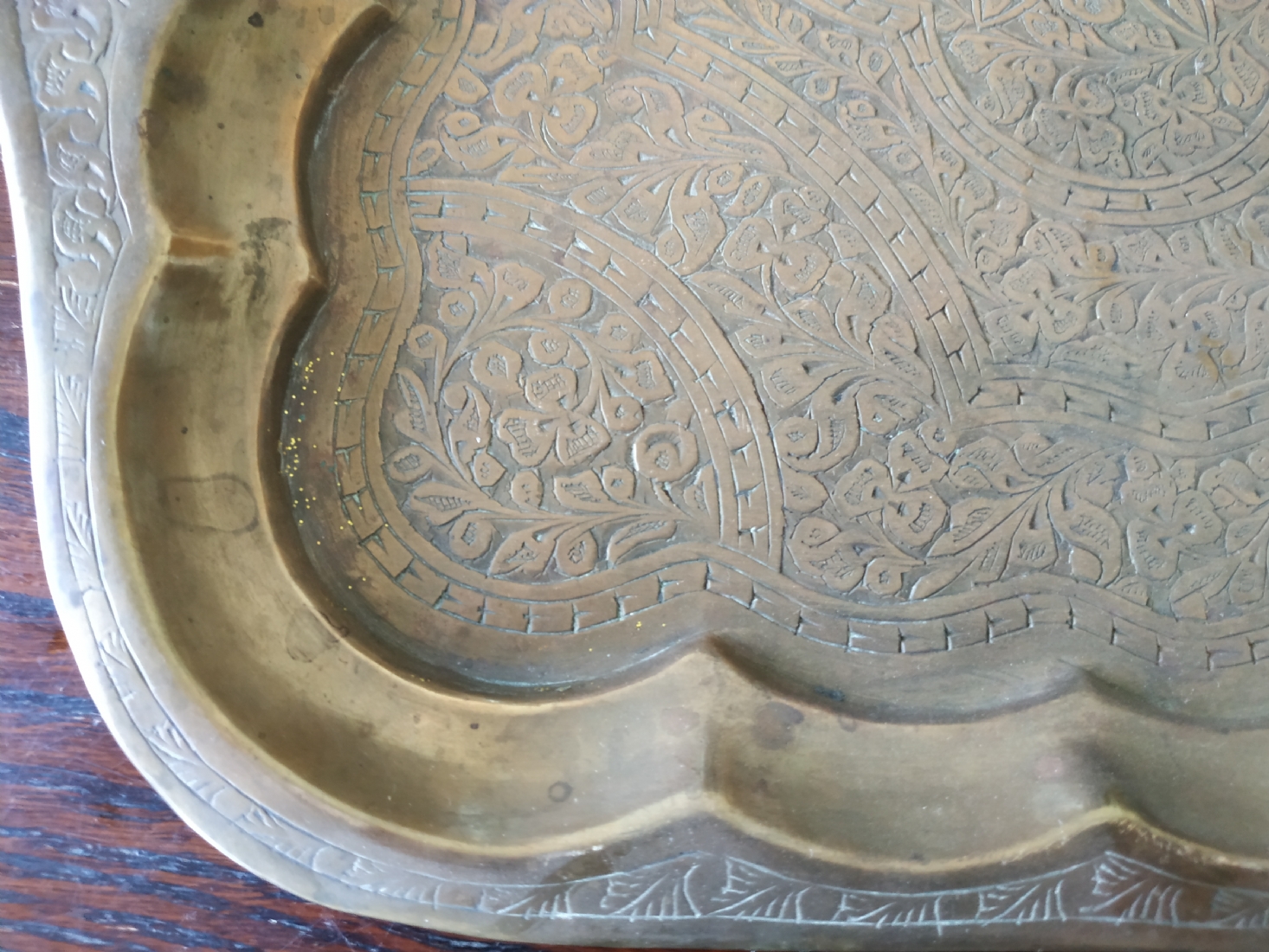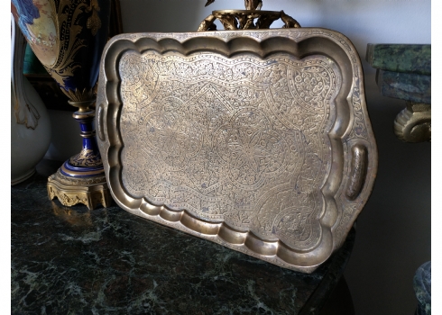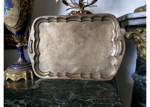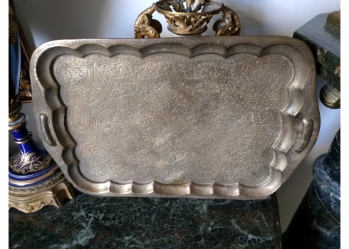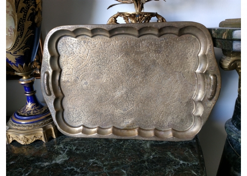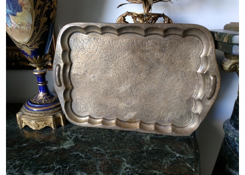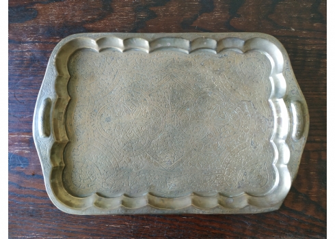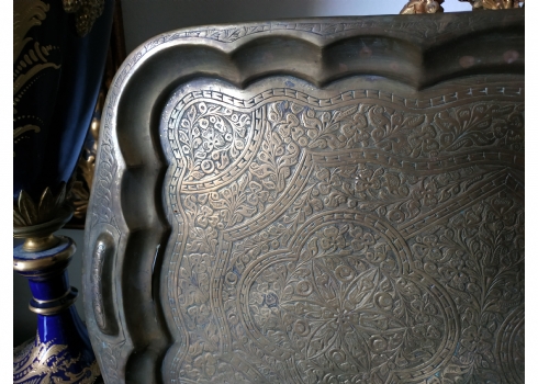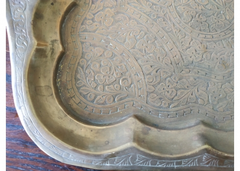 מגש הודי ישן, עשוי פליז מרוקע בעבודת יד אמן, מידות: 30X45 ס"מ.
