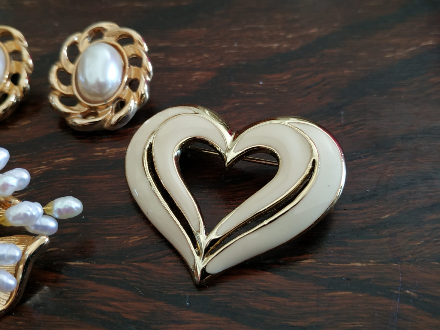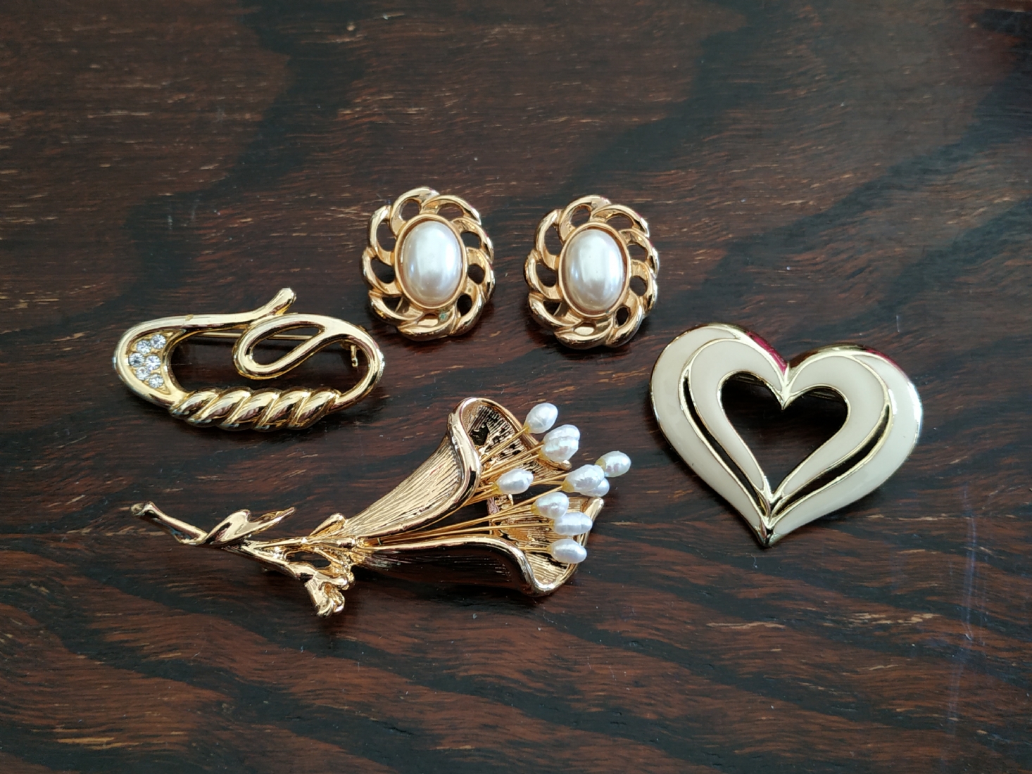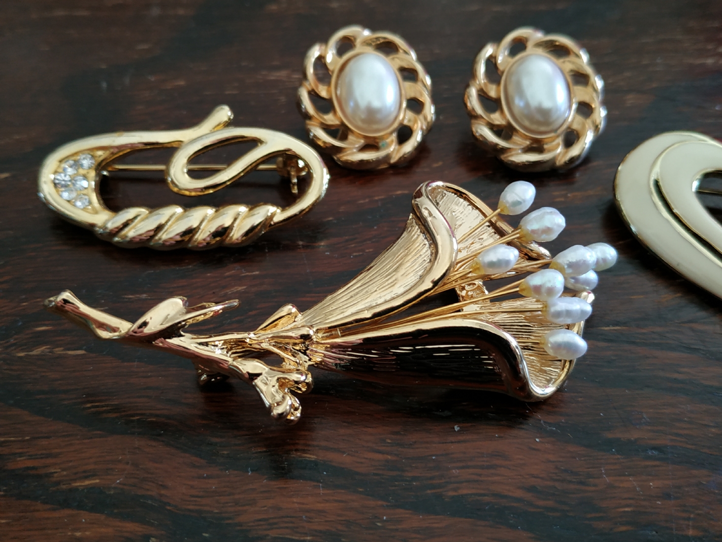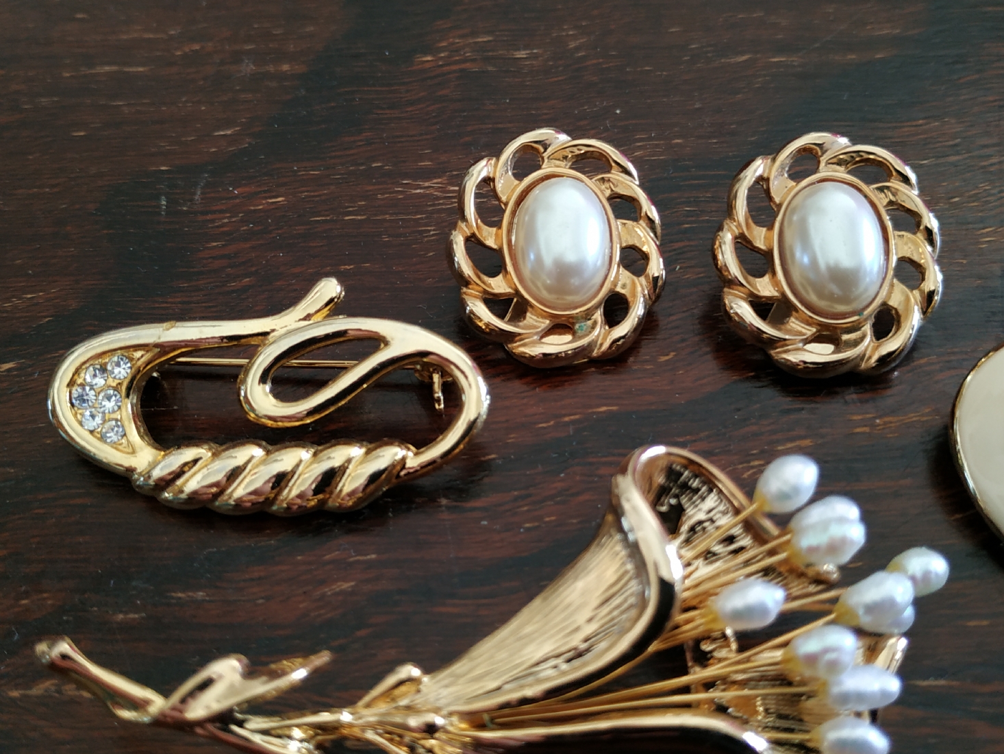 לוט של ארבעה תכשיטי אופנה שונים מוזהבים, הסיכה הגדולה משובצת פנינים