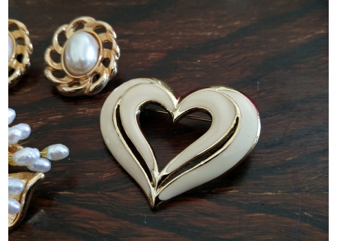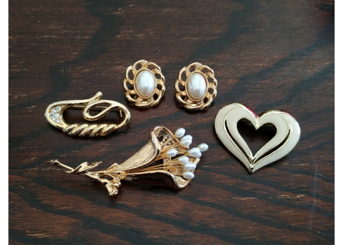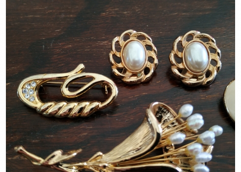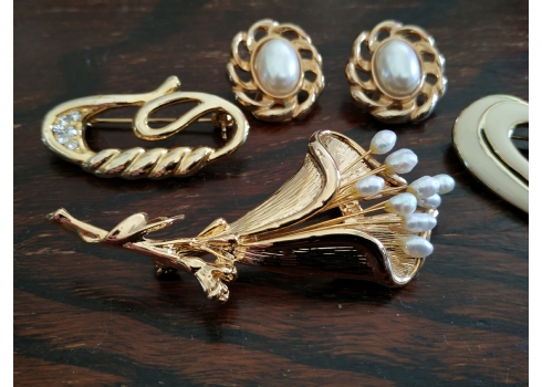 מספר הפריט בקטלוג 110לוט של ארבעה תכשיטי אופנה שונים מוזהבים, הסיכה הגדולה משובצת פנינים, אורך הסיכה הגדולה: 7.5 ס"מ.