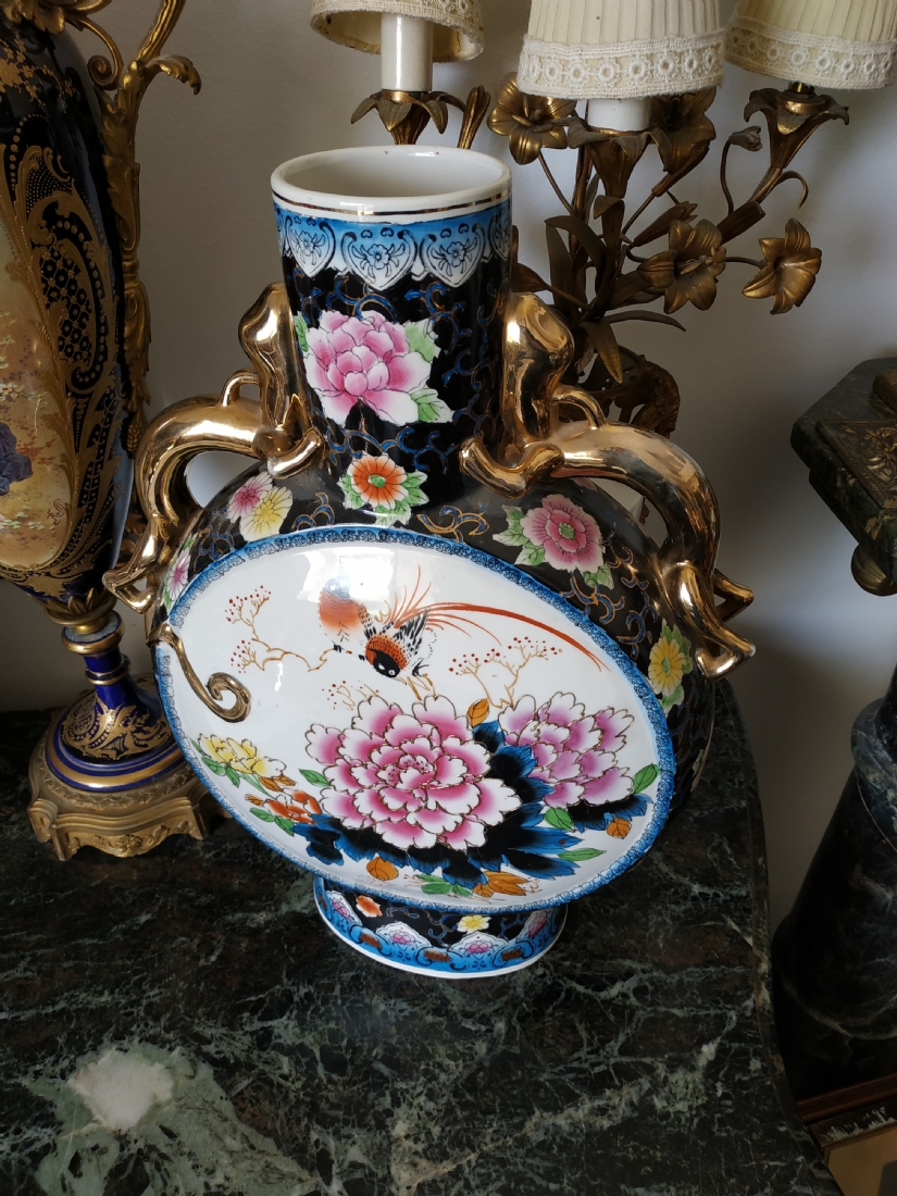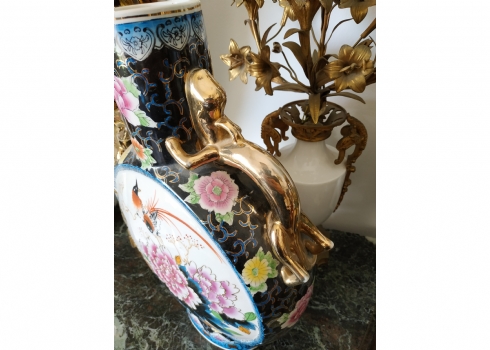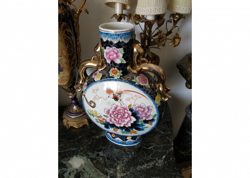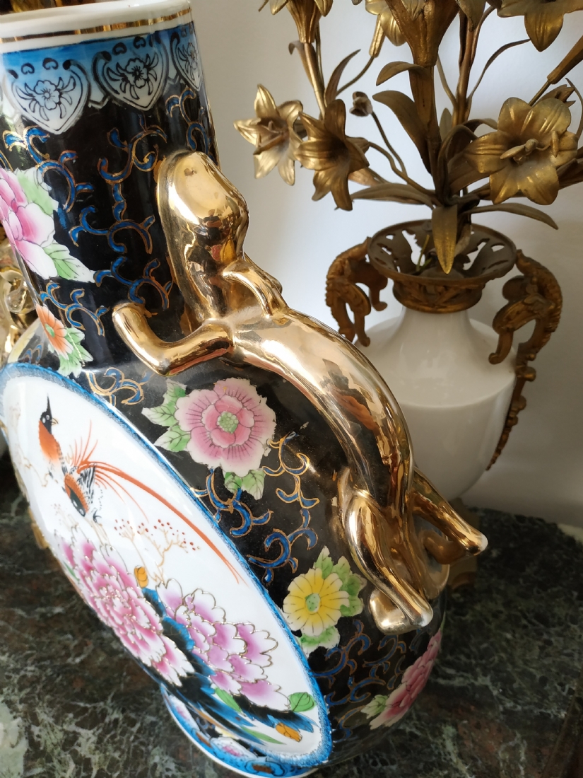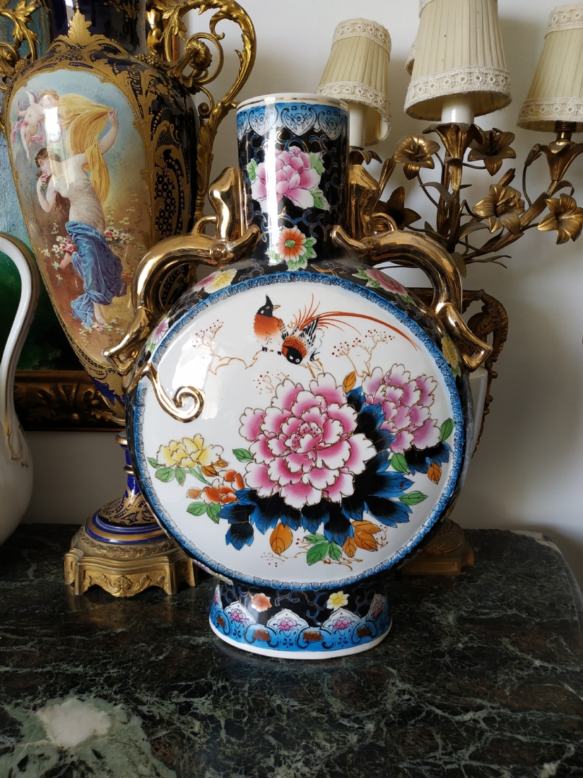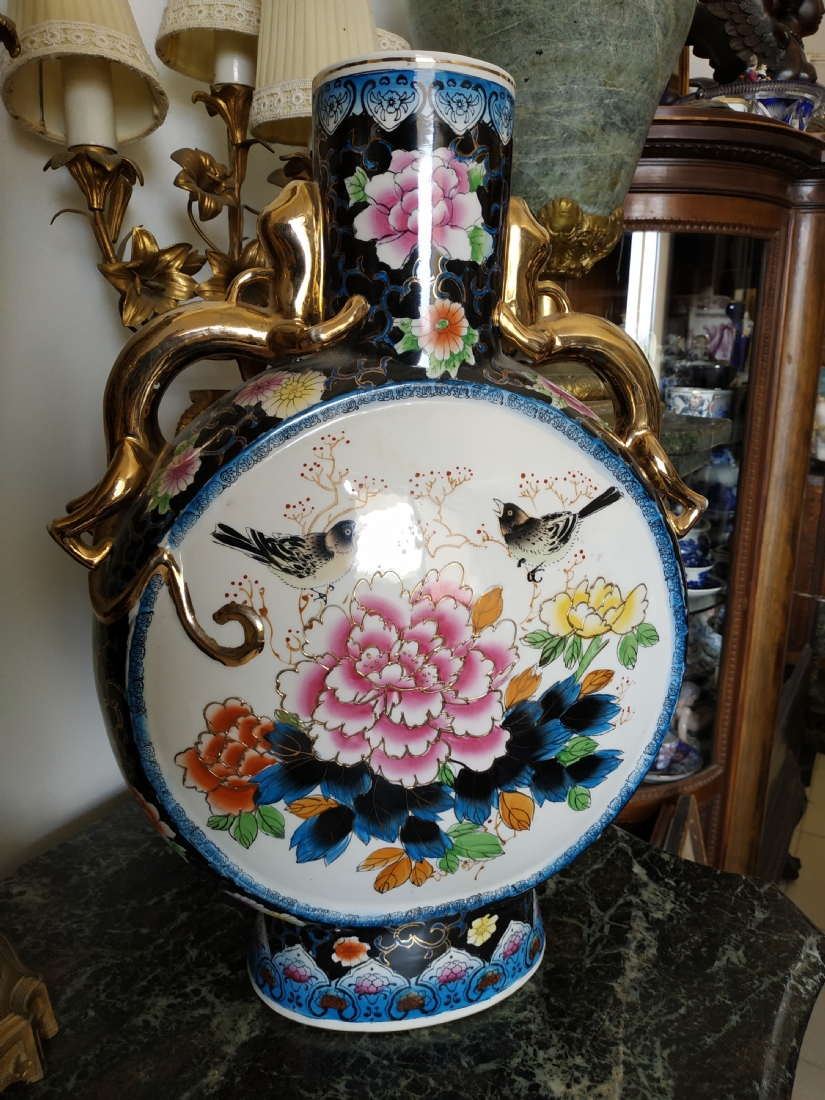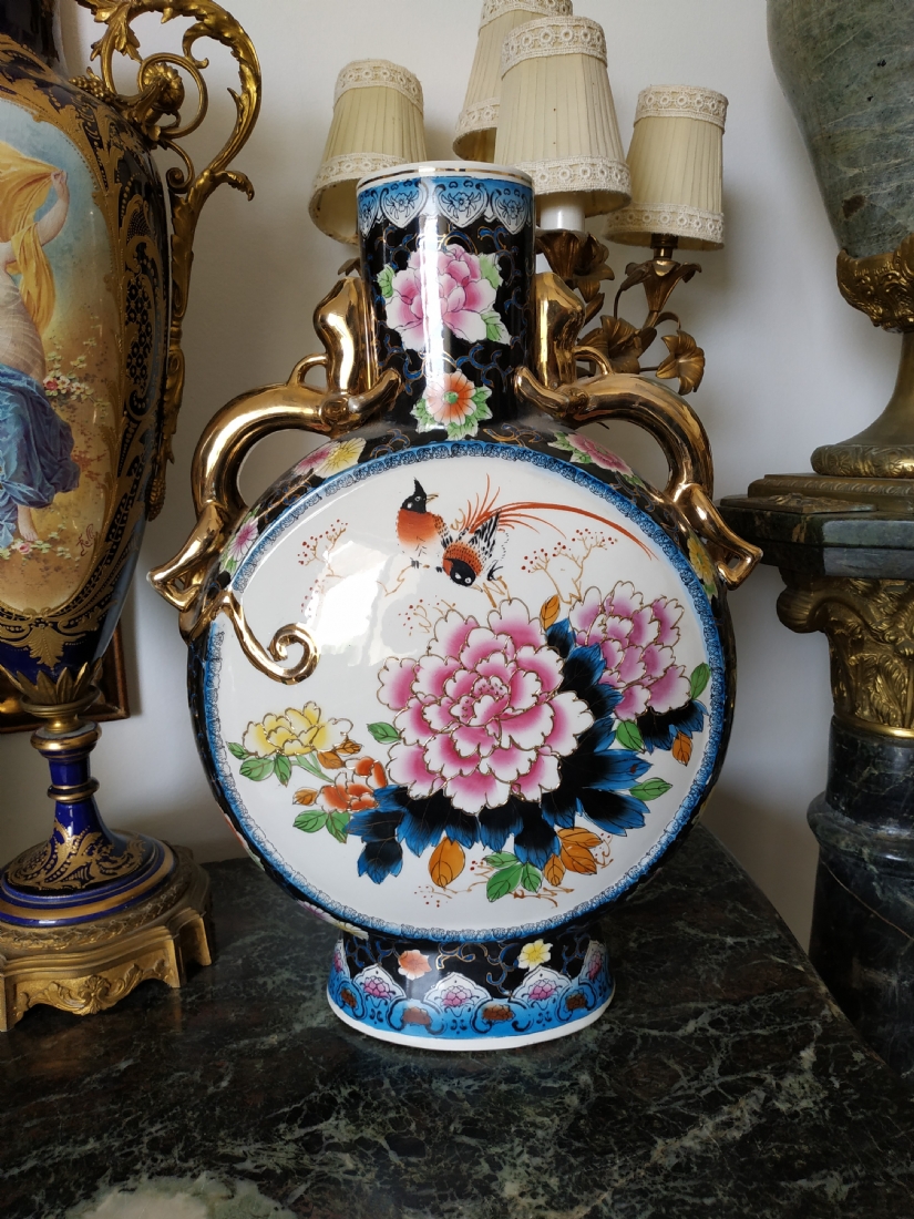 אגרטל סיני גדול מיימדים, בצורת פלאסק מעוטר באמייל ובזהב, גובה: 47 ס"מ.