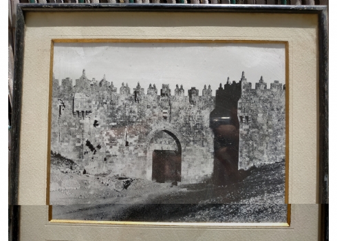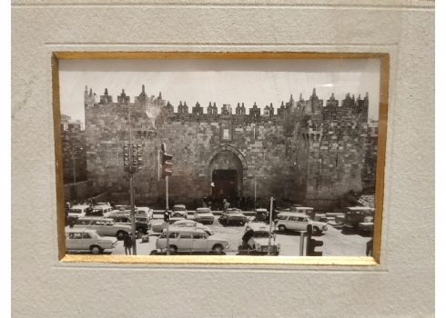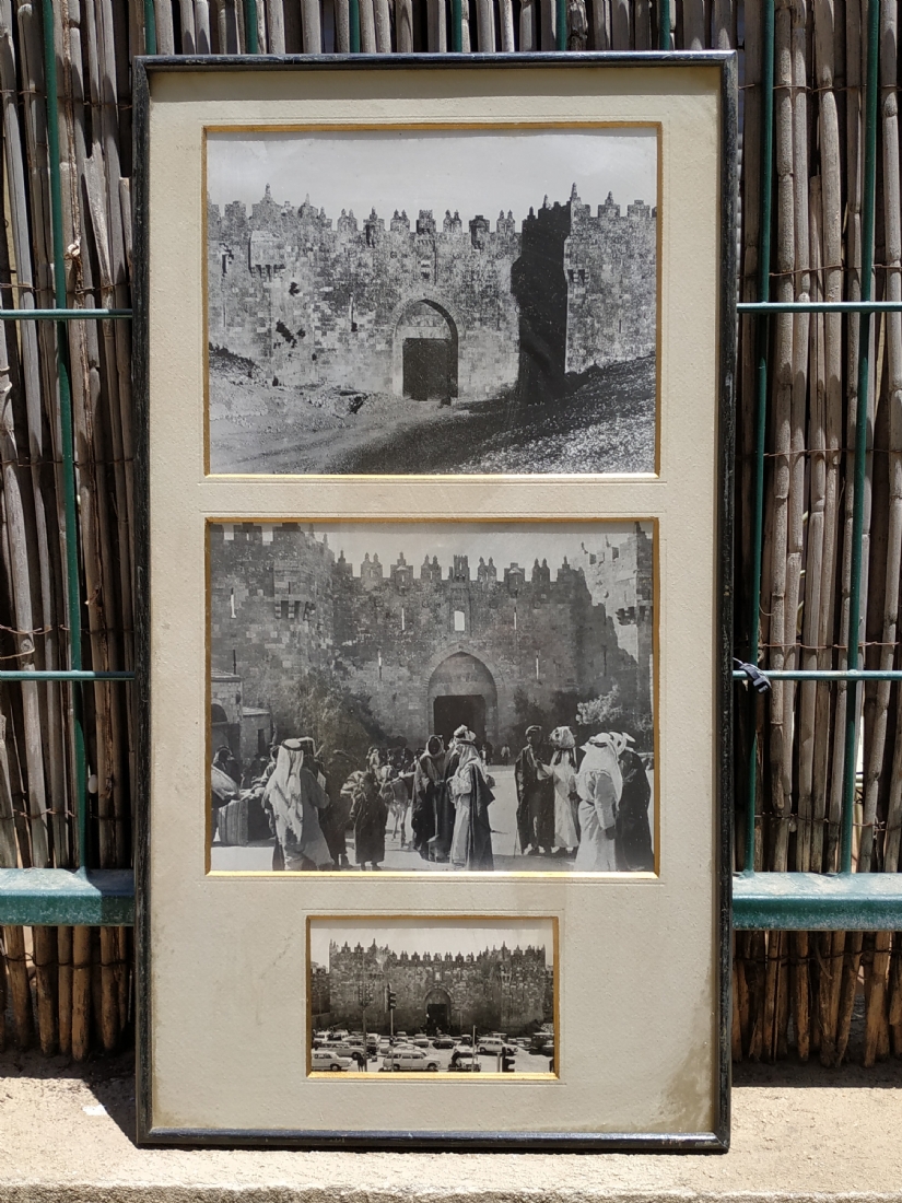 לאספנים - שלושה צילומים ישנים של שער שכם בירושלים (צילום של שער שכם בסוף המאה ה-19, בתחילת המאה העשרים וחקראת השליש האחרון של המאה העשרים), ממוסגרים יחדיו במסגרת אחת, מידות המסגרת: 57X31 ס"מ.