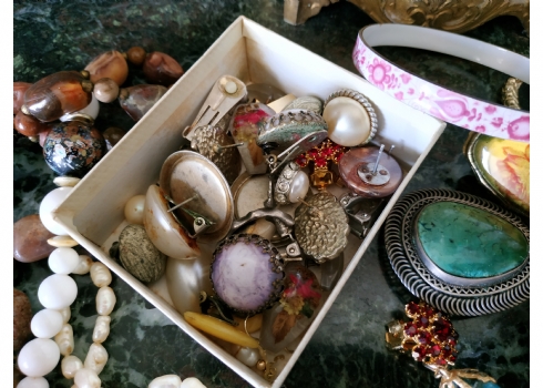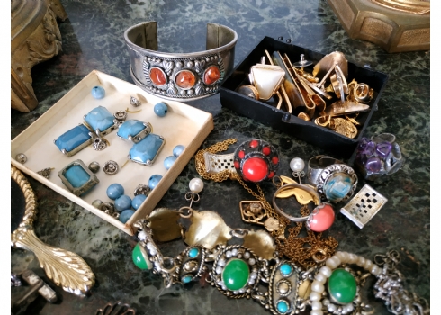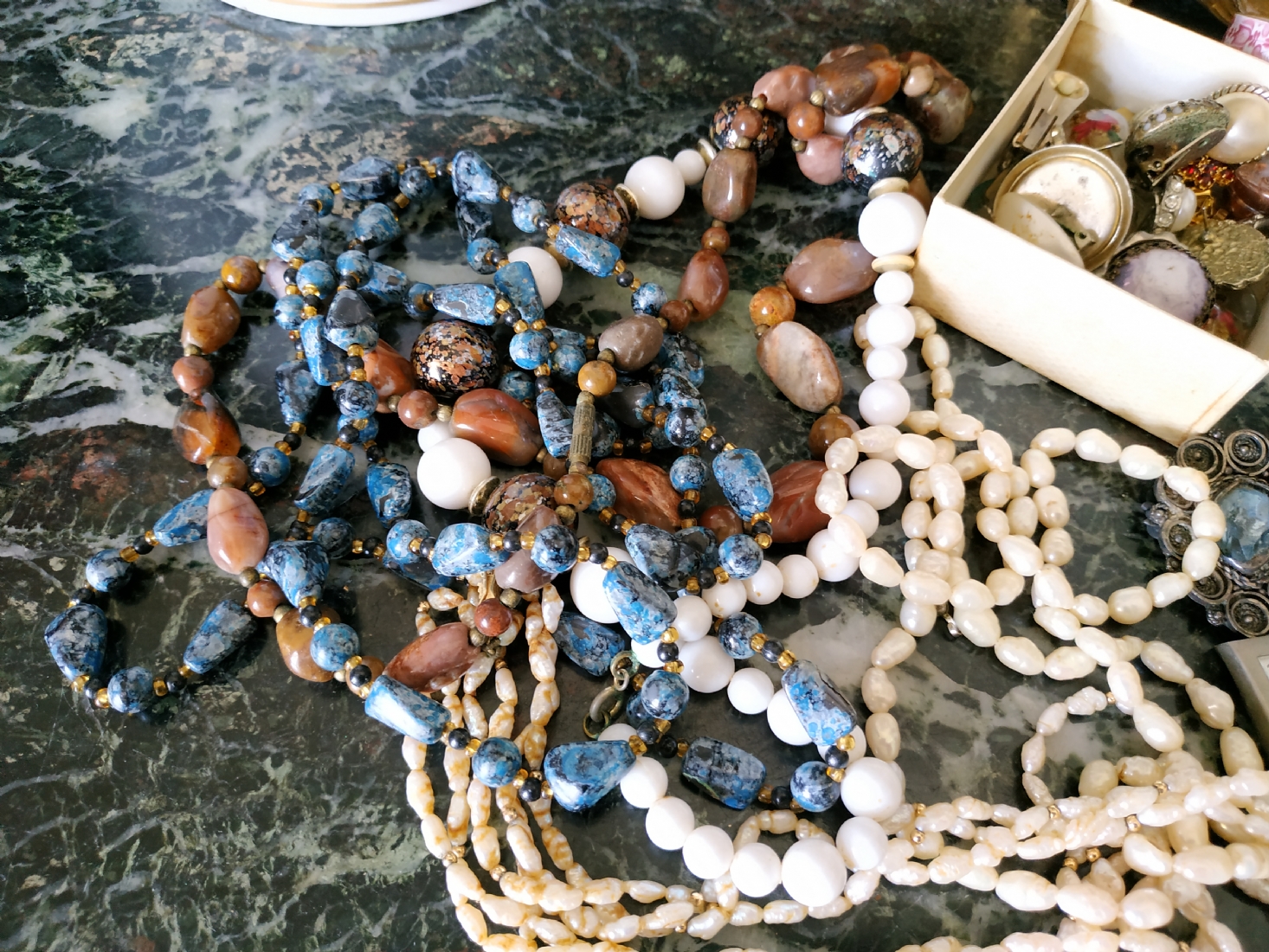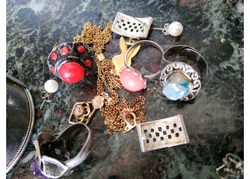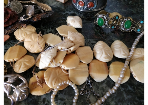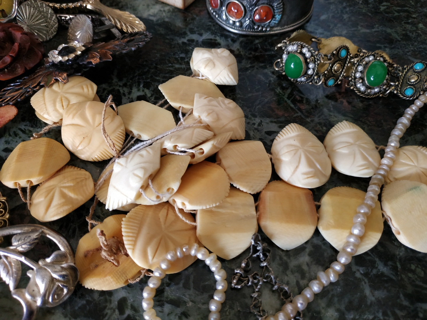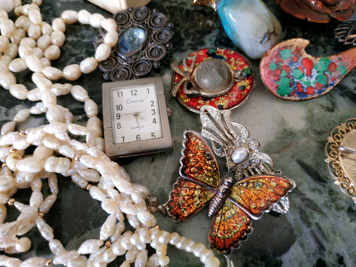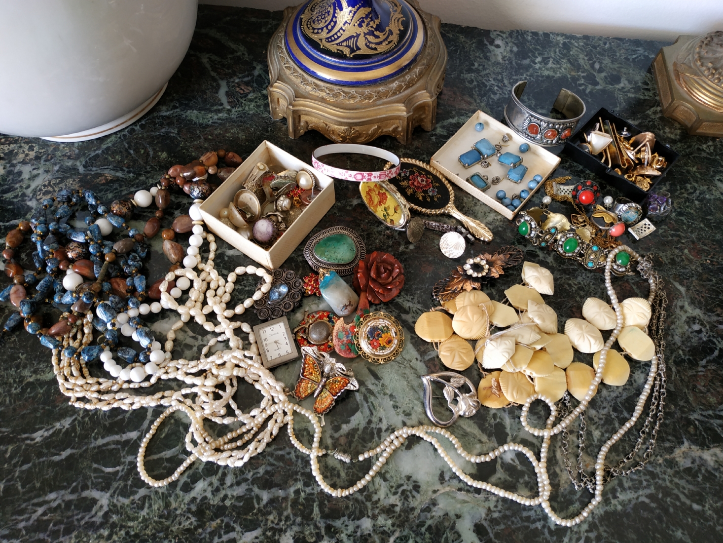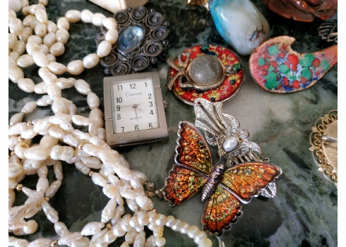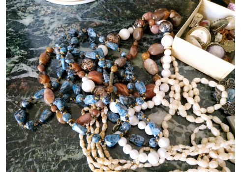 לוט של תכשיטי אופנה ישנים שונים, לרבות מחרוזות פנינים, שעון יד ללא רצועה וחרוזי שנהב, יד שניה / משומש.
