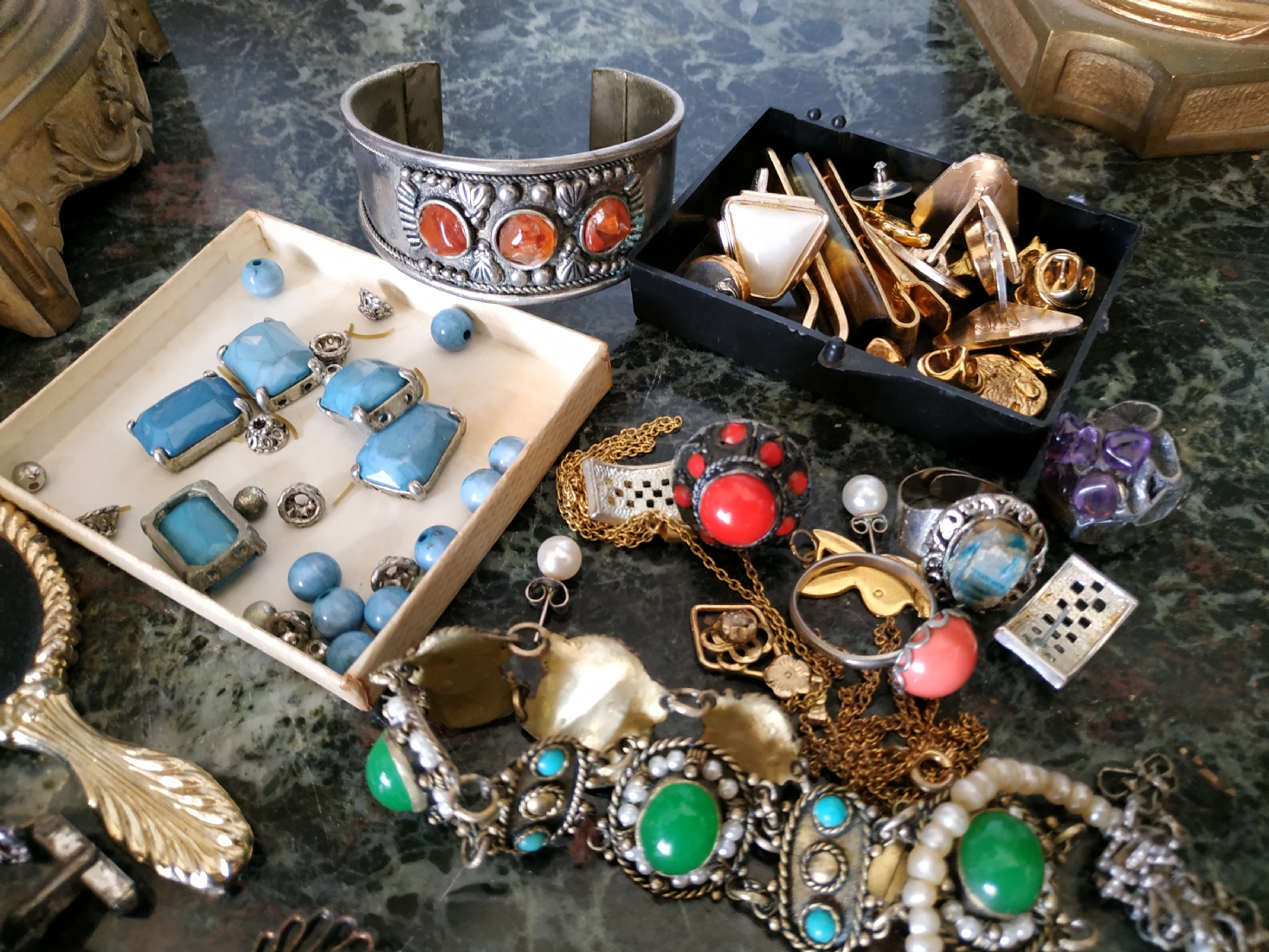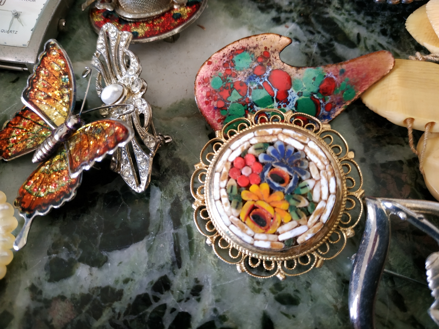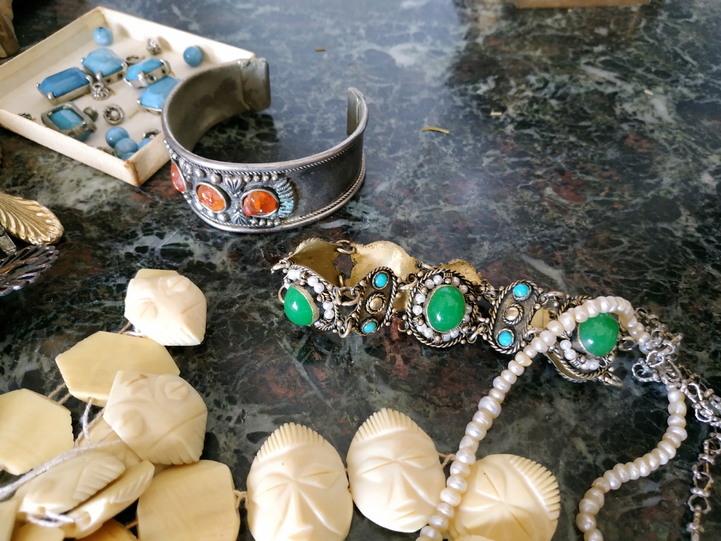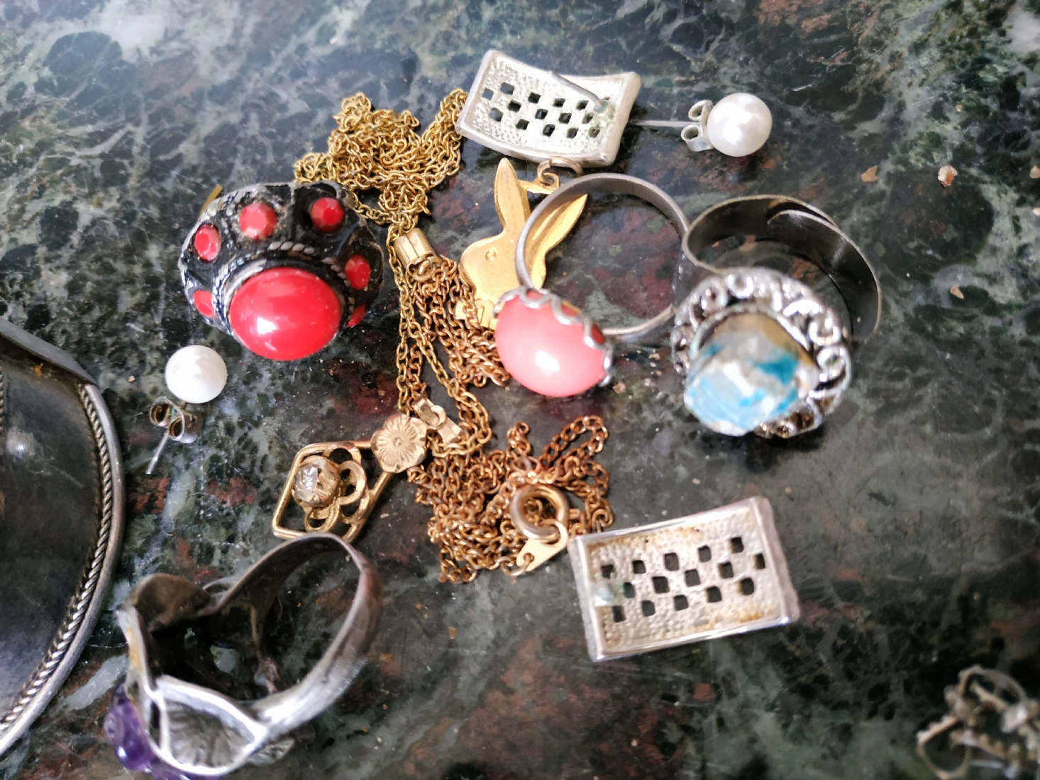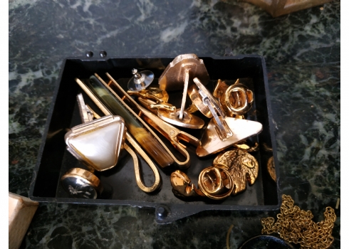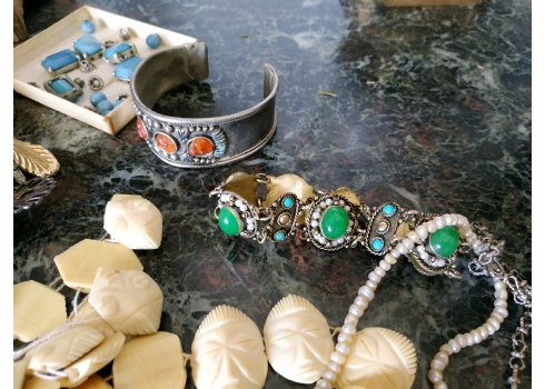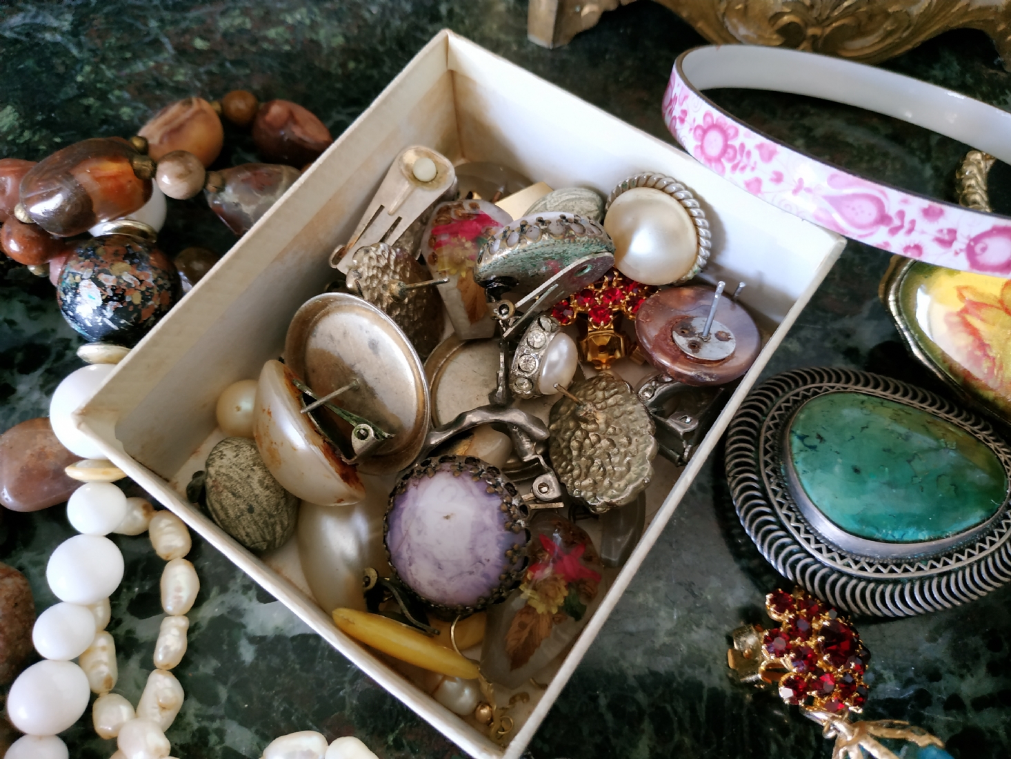 לוט של תכשיטי אופנה ישנים שונים, לרבות מחרוזות פנינים, שעון יד ללא רצועה וחרוזי שנהב, יד שניה / משומש.