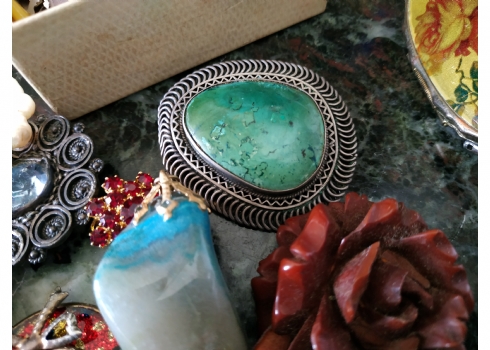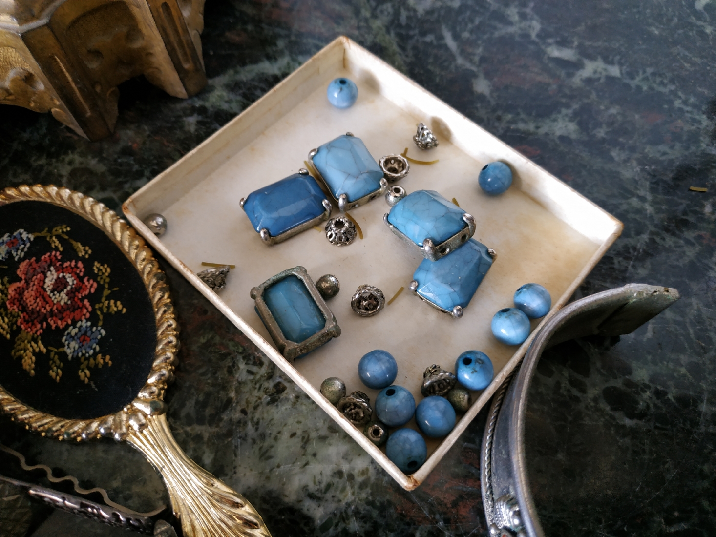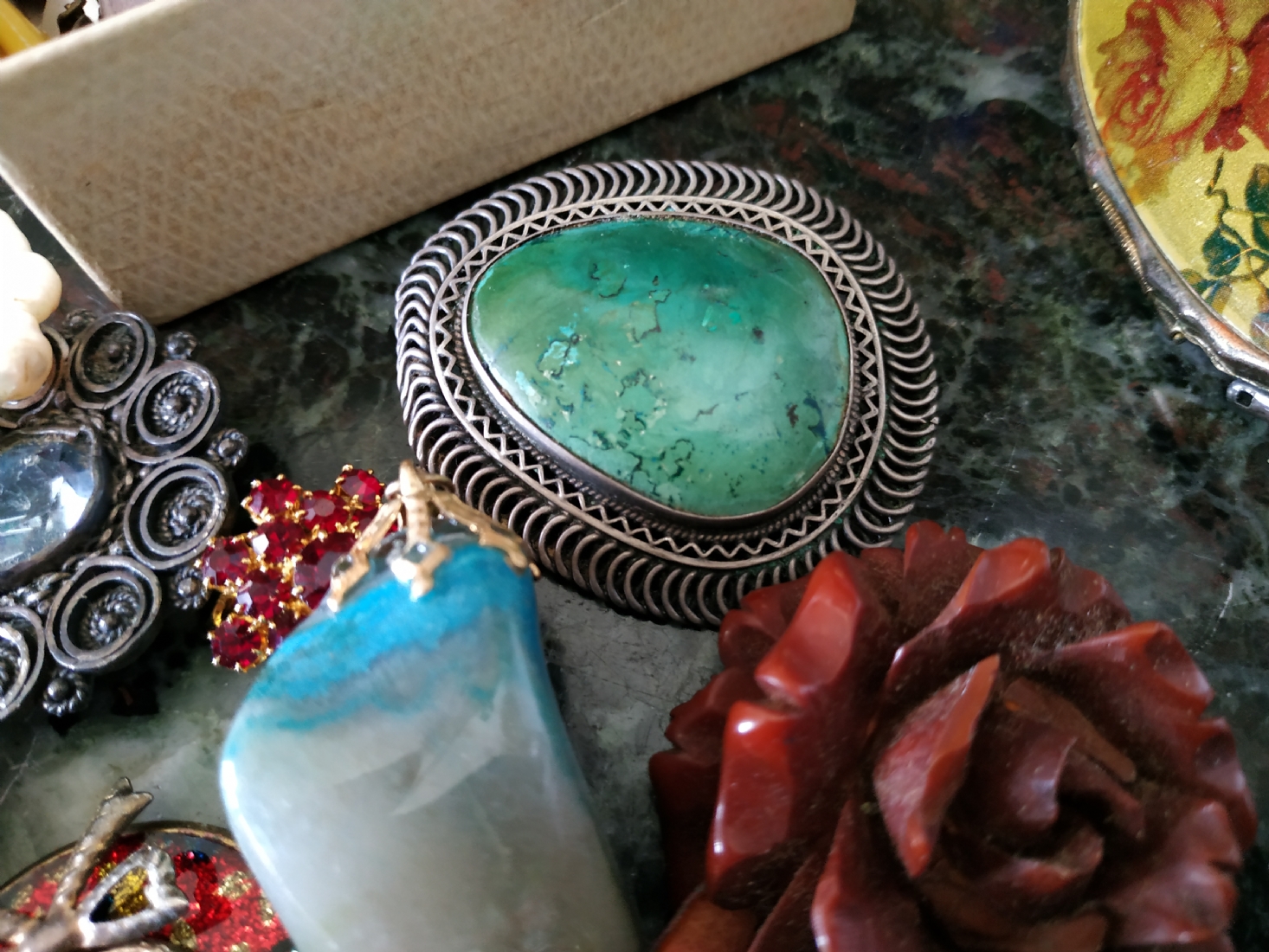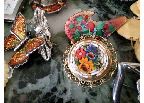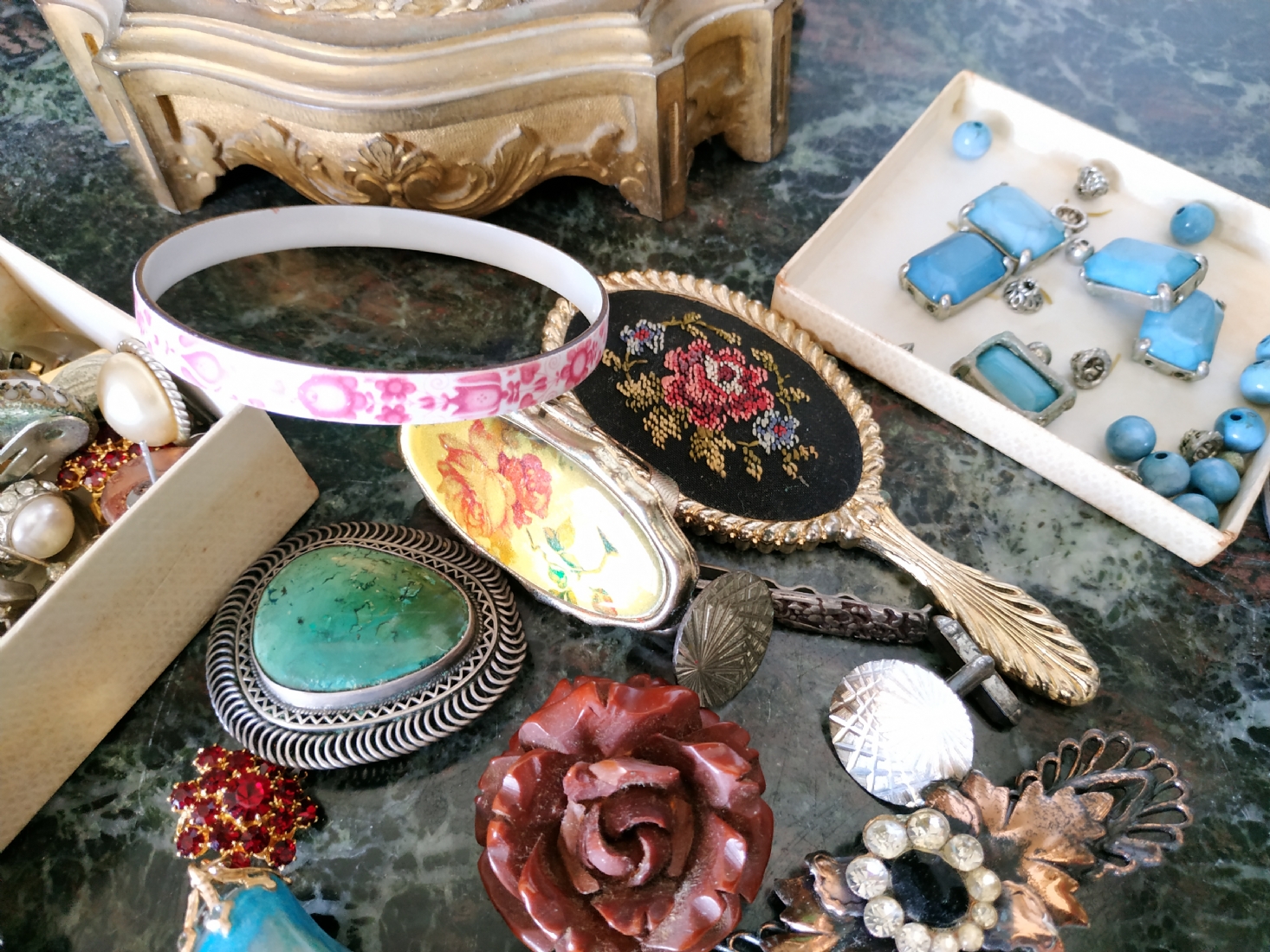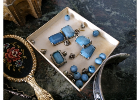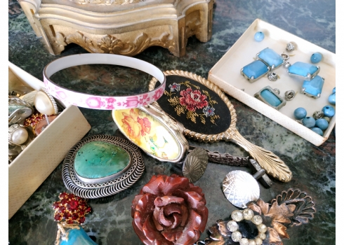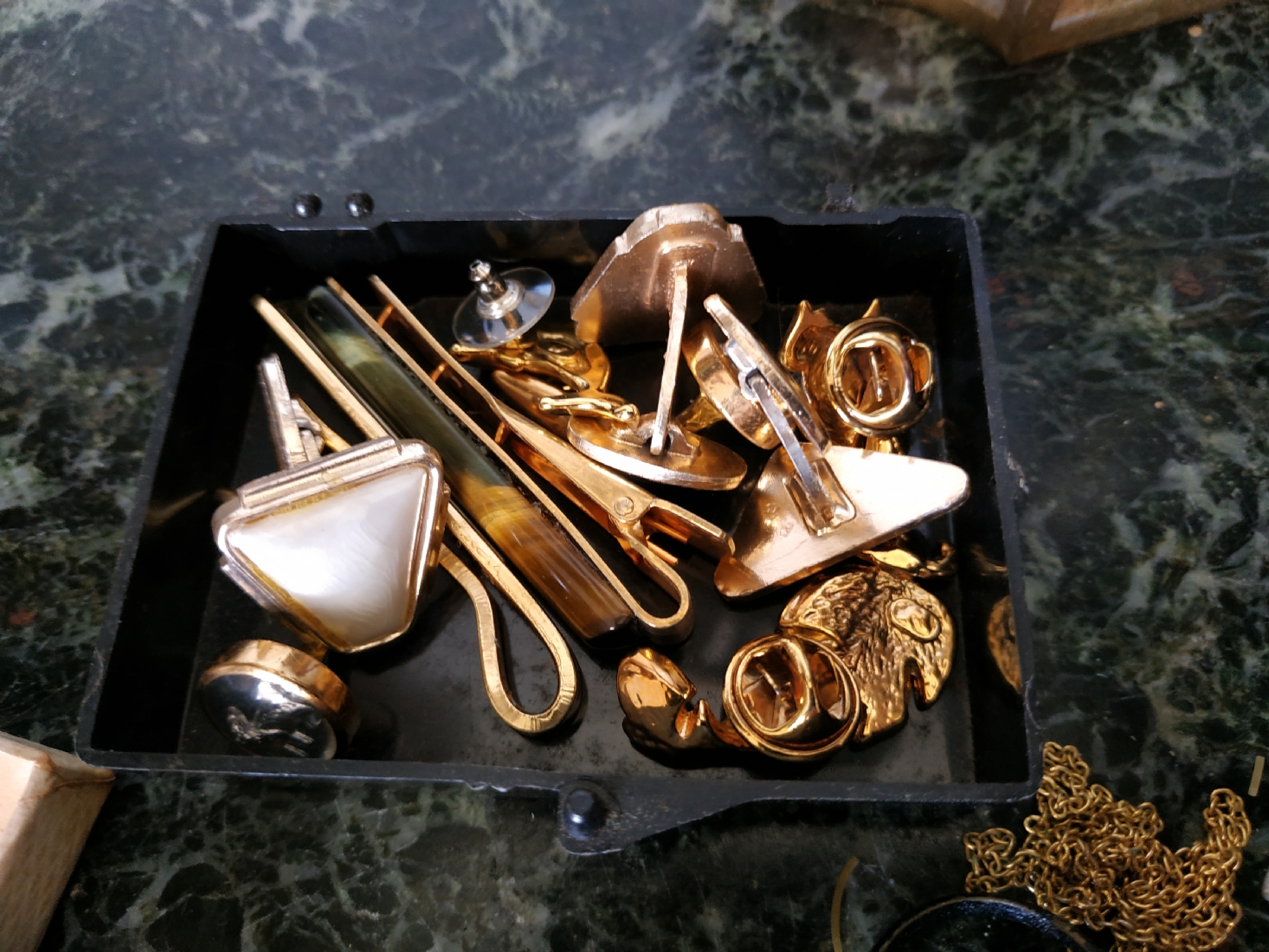 לוט של תכשיטי אופנה ישנים שונים, לרבות מחרוזות פנינים, שעון יד ללא רצועה וחרוזי שנהב, יד שניה / משומש.