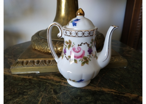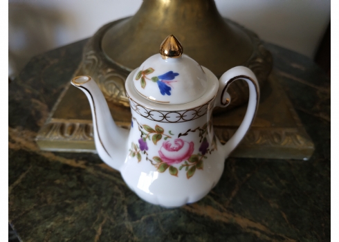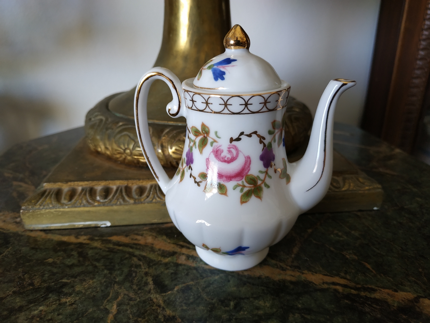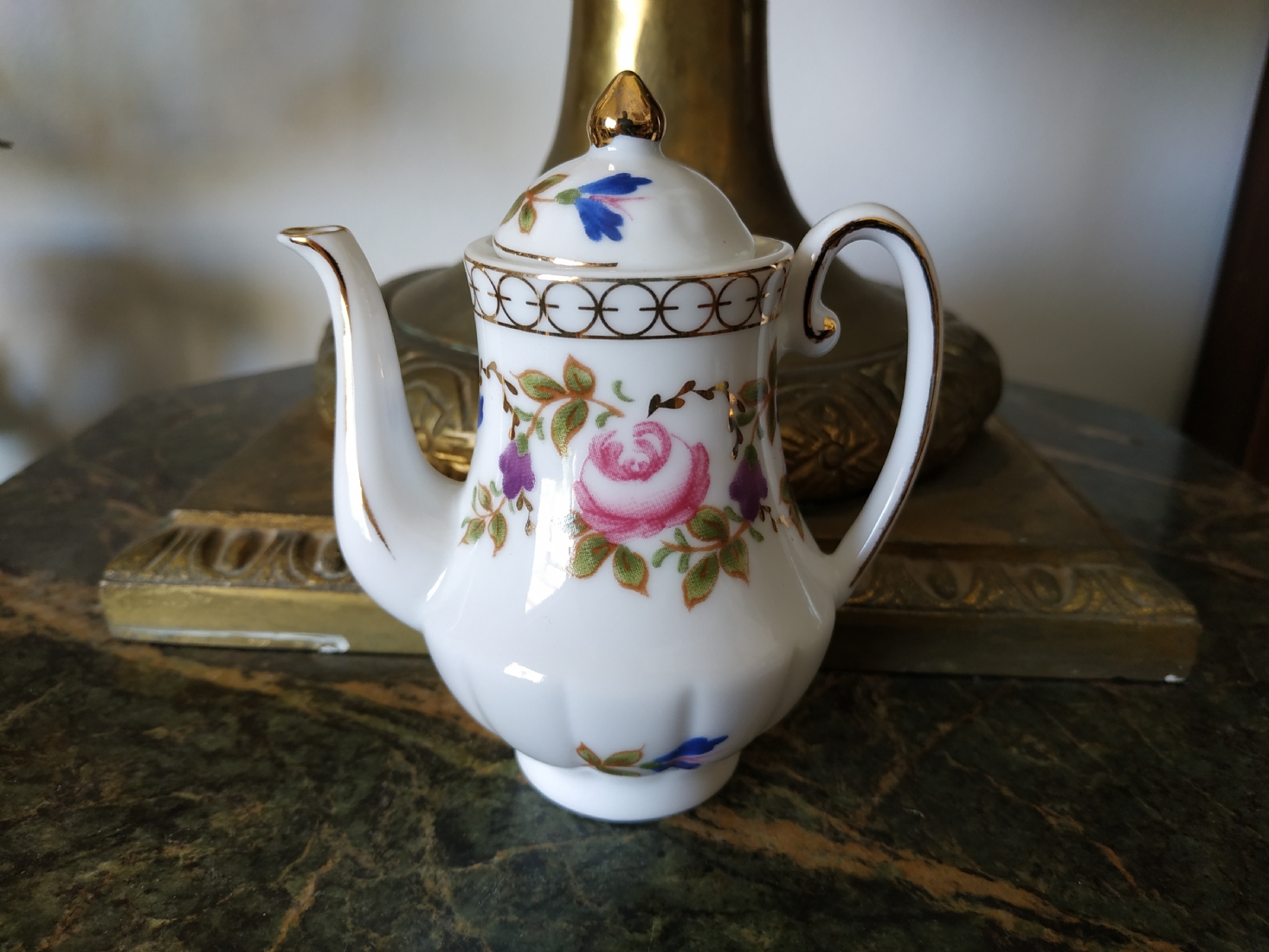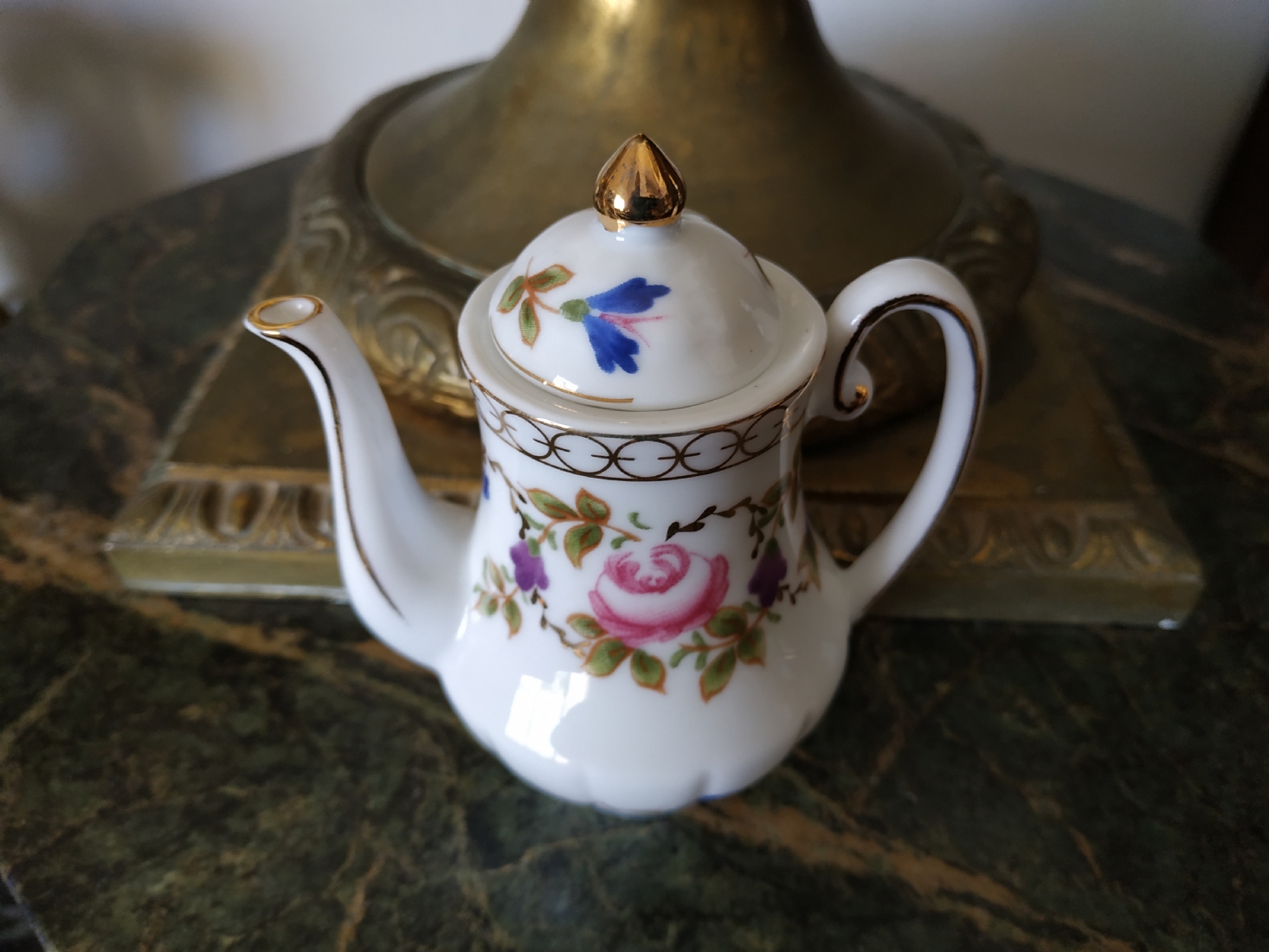 קנקן פורצלן מניאטורי ומכסה תואם, מעוטר באמייל