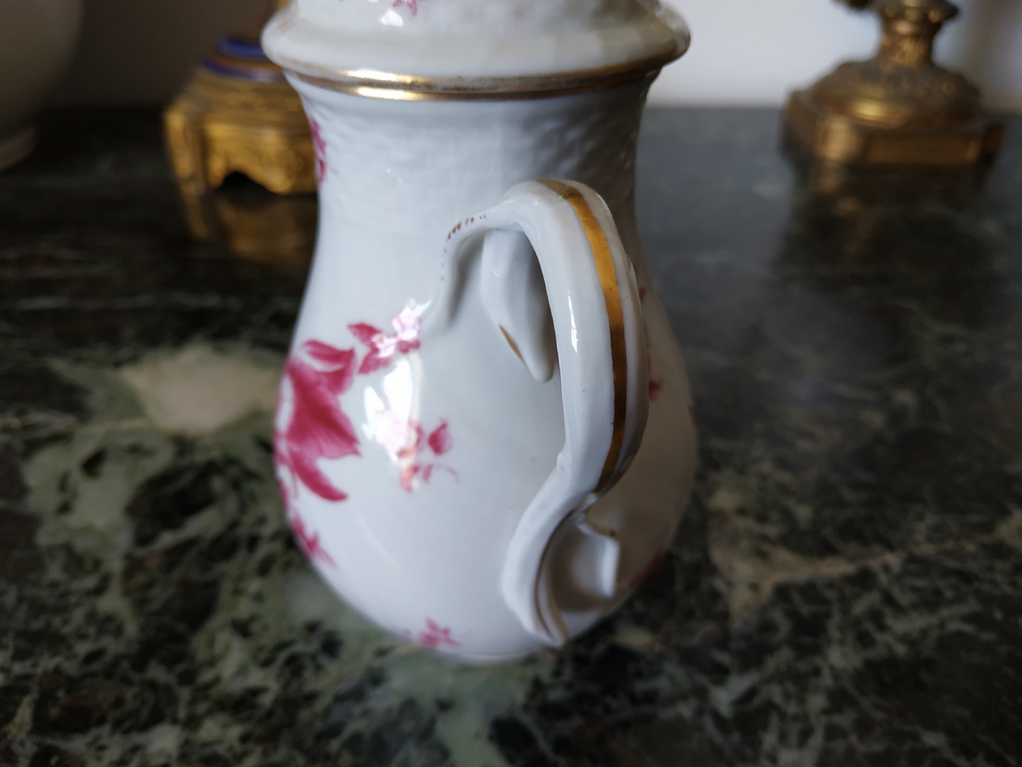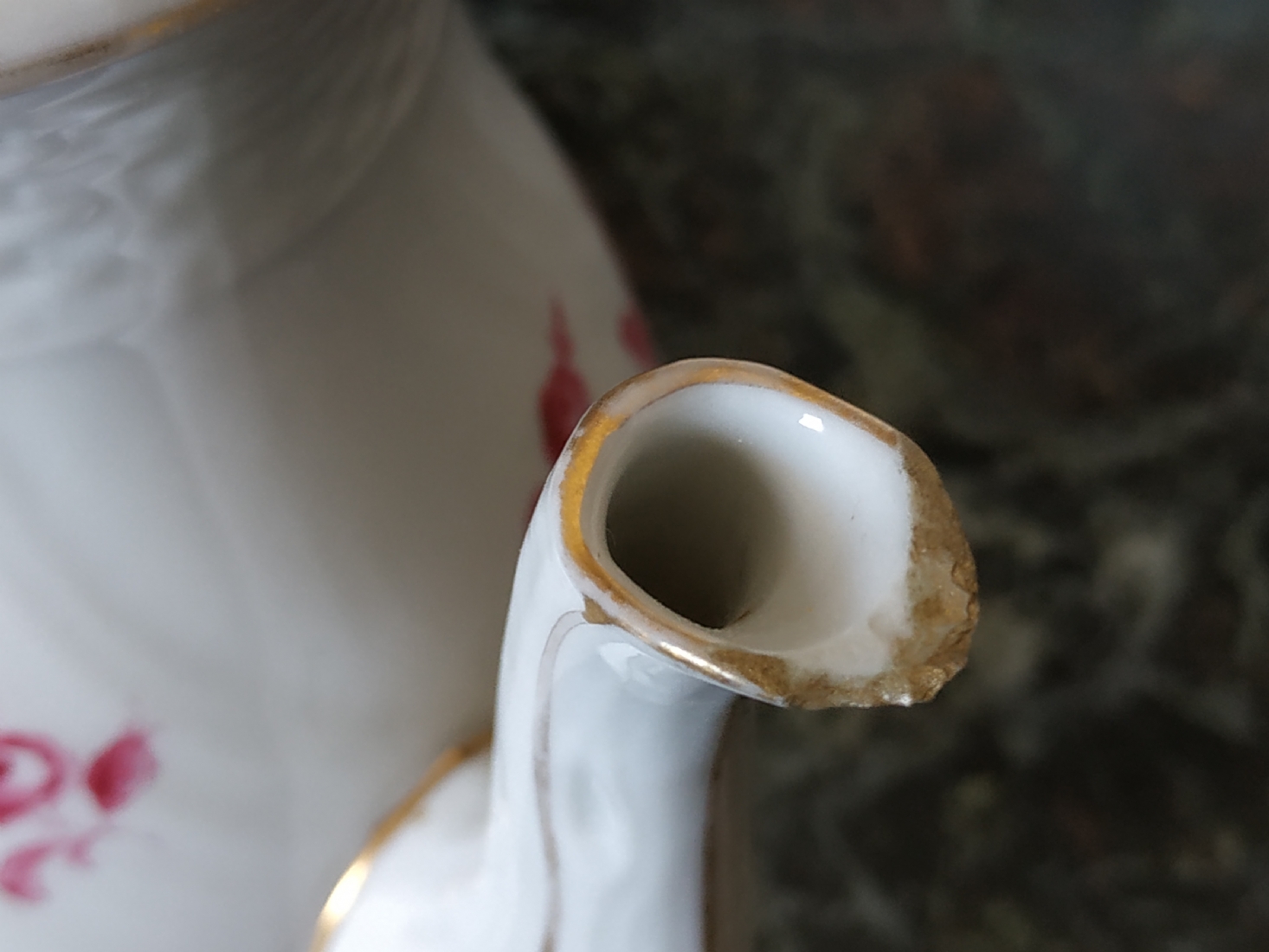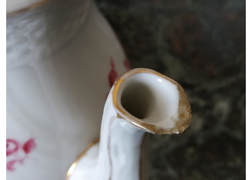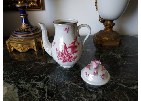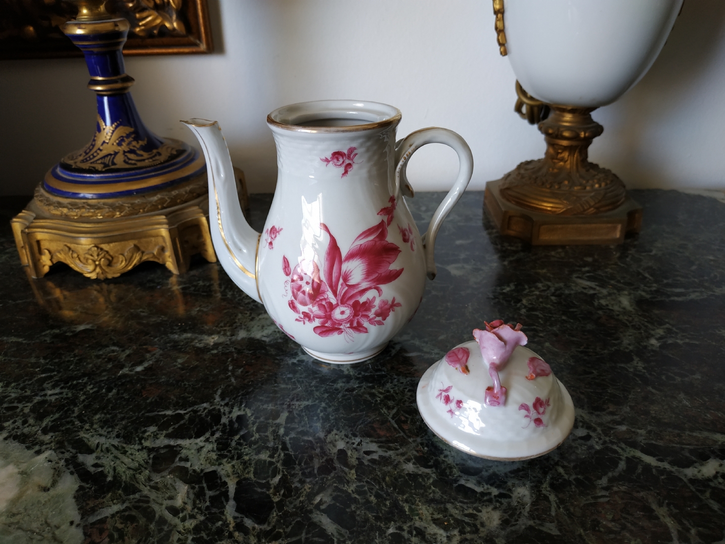 קנקן פורצלן הונגרי איכותי ויפה מתוצרת: 'הרנד' (Herend) ומכסה תואם, מעוטרים ציורי יד באמייל ובזהב, צ'יפ קטן לקצה הזרבובית (מצולם בתקריב), חתום, גובה: 17.5 ס"מ.